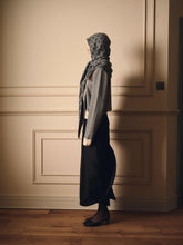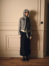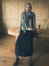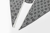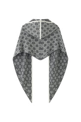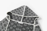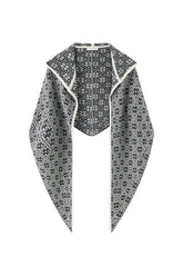 The scarf bonnet features a black-and-white knit design with snowflake patterns, giving it a cozy and wintery look. The contrasting color palette enhances the fine details of the pattern...