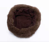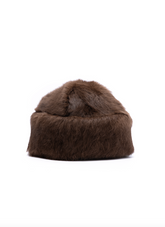 This bonnet is made from soft fur in a rich brown shade. The design features a slightly rounded top with a folded brim, giving it a snug and cozy look. The fur texture adds a luxurious a...