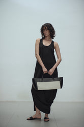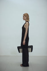 A sleek, long structured rectangular leather bag with a subtly embossed brand logo accented with elegant gold-foil lettering