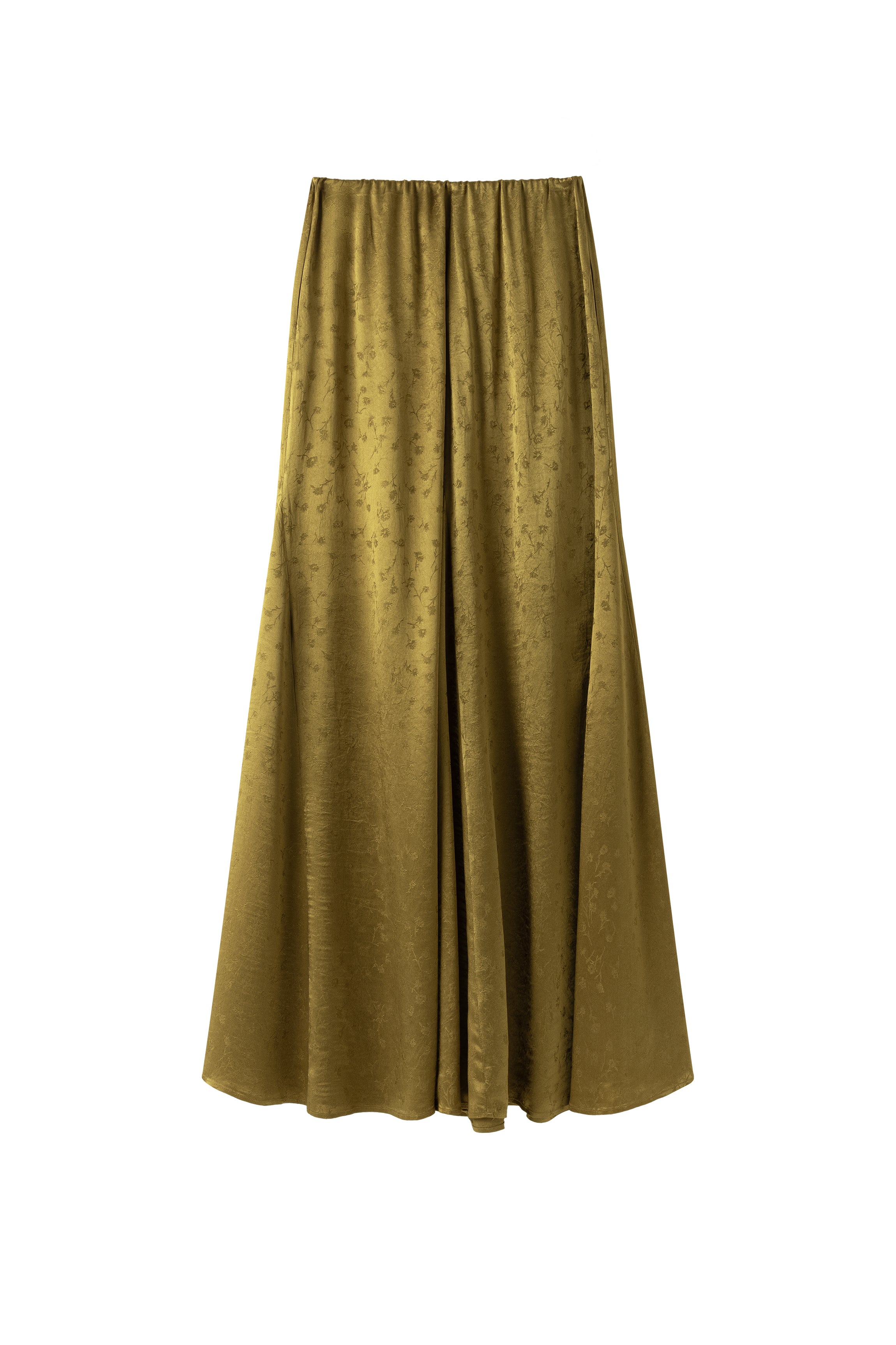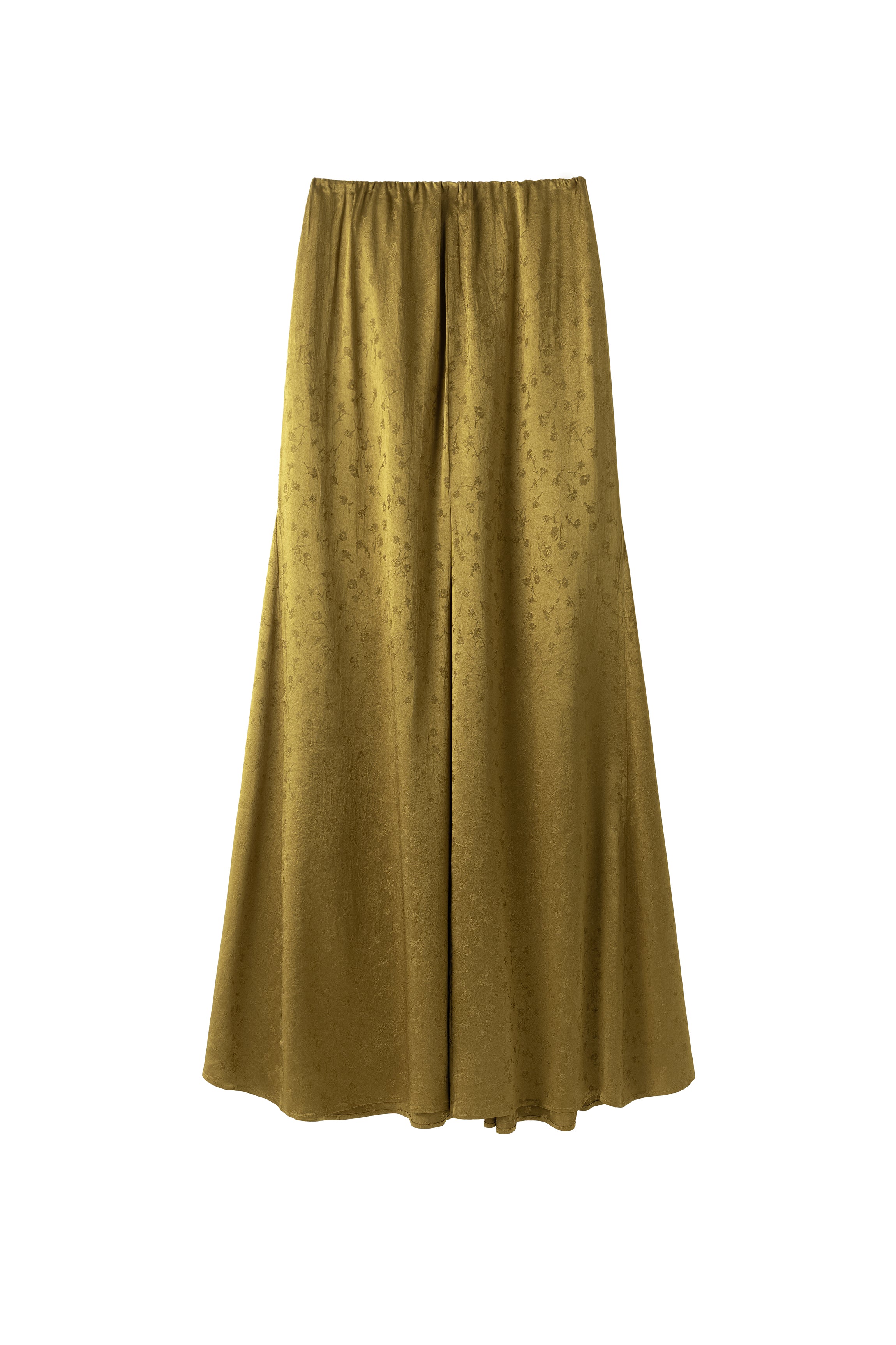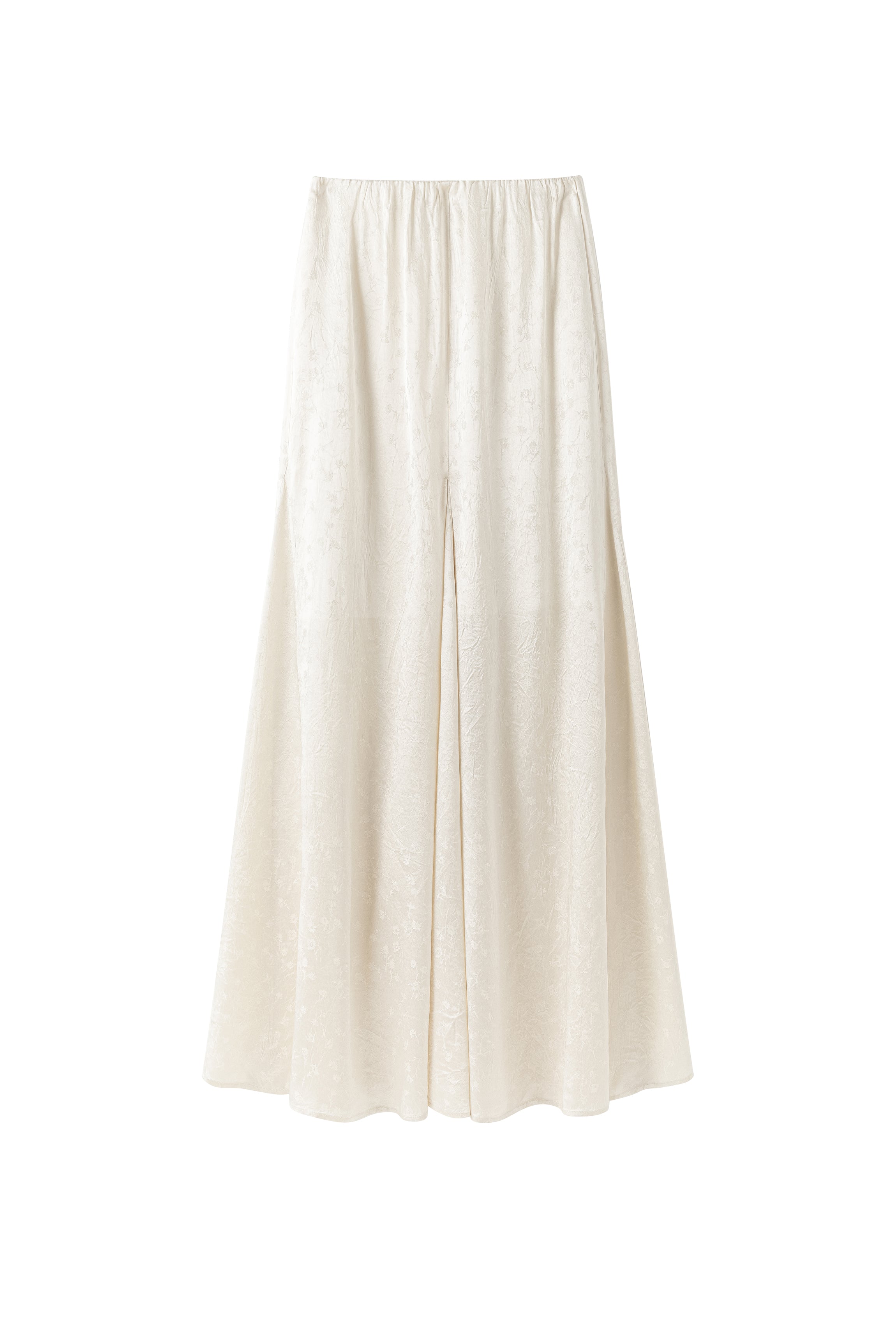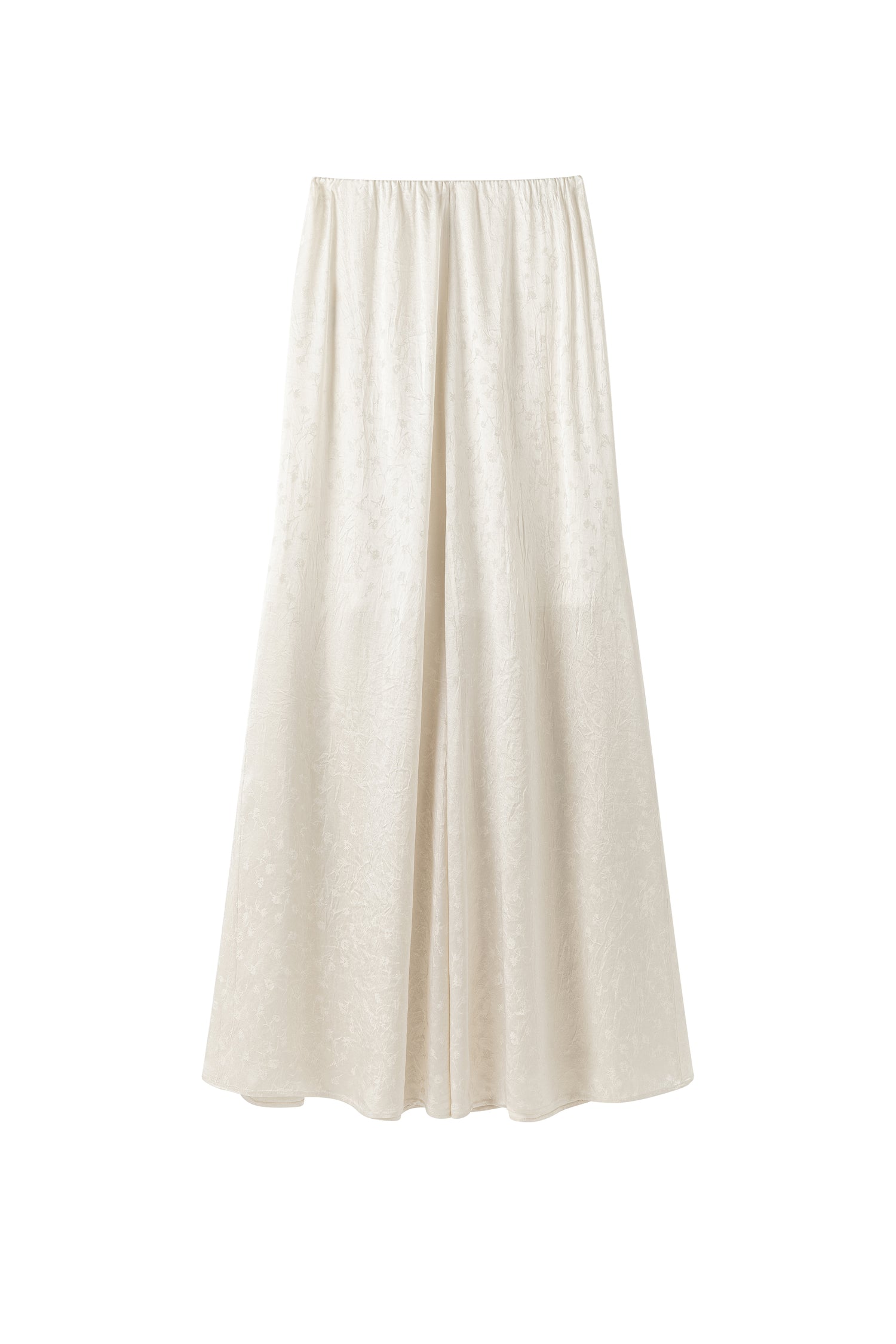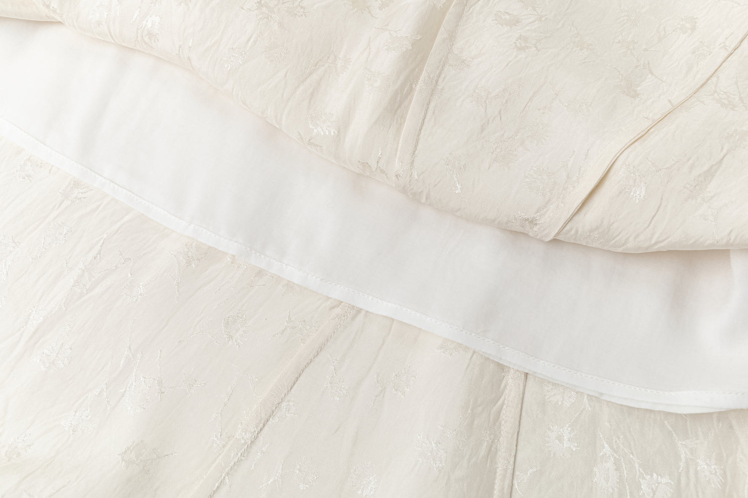 Matching long skirt designed to complement the halter-neck dress. Features a flowing, floor-length silhouette that drapes beautifully, echoing the diagonal cut and delicate floral motifs...