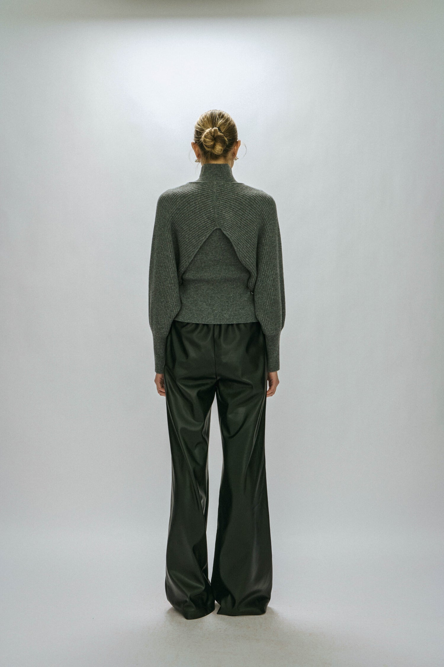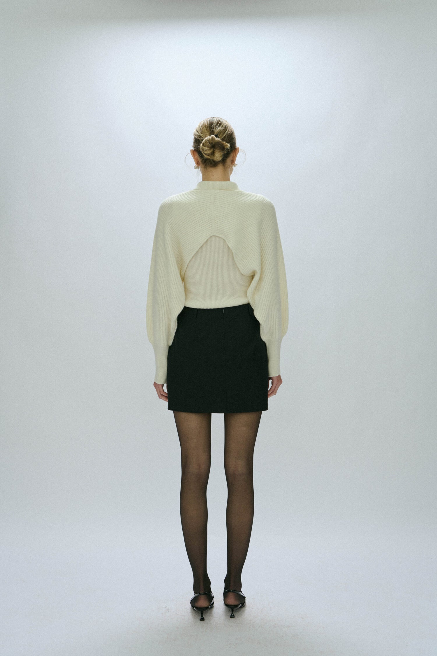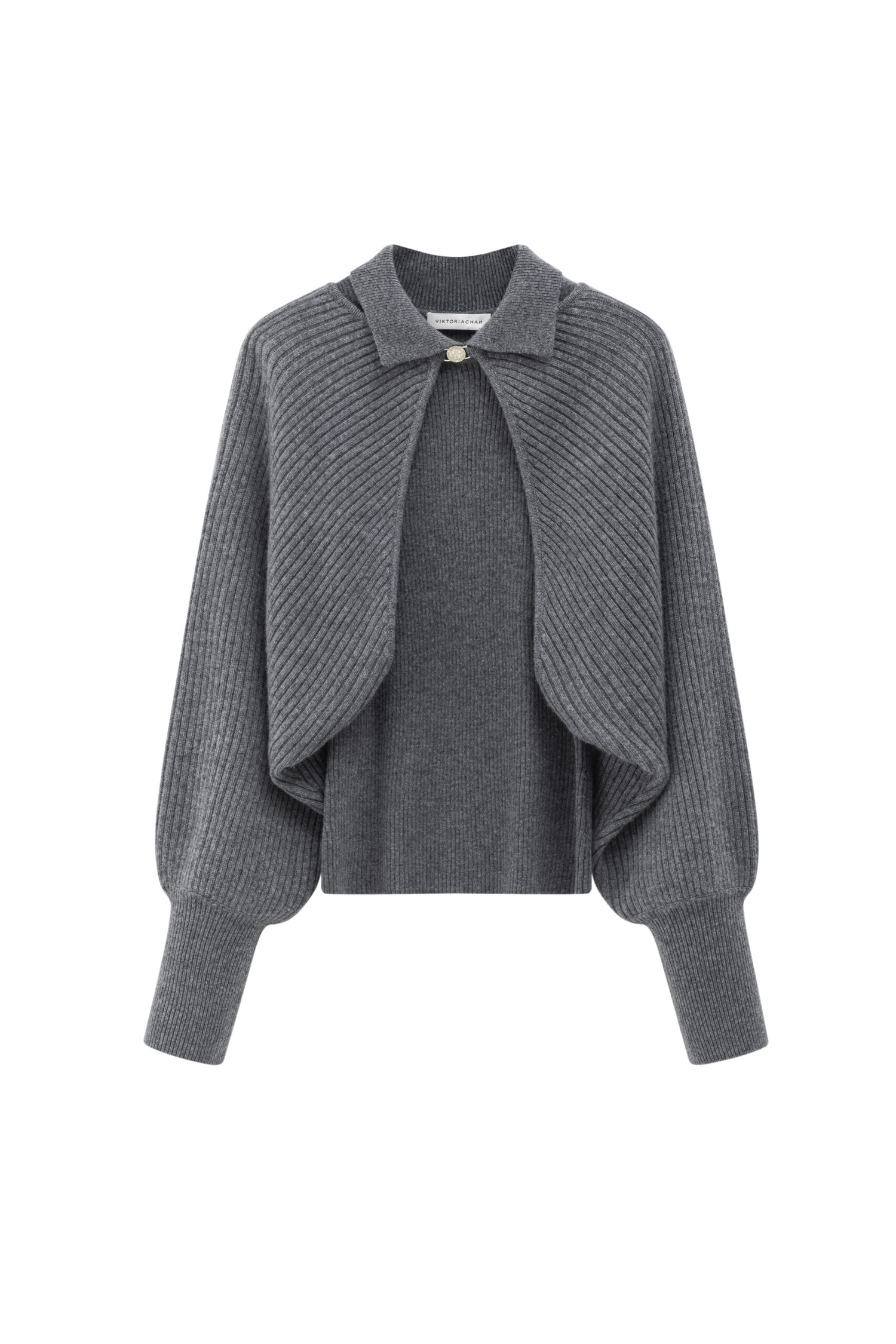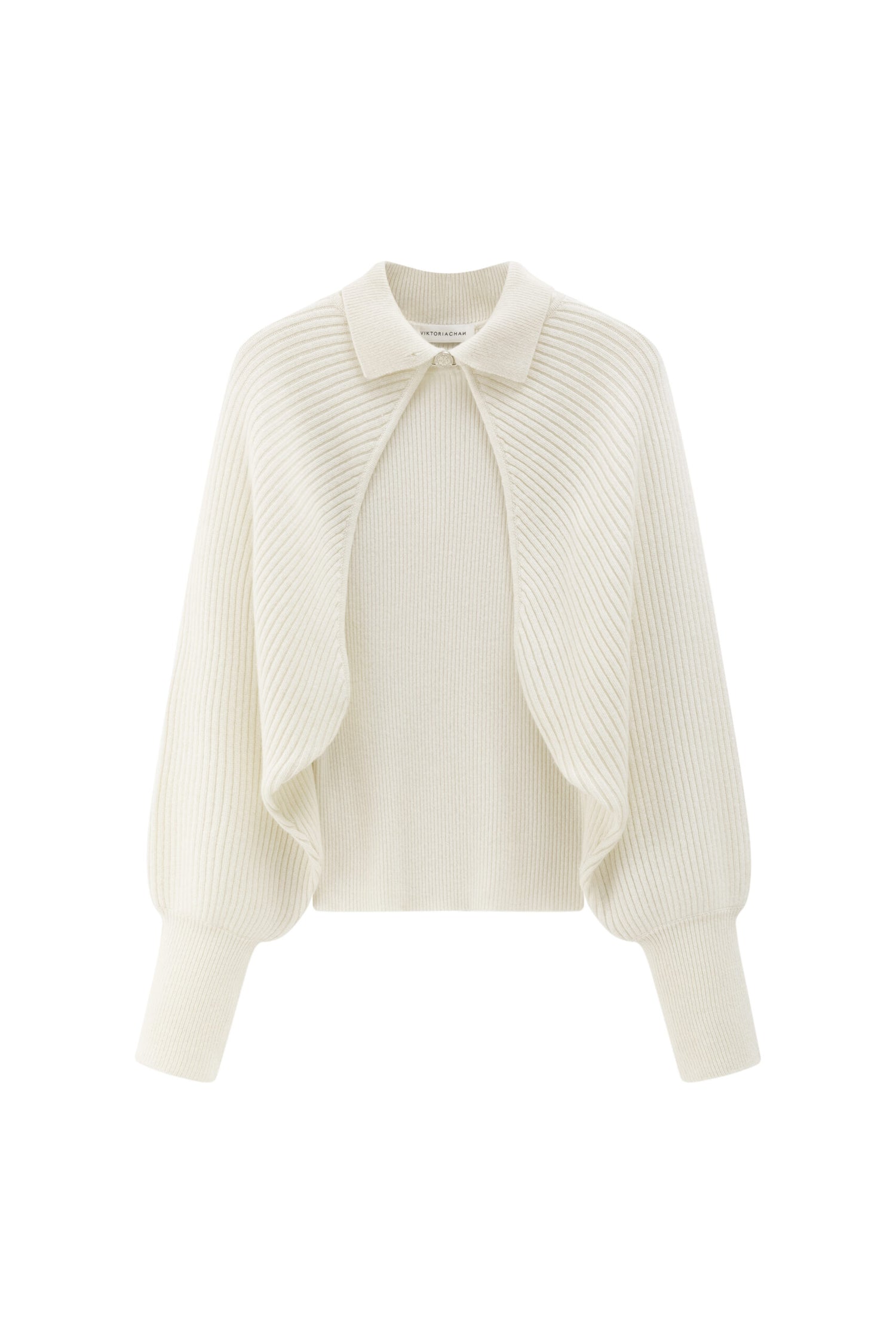Two peice knit top with a cape like sleeve pullover to be worn either front or back. Logo detail in the front. Small cuffs creating a balloon ish effect. Small fitted tank worn as turtle...