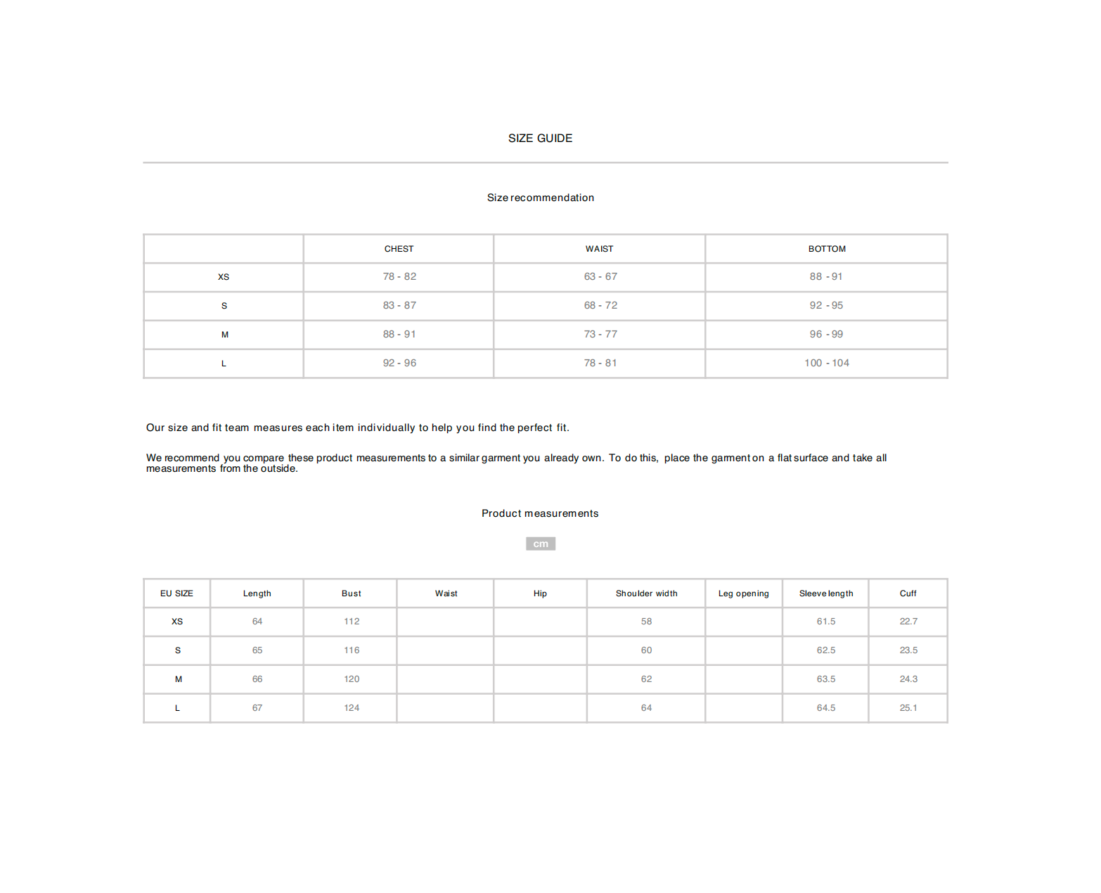 The model is 1.76 m tall and wears a size S. For more detailed sizing information, please consult our size charts.