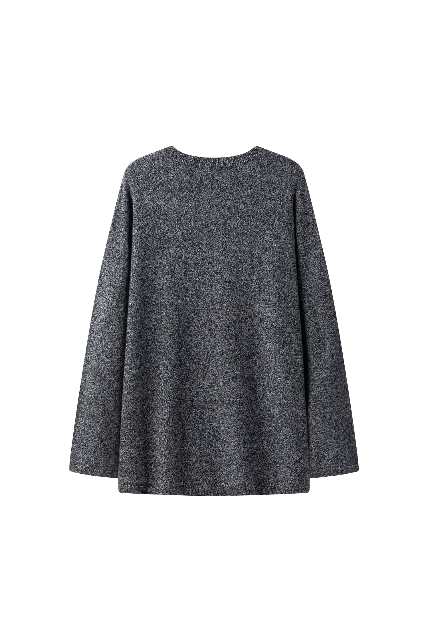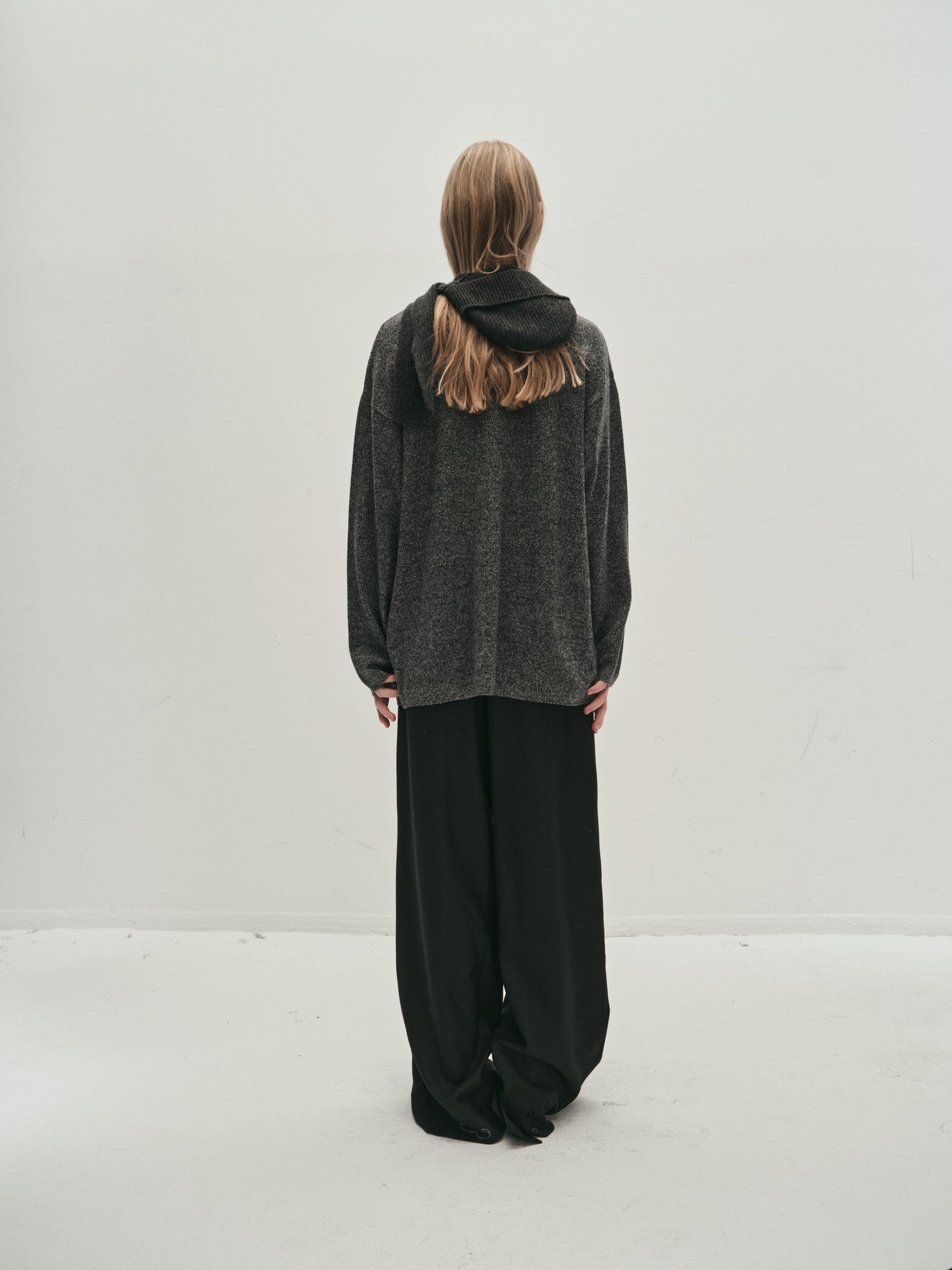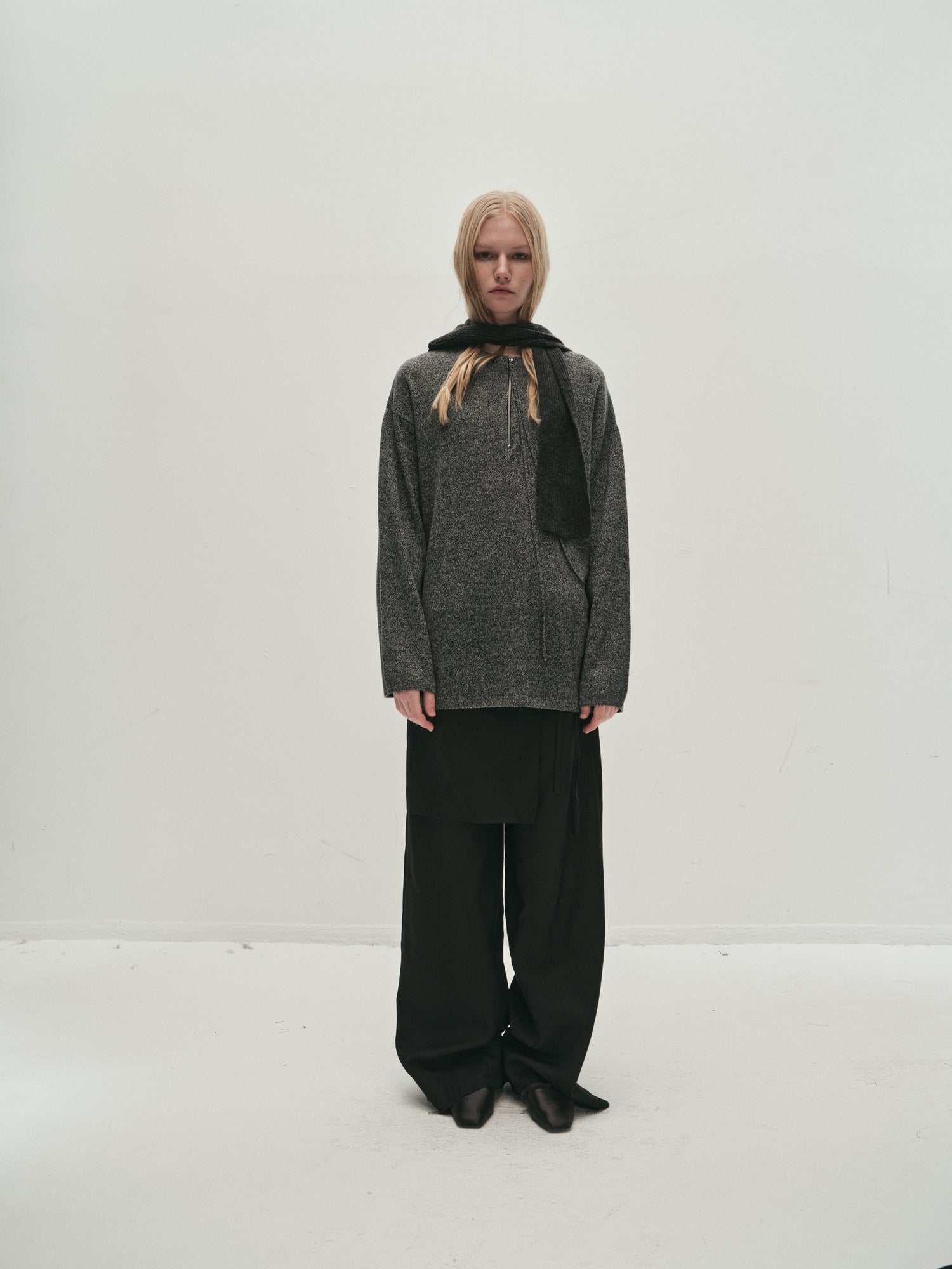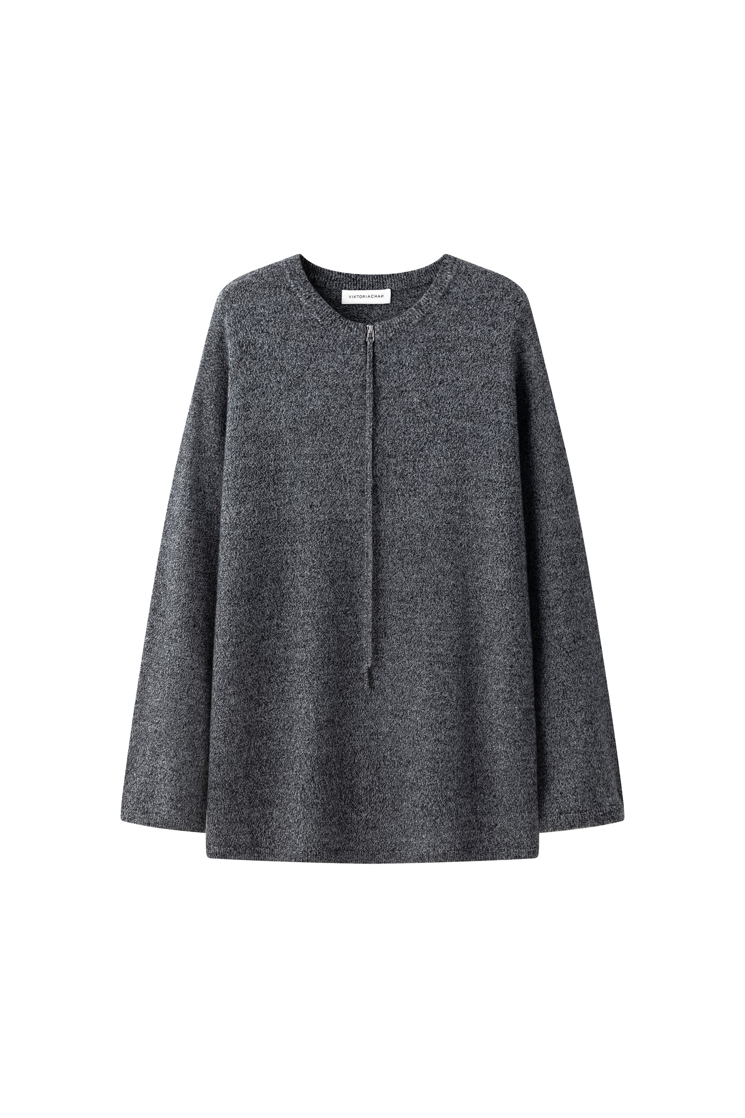 Oversized knit pullover with zipper detailed neckline. Ribbed details on neckline and hems.
