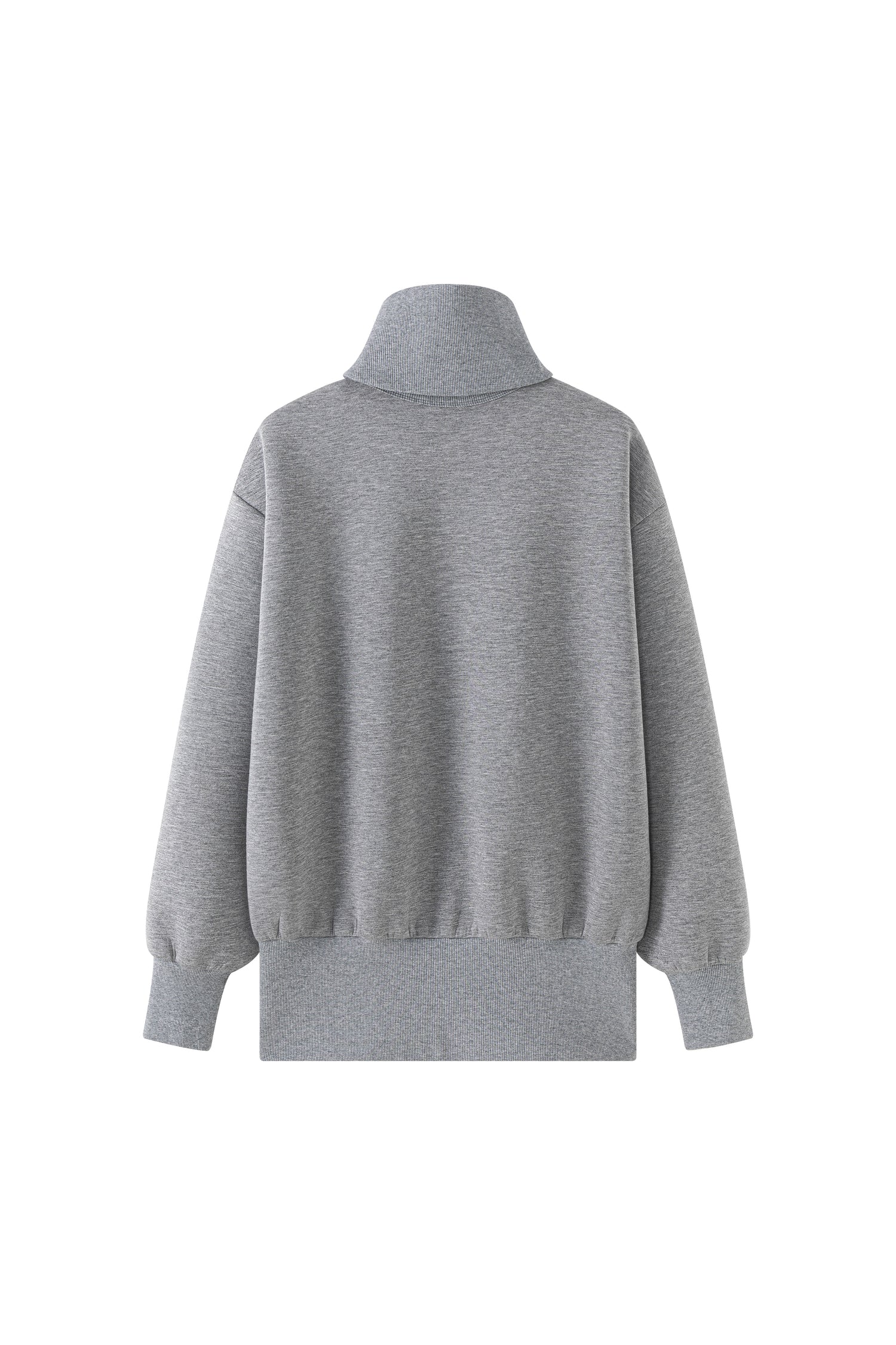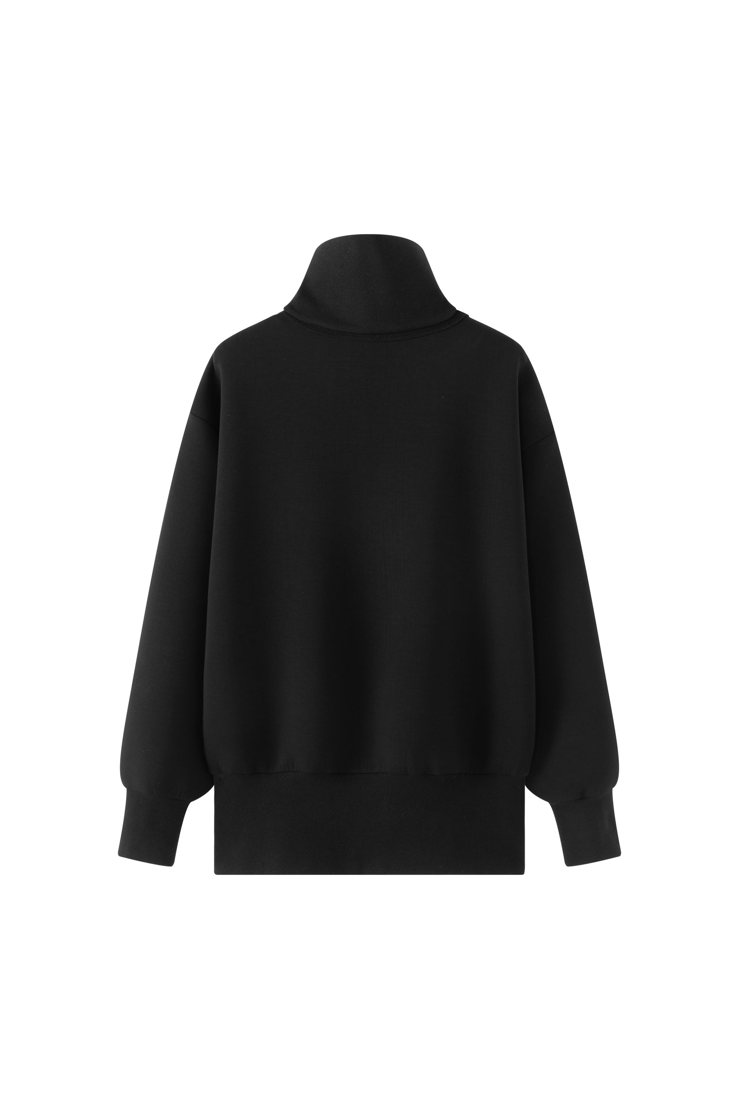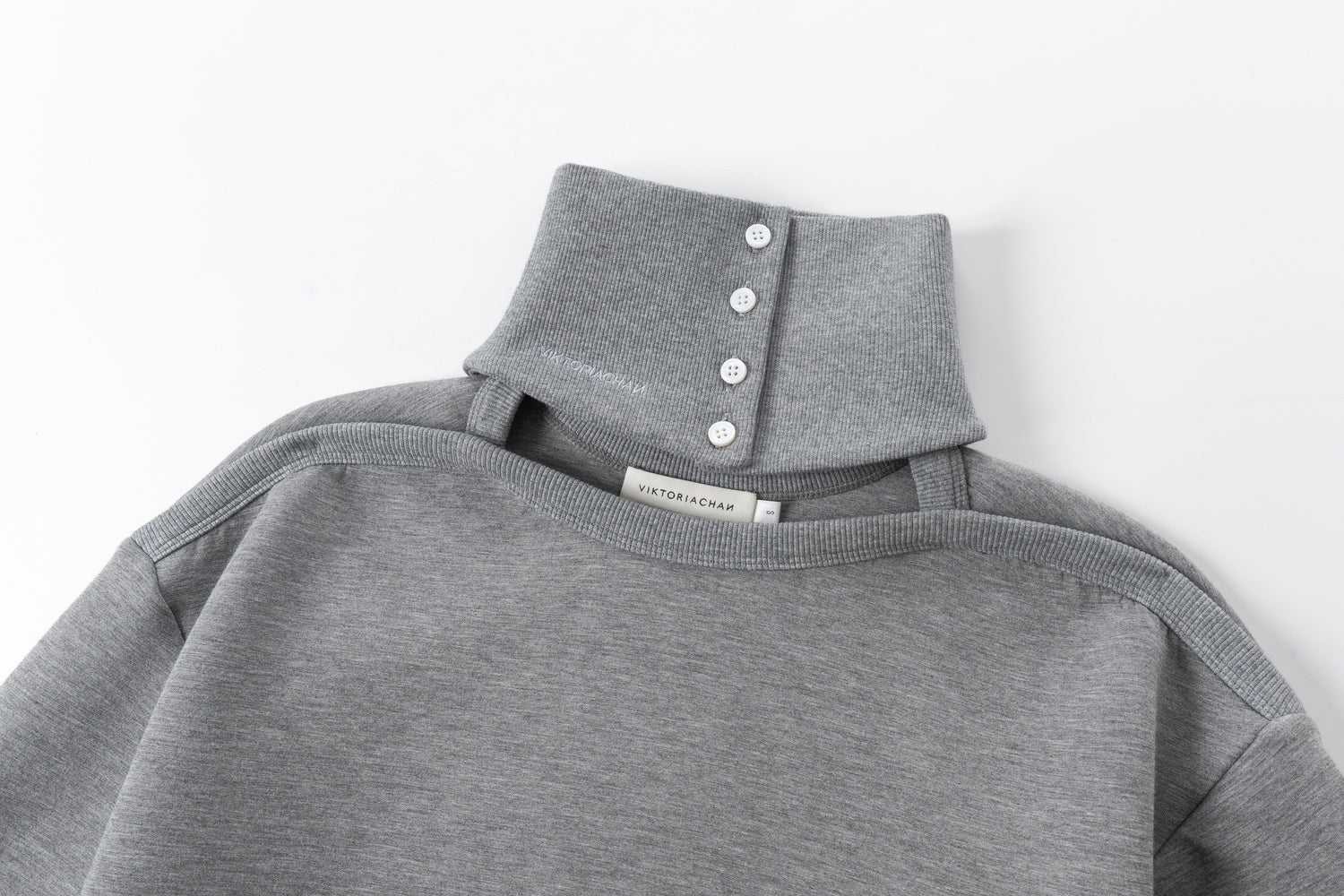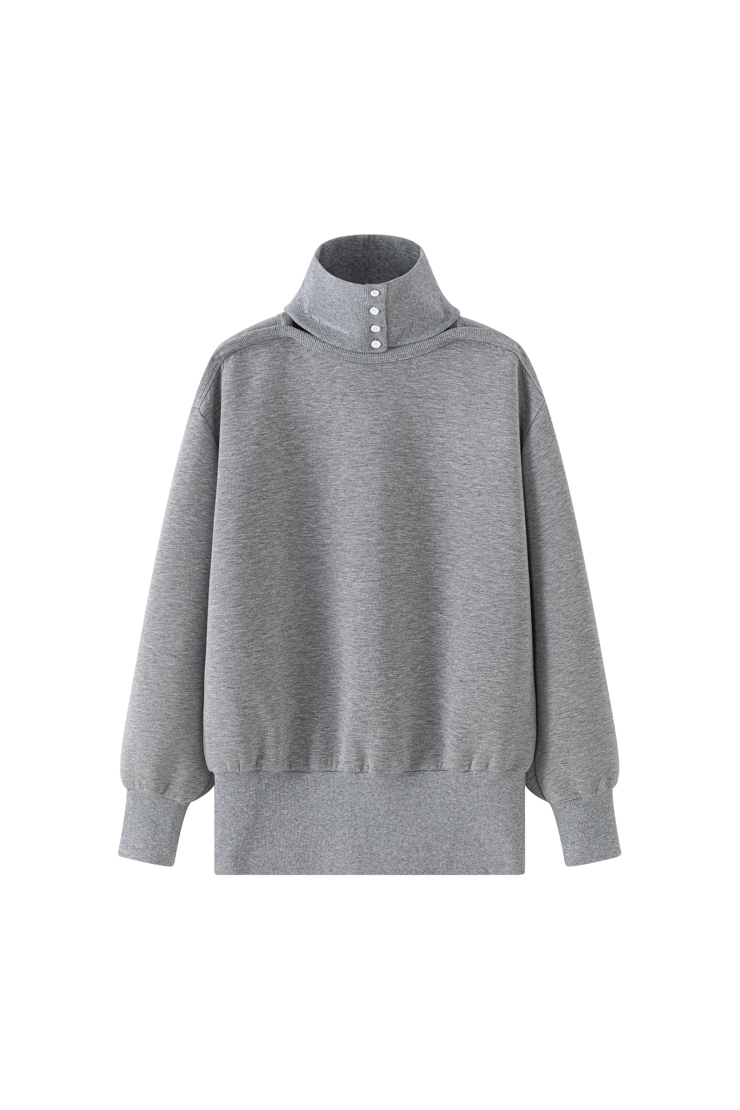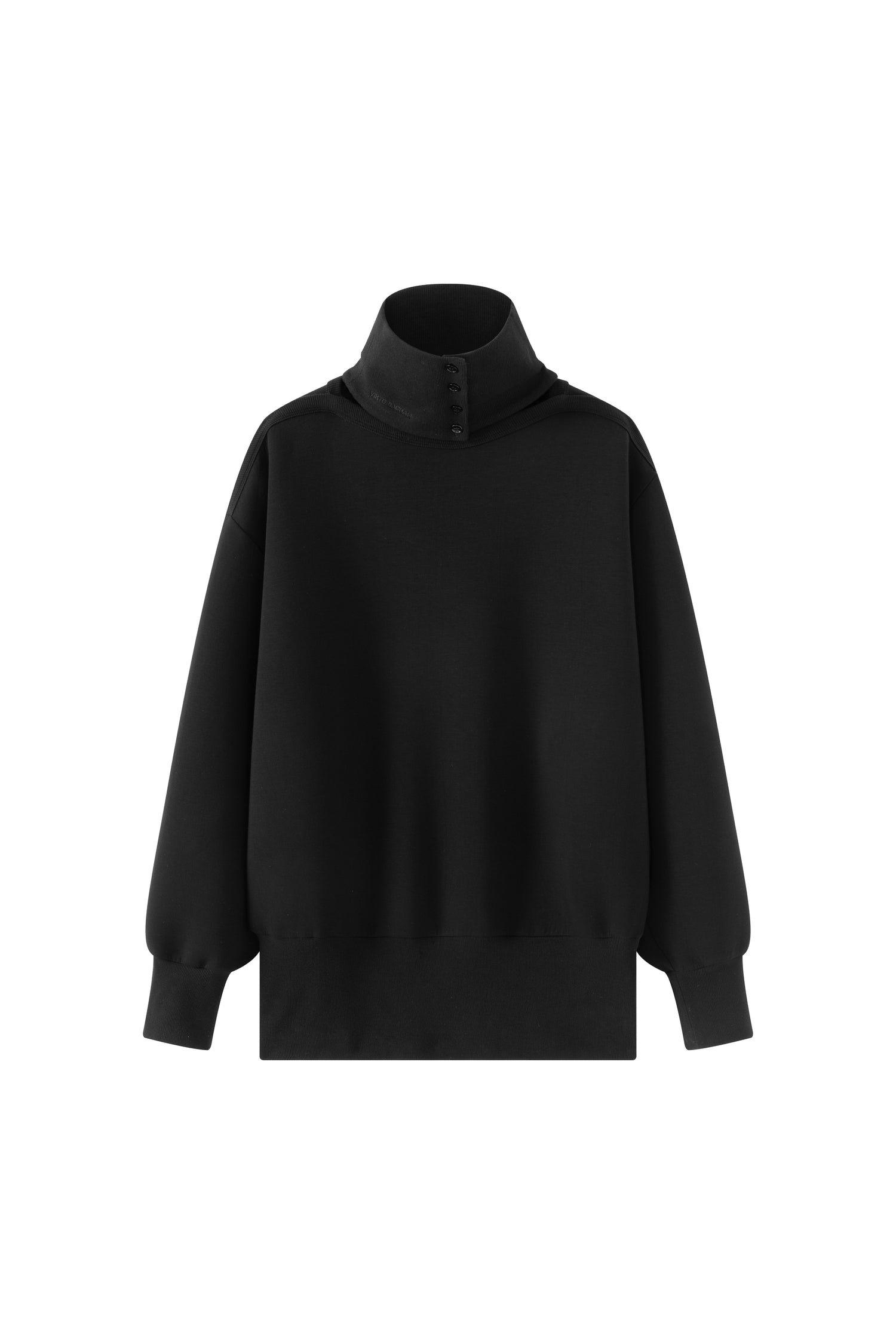 High-neck soft pullover with a relaxed fit, ribbed cuffs and hem, and a high funnel neck featuring discreet white button closures at the back of the collar for subtle detailing.