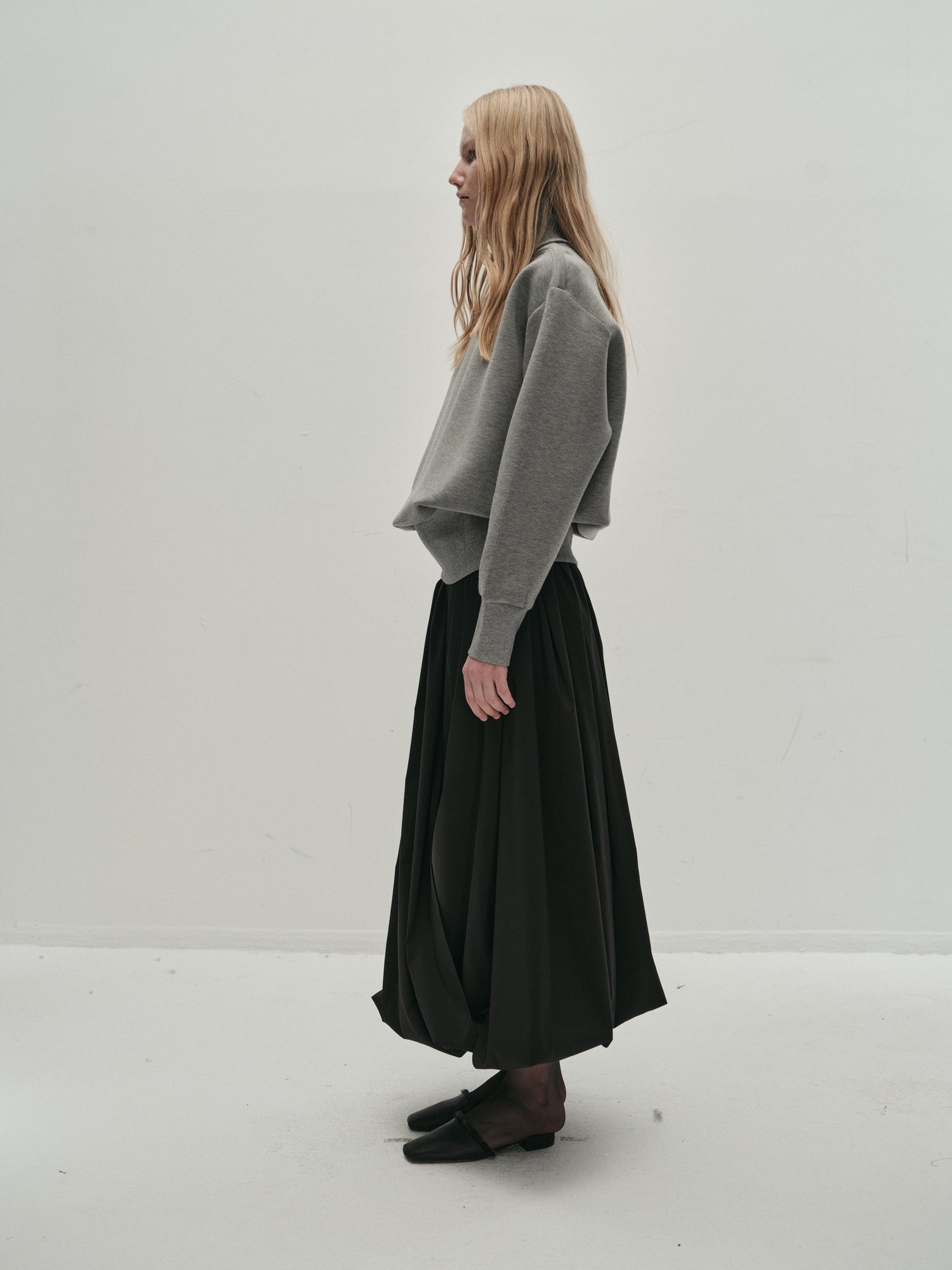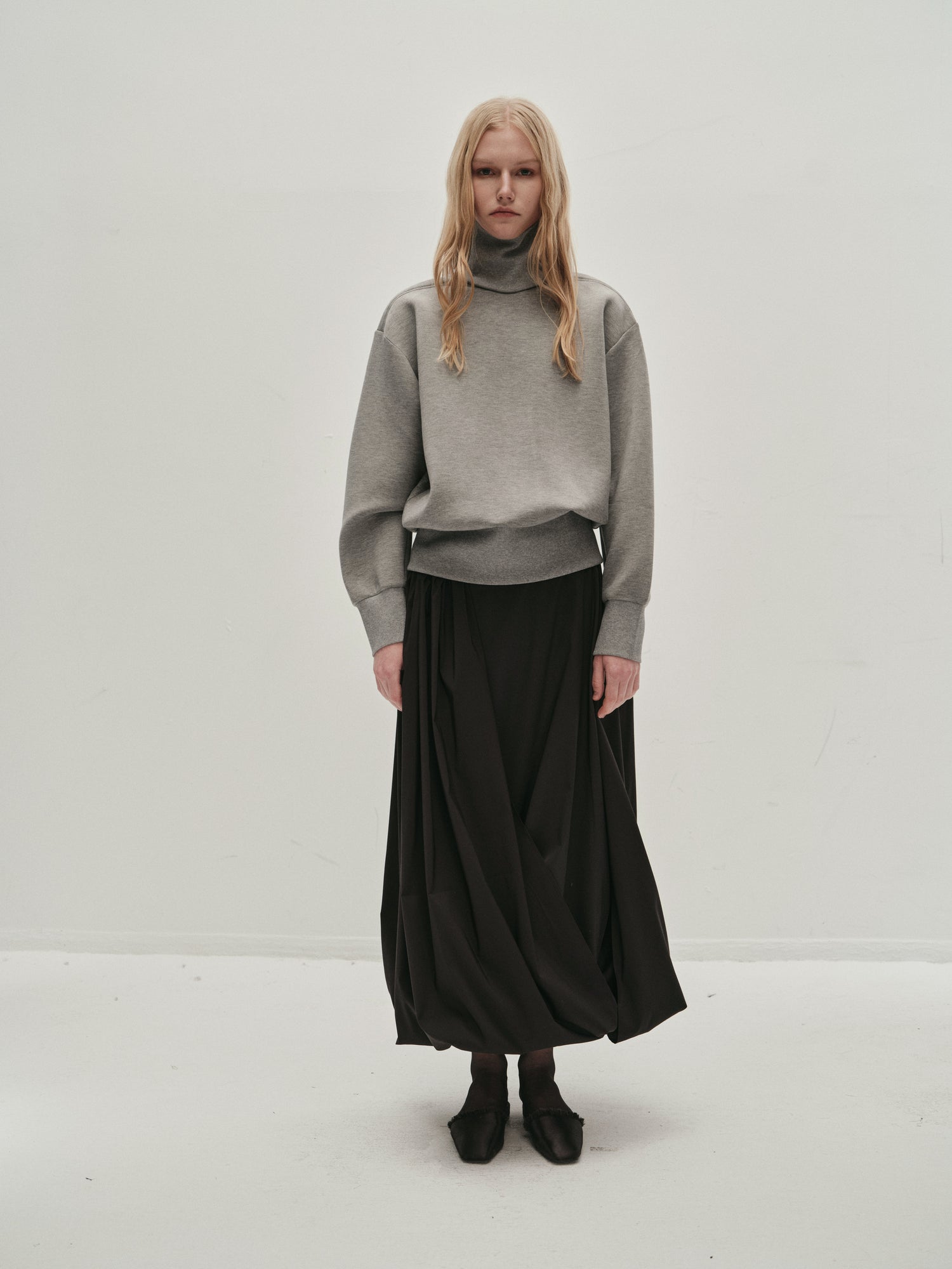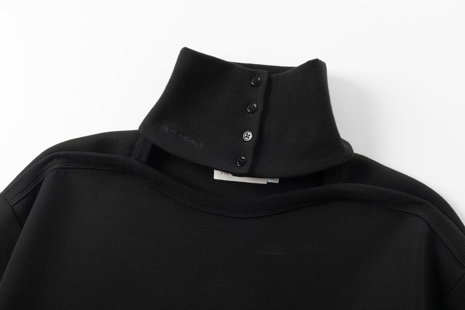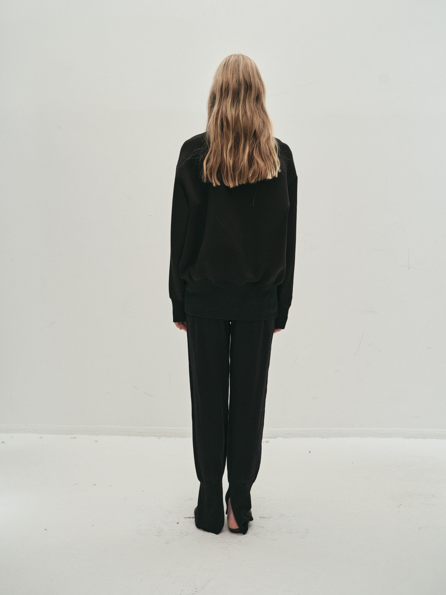 High-neck soft pullover with a relaxed fit, ribbed cuffs and hem, and a high funnel neck featuring discreet white button closures at the back of the collar for subtle detailing.