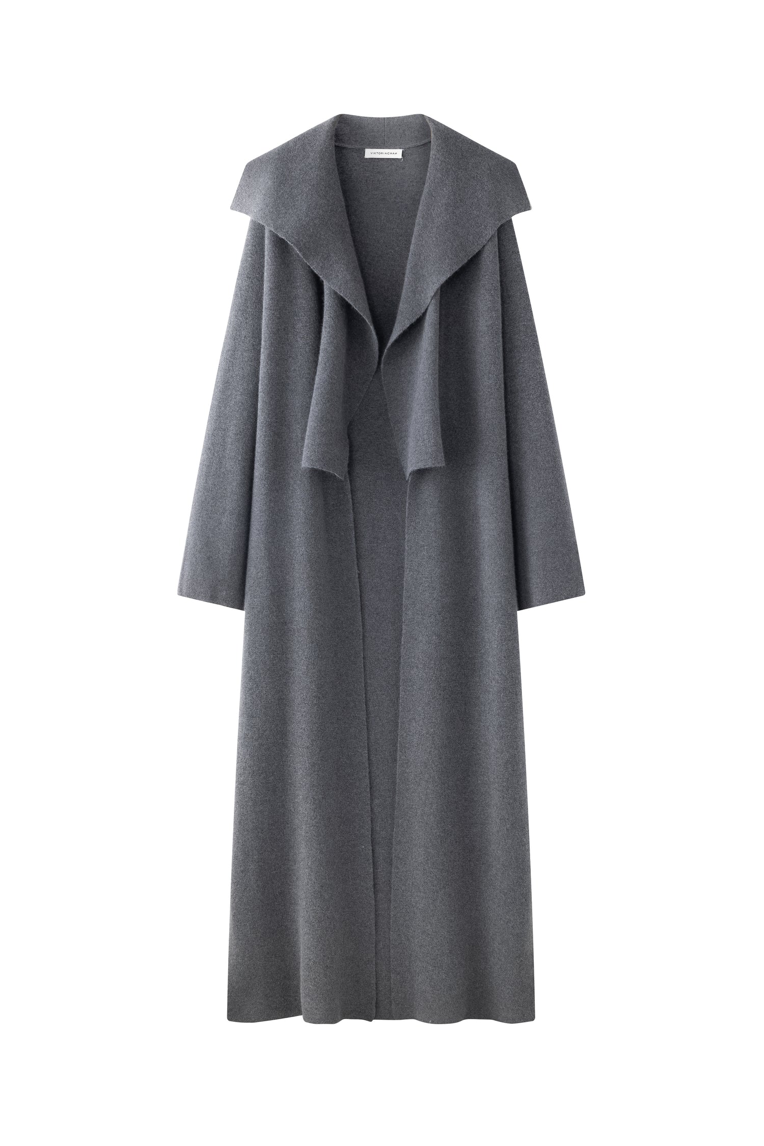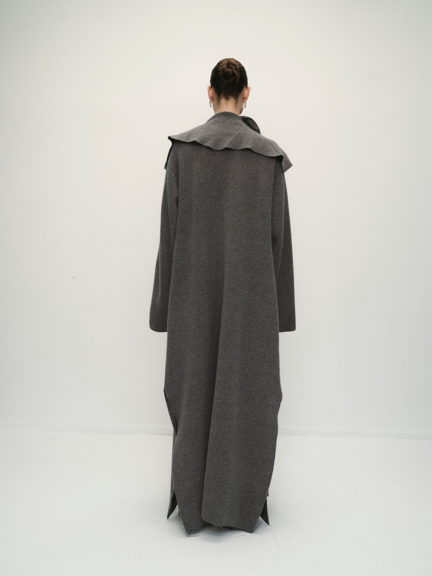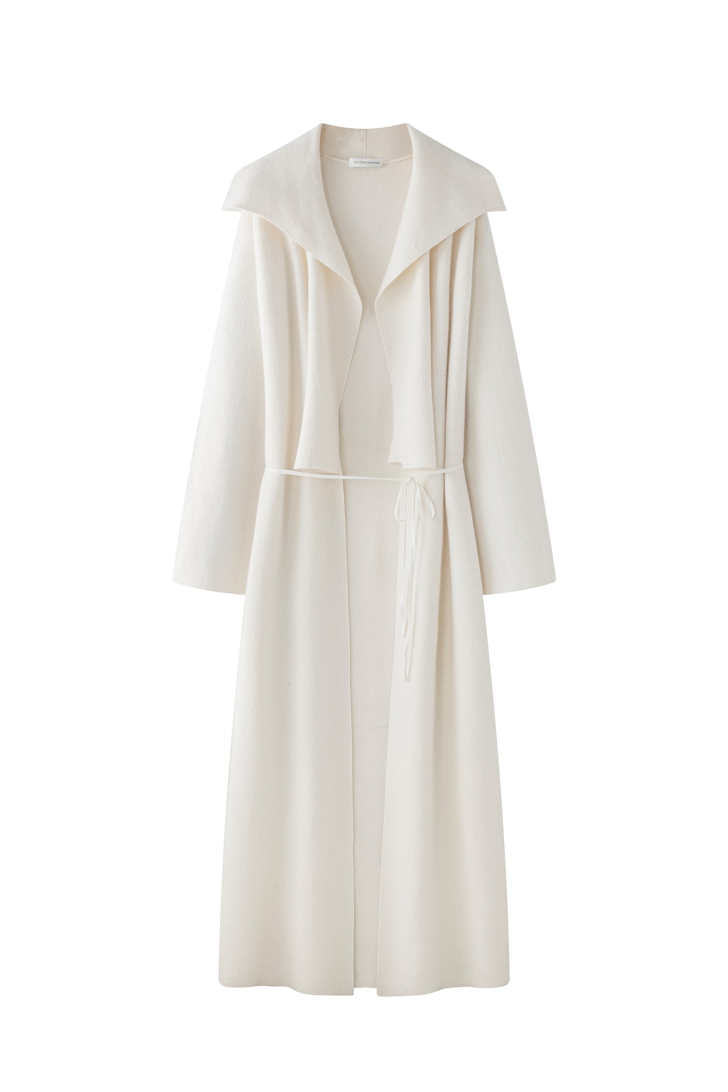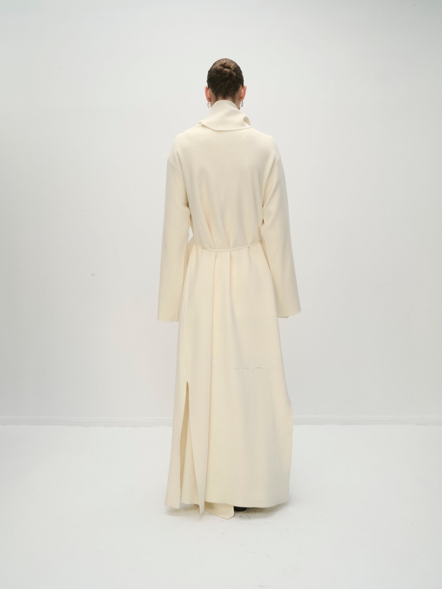 Long knit wool-blend coat with a long collar. Can be tied at the waist.