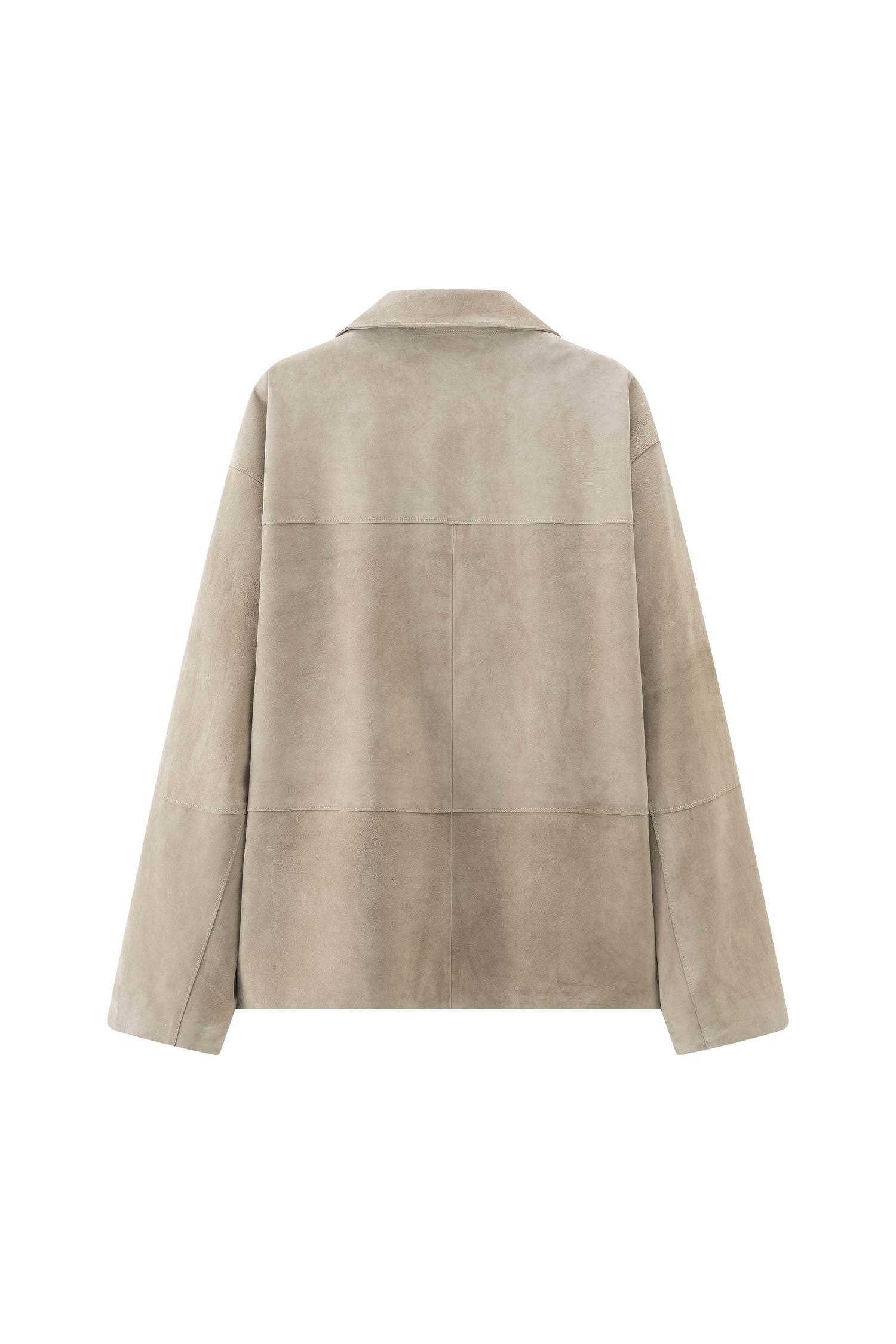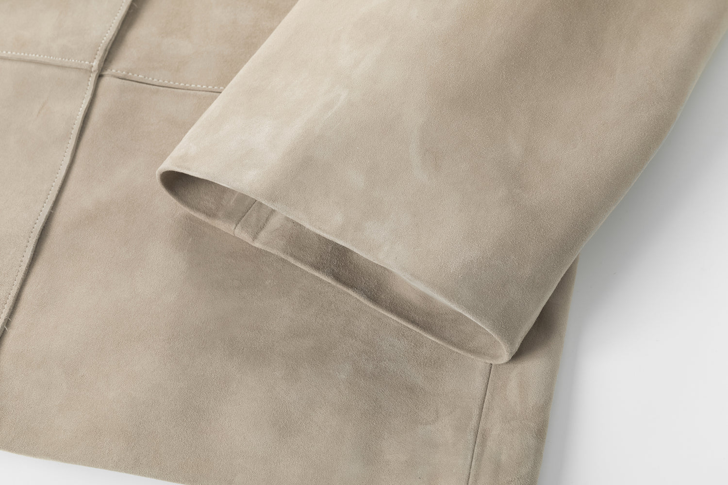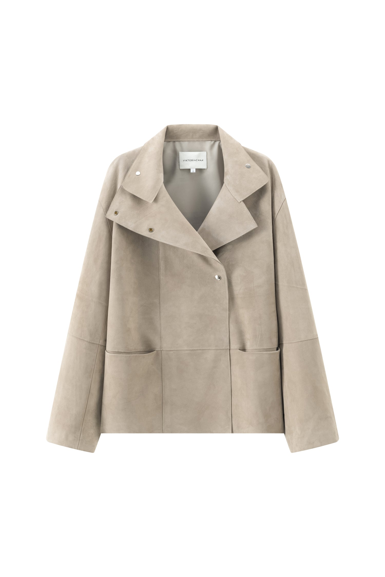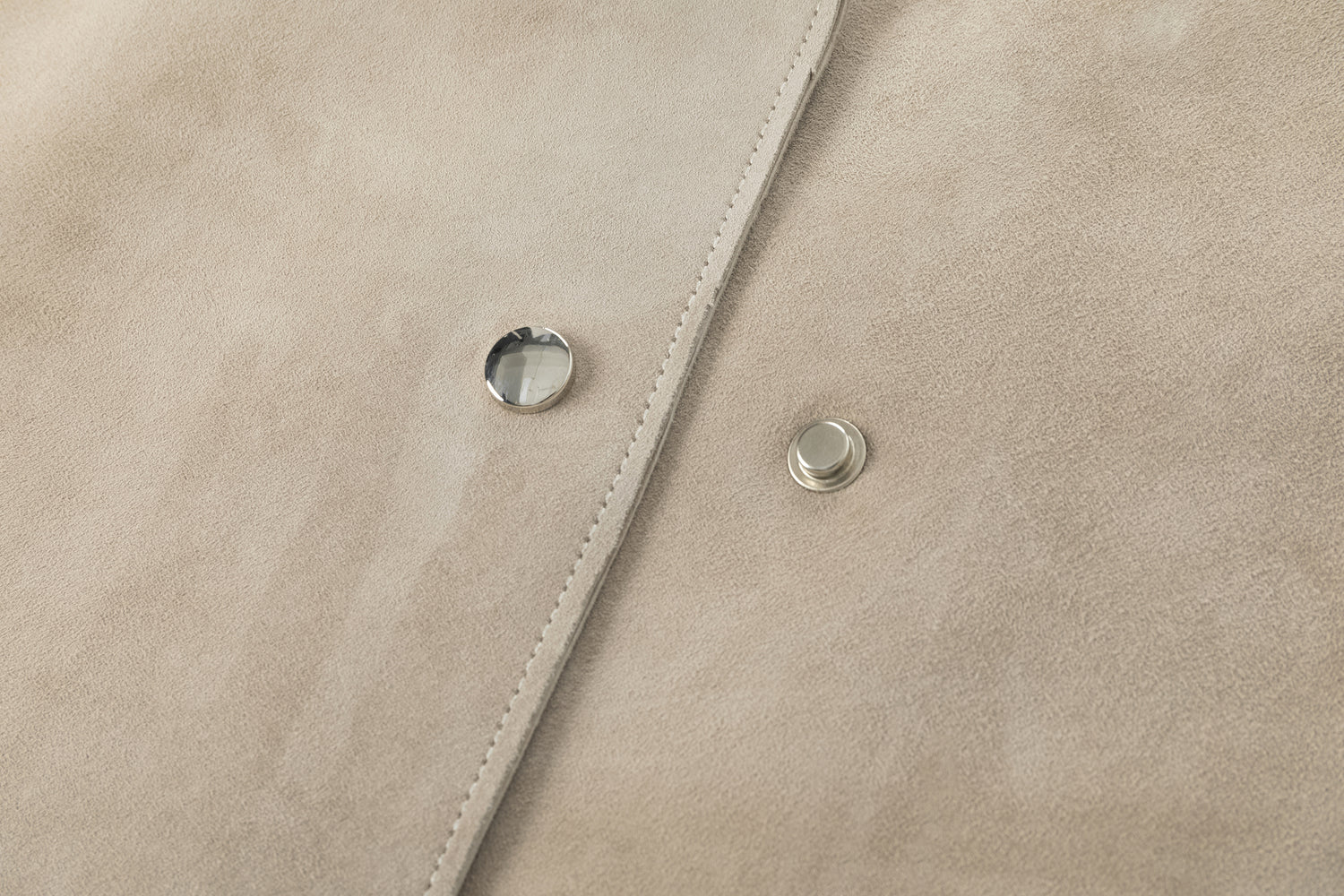 Soft suede jacket with a versatile collar featuring press-metal buttons that can be worn high-neck or opened into two lapels for a relaxed look. Designed with clean seam lines and practi...