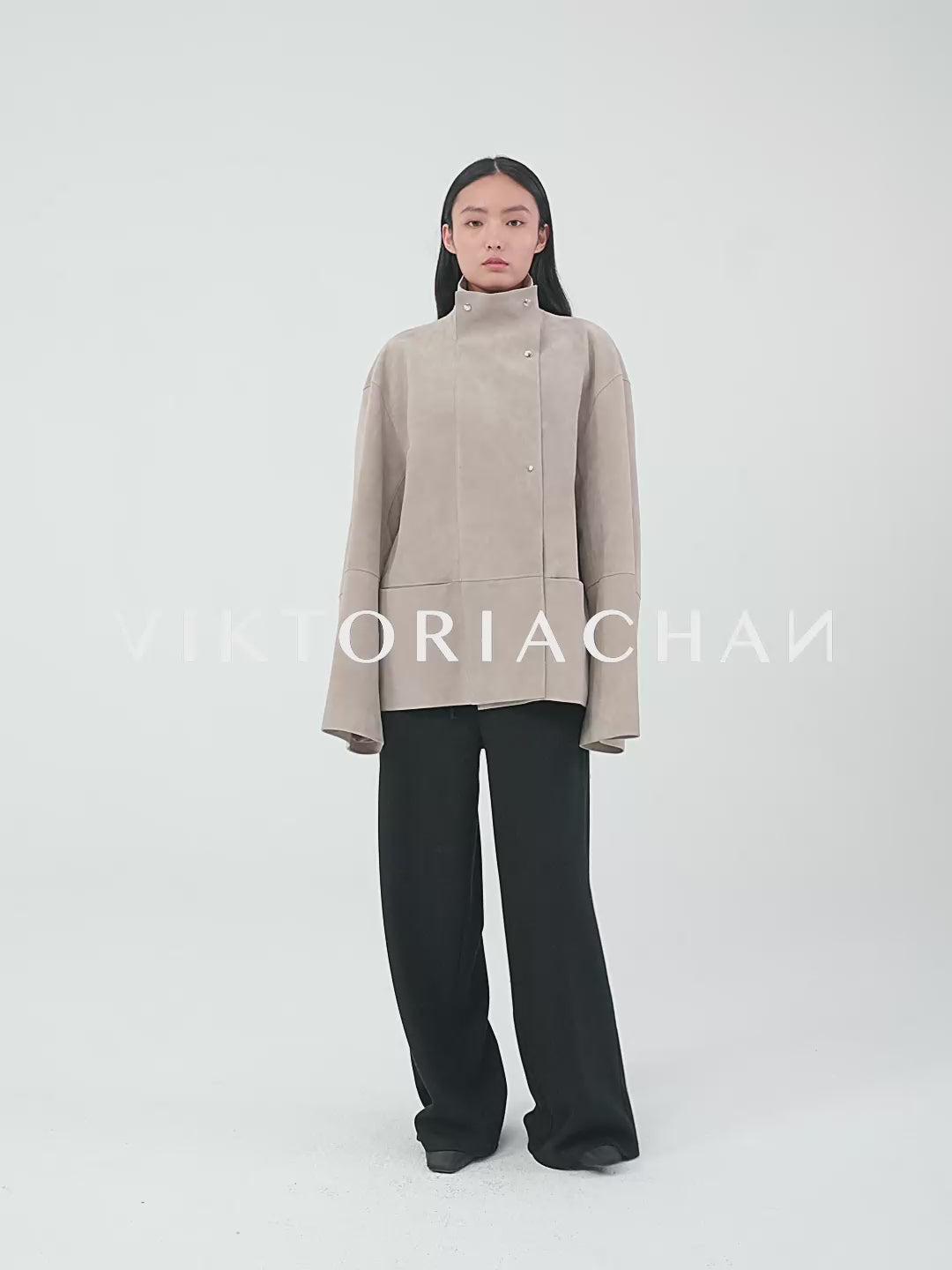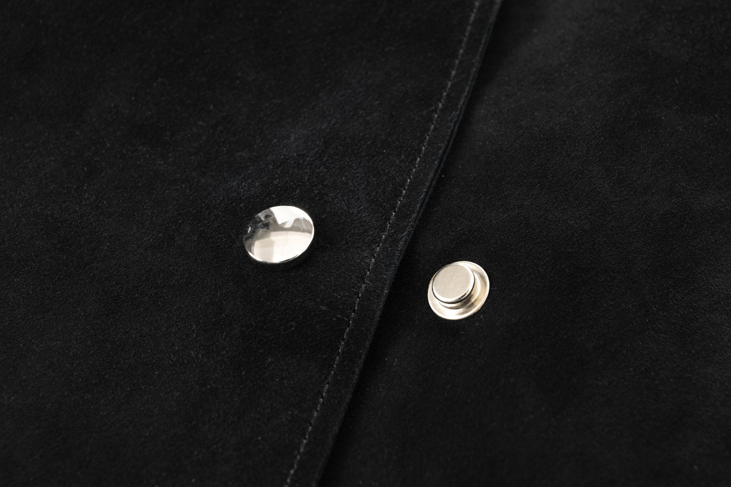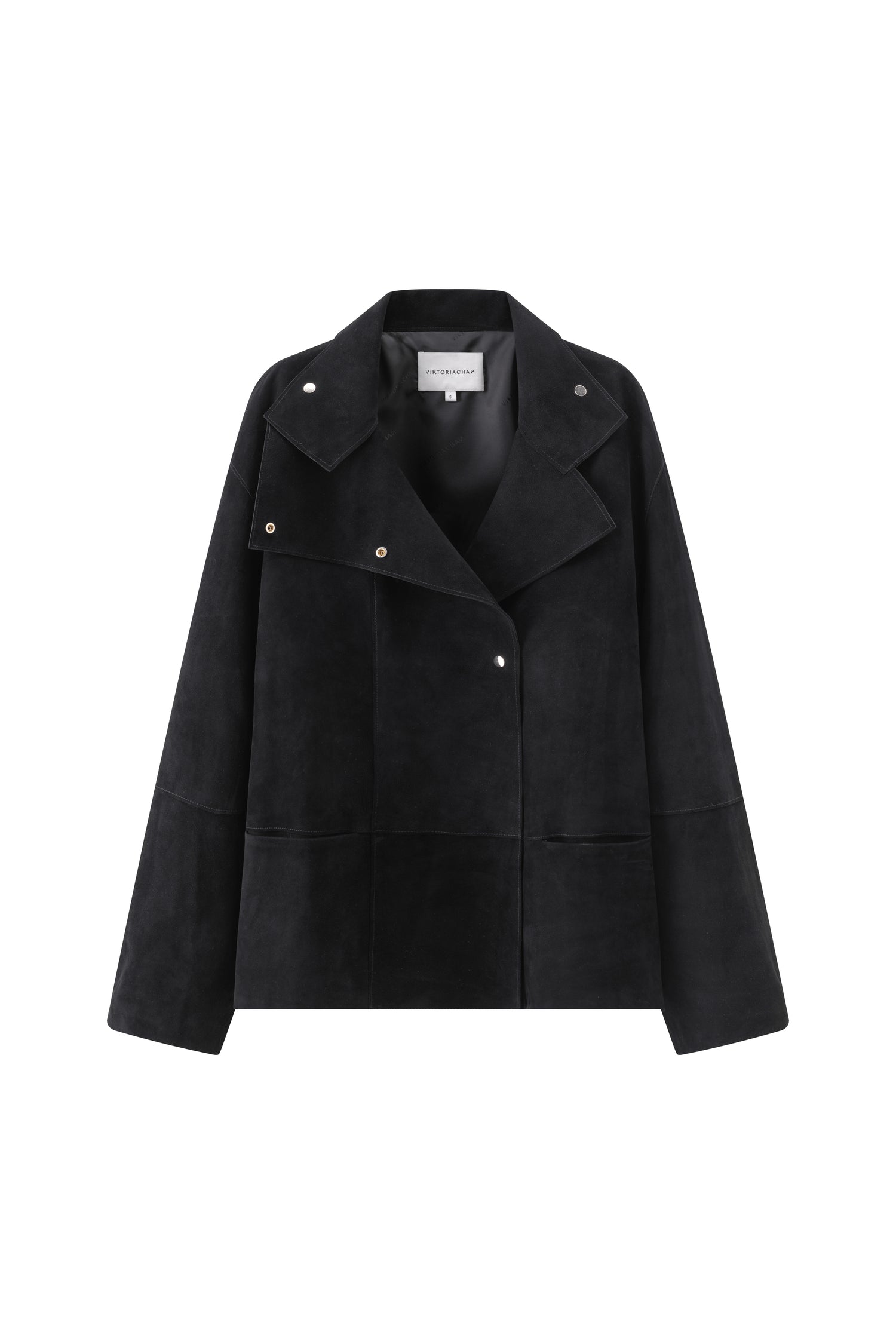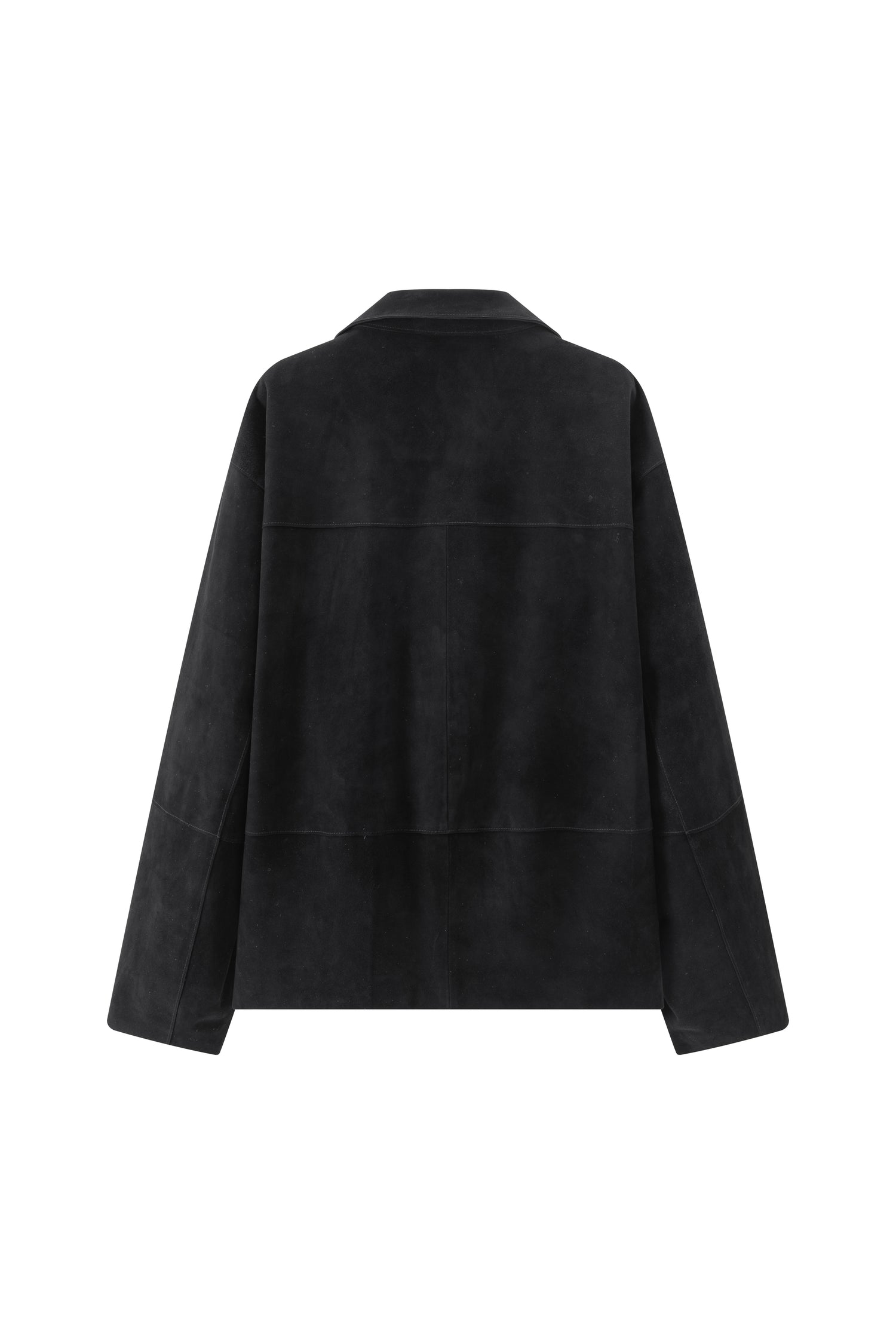 Soft suede jacket with a versatile collar featuring press-metal buttons that can be worn high-neck or opened into two lapels for a relaxed look. Designed with clean seam lines and practi...