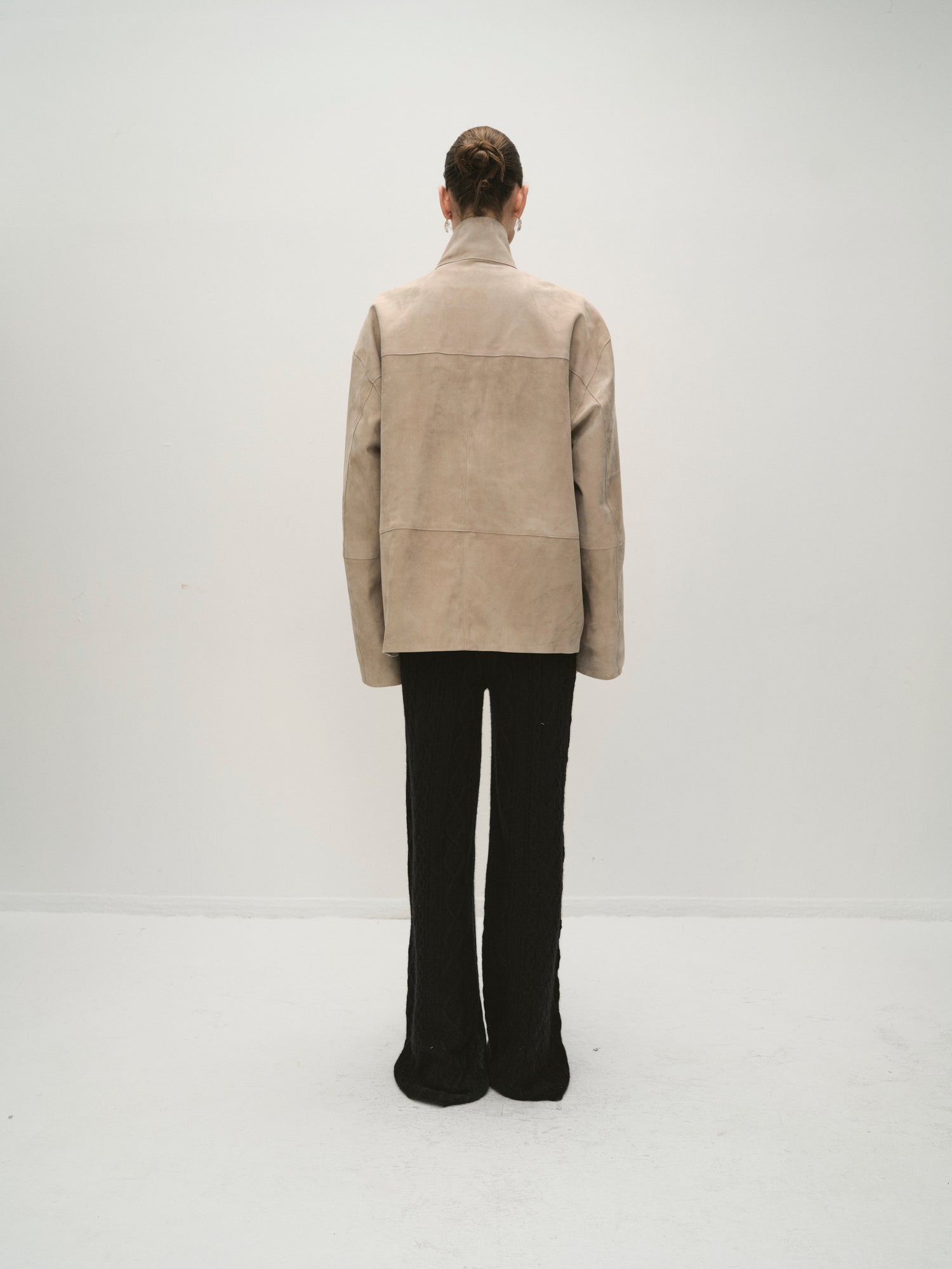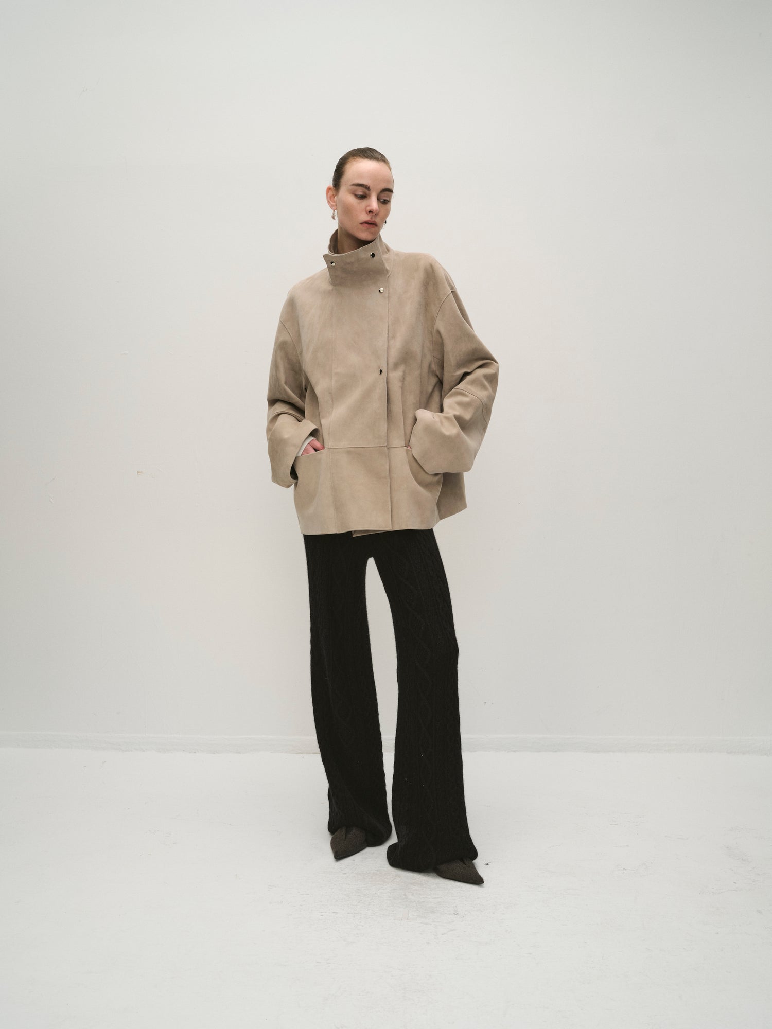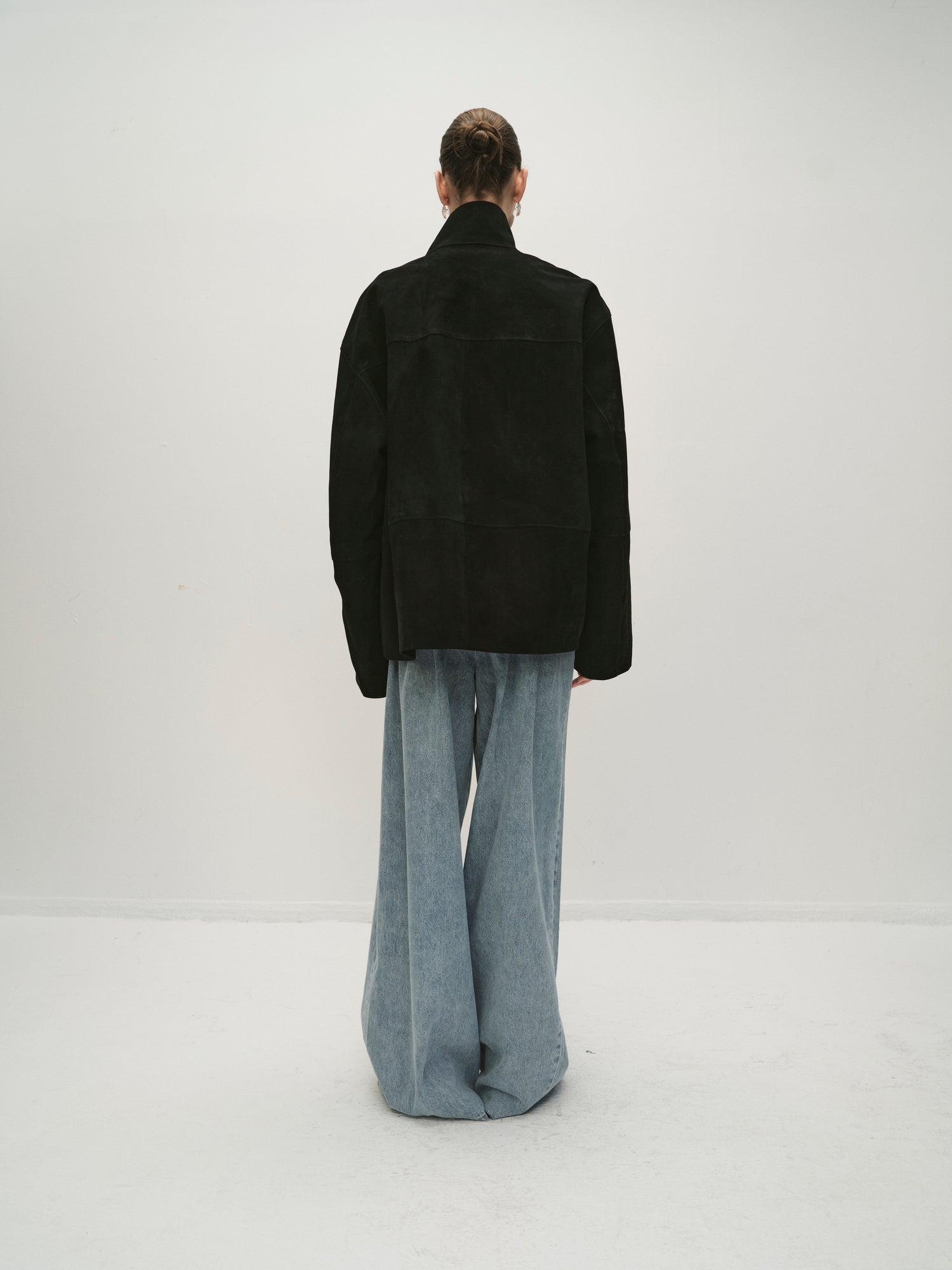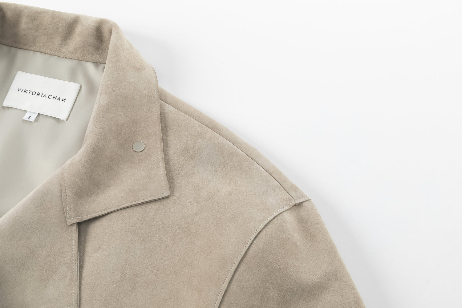 Soft suede jacket with a versatile collar featuring press-metal buttons that can be worn high-neck or opened into two lapels for a relaxed look. Designed with clean seam lines and practi...