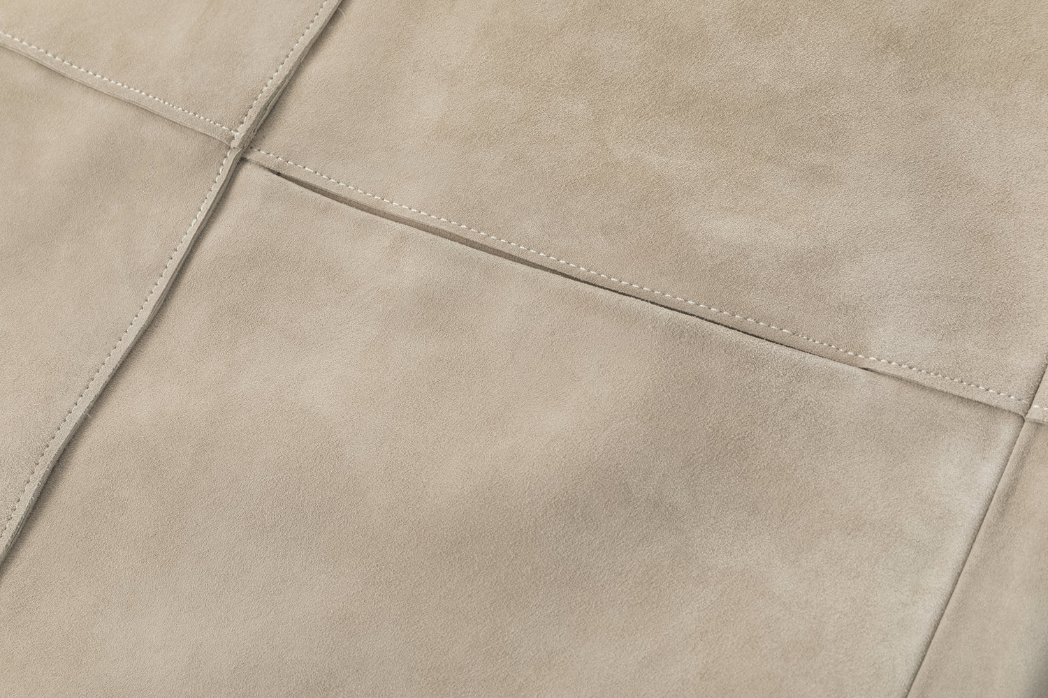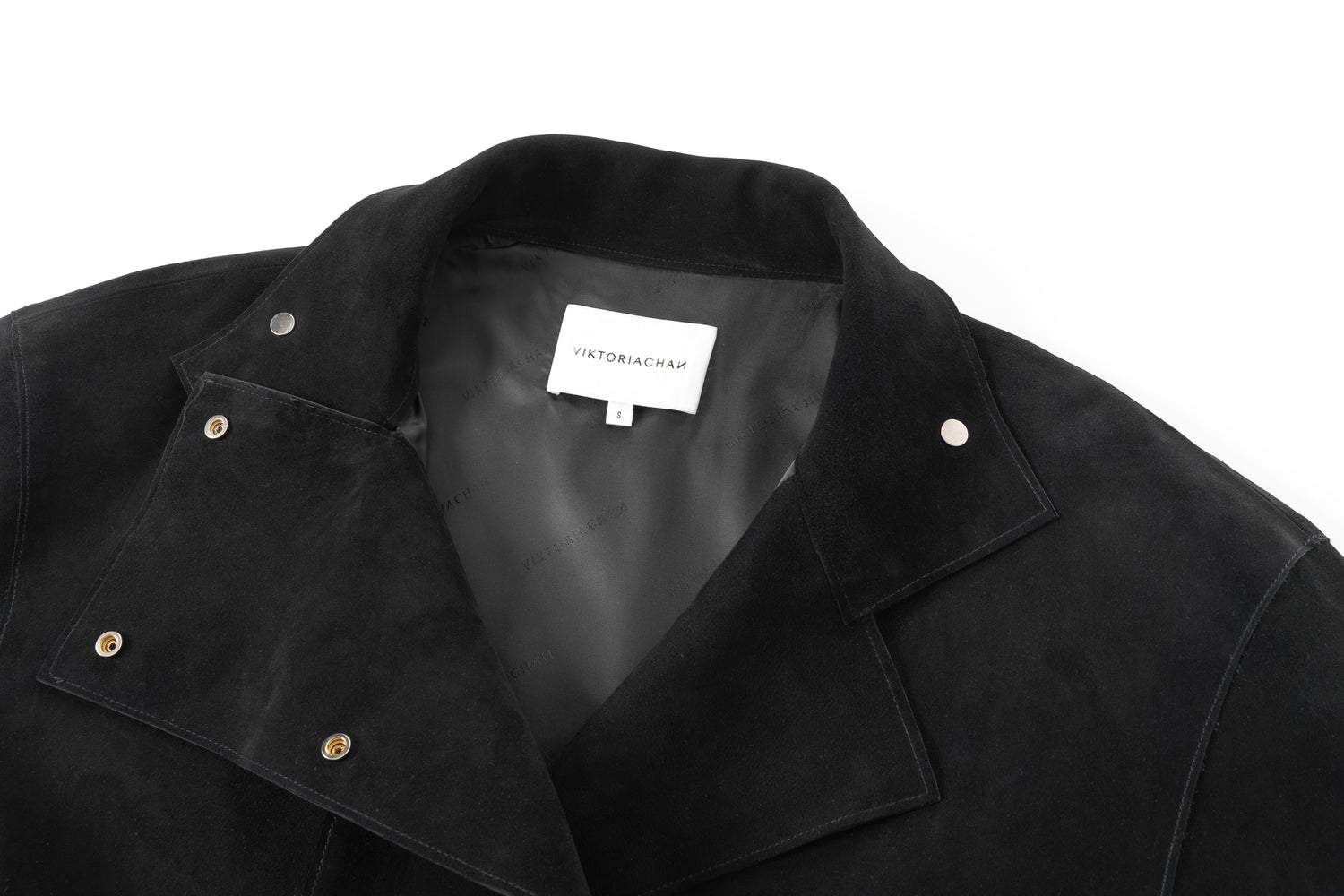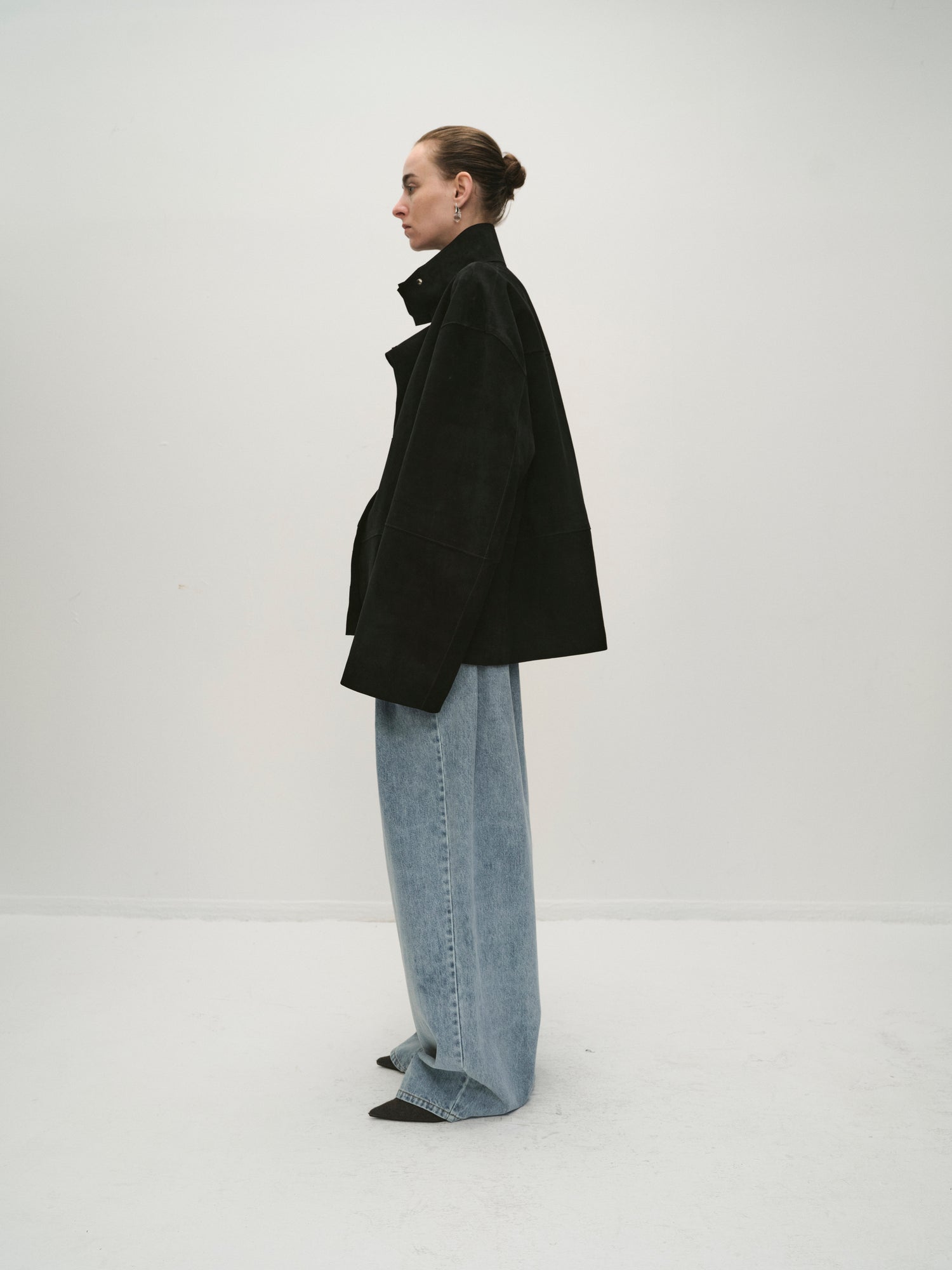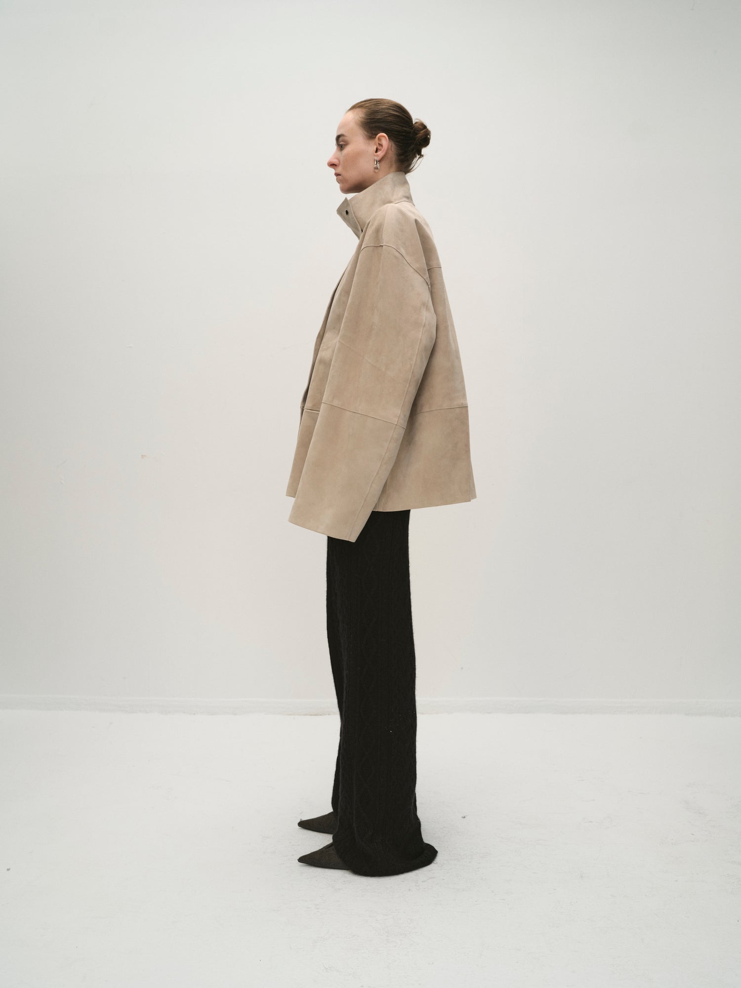 Soft suede jacket with a versatile collar featuring press-metal buttons that can be worn high-neck or opened into two lapels for a relaxed look. Designed with clean seam lines and practi...