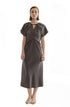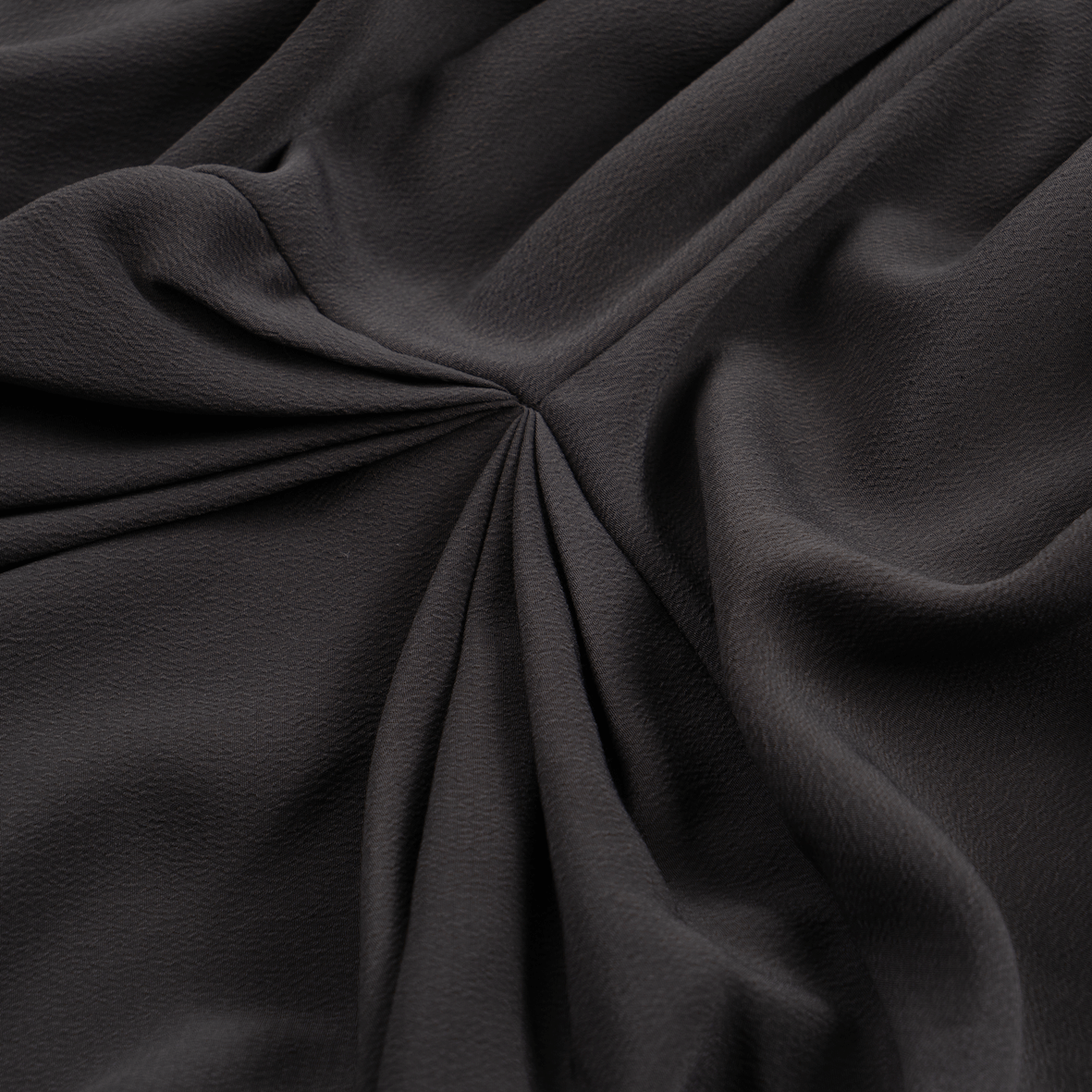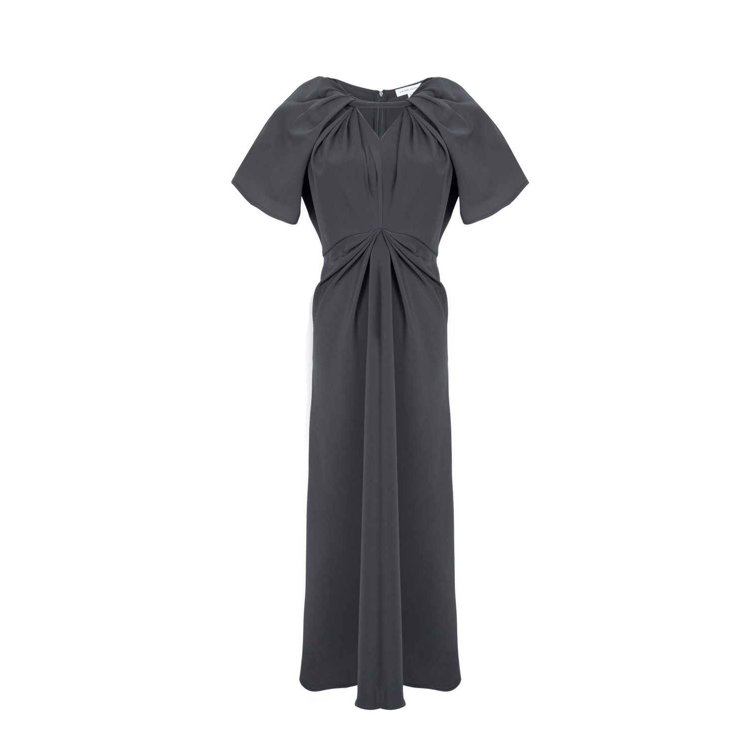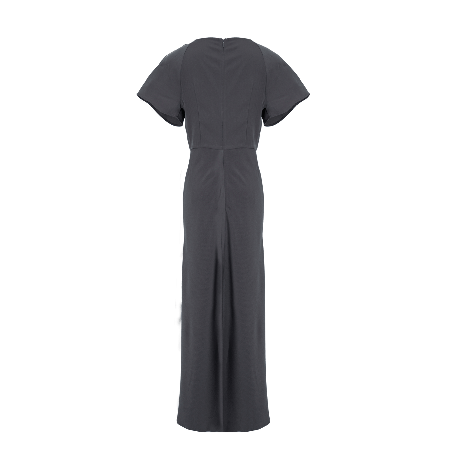 Beautiful fabric manipulated neckline where the draping hides the stomach, the arms and directs the attention to the neck and waist line. The waist line goes a bit higher in front to cre...