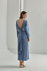 Our classic knot dress in a new version. Oversized upper part that fits more body types. Boat neck neckline. Slightly wrinkled in the waist to create the blousing effect. Skewed cut bott...