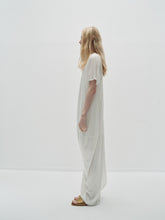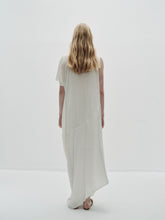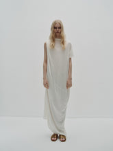 A fluid dress in ultra-fine fabric, featuring one short sleeve and one sleeveless side. Asymmetrical in both cut and hem, with a subtle line detail on the skirt for added structure.