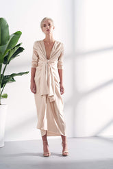 Is draped based on two knots. One knot is tied from below and one from above which makes it very flattering for most body types as you can adjust the knots yoursel...