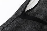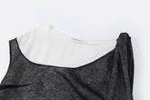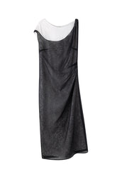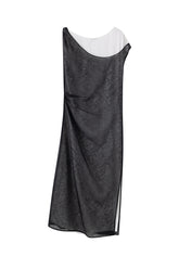This layered dress features a structured high-collar underlayer in a classic t-shirt cut, paired with a sheer black textured overlay. The outer layer is designed with an asymmetrical sho...