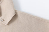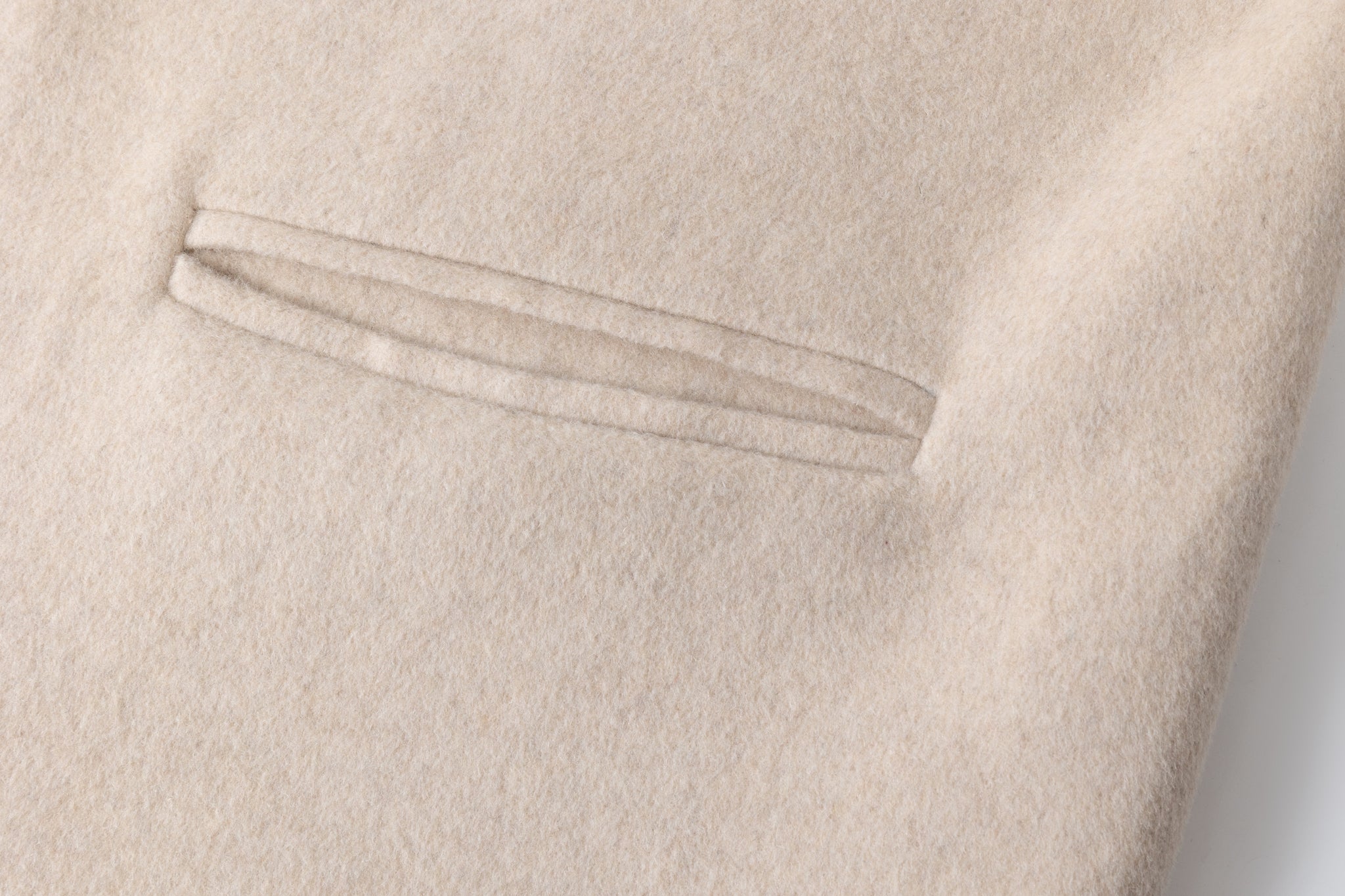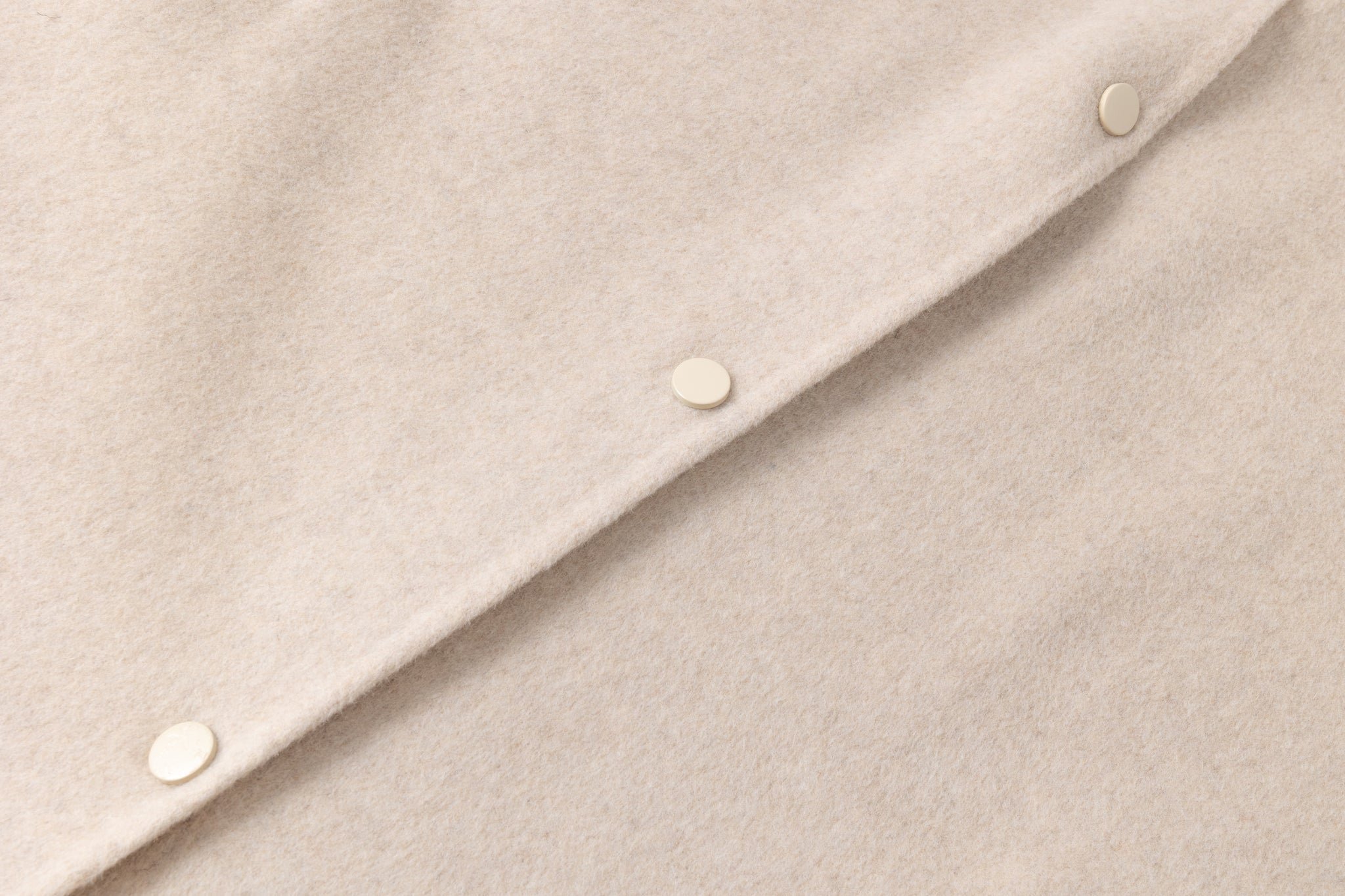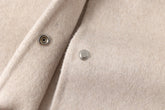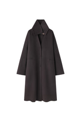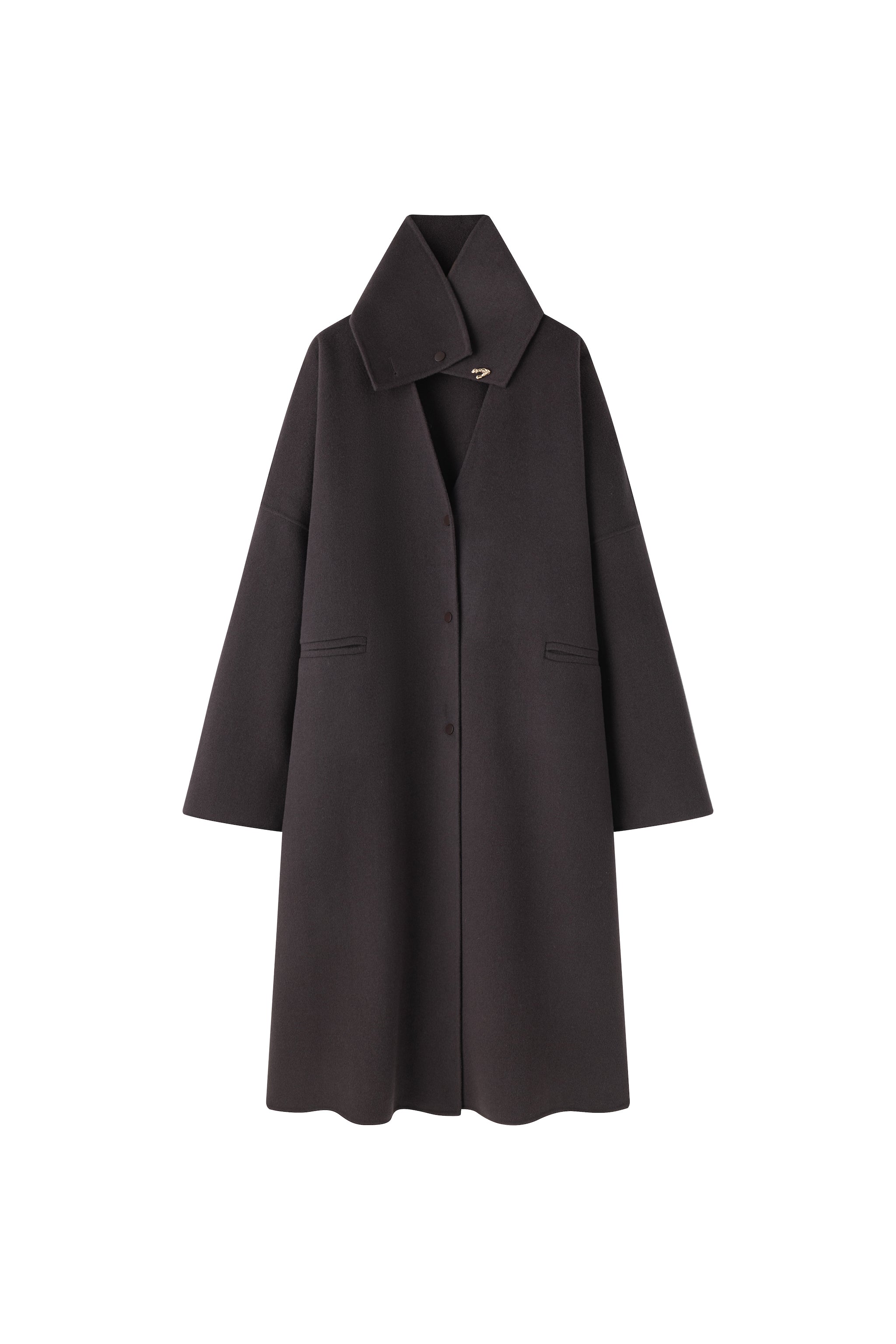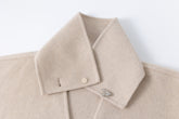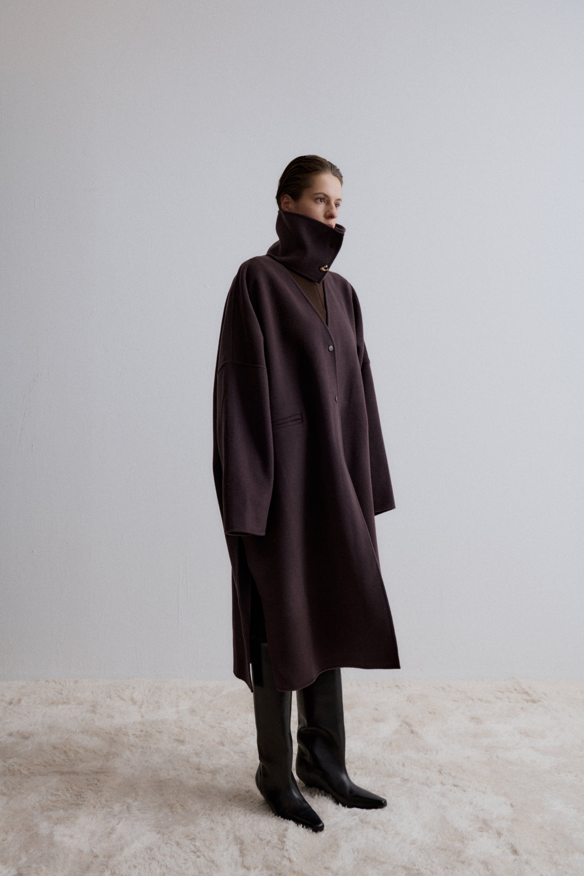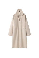 This oversized cashmere and wool blend coat in a soft beige hue features a minimalist design with a wide high collar that can be worn folded or buttoned for extra warmth. The relaxed fit...