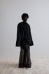 Black structured cape-style coat with a high round neckline. It features a distinctive front tie design for added elegance and two buttons for closure at the neck. The wide silhouette an...