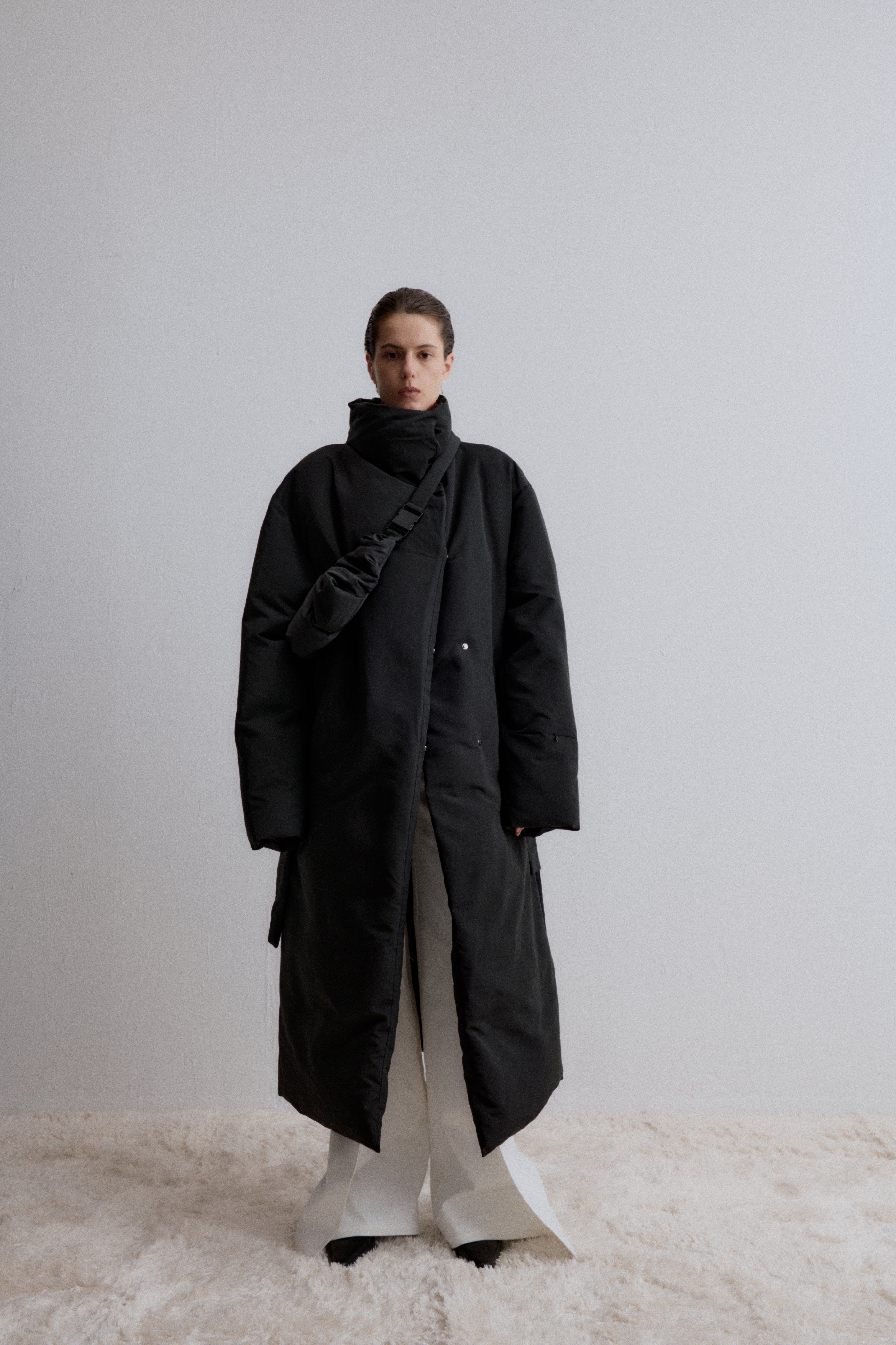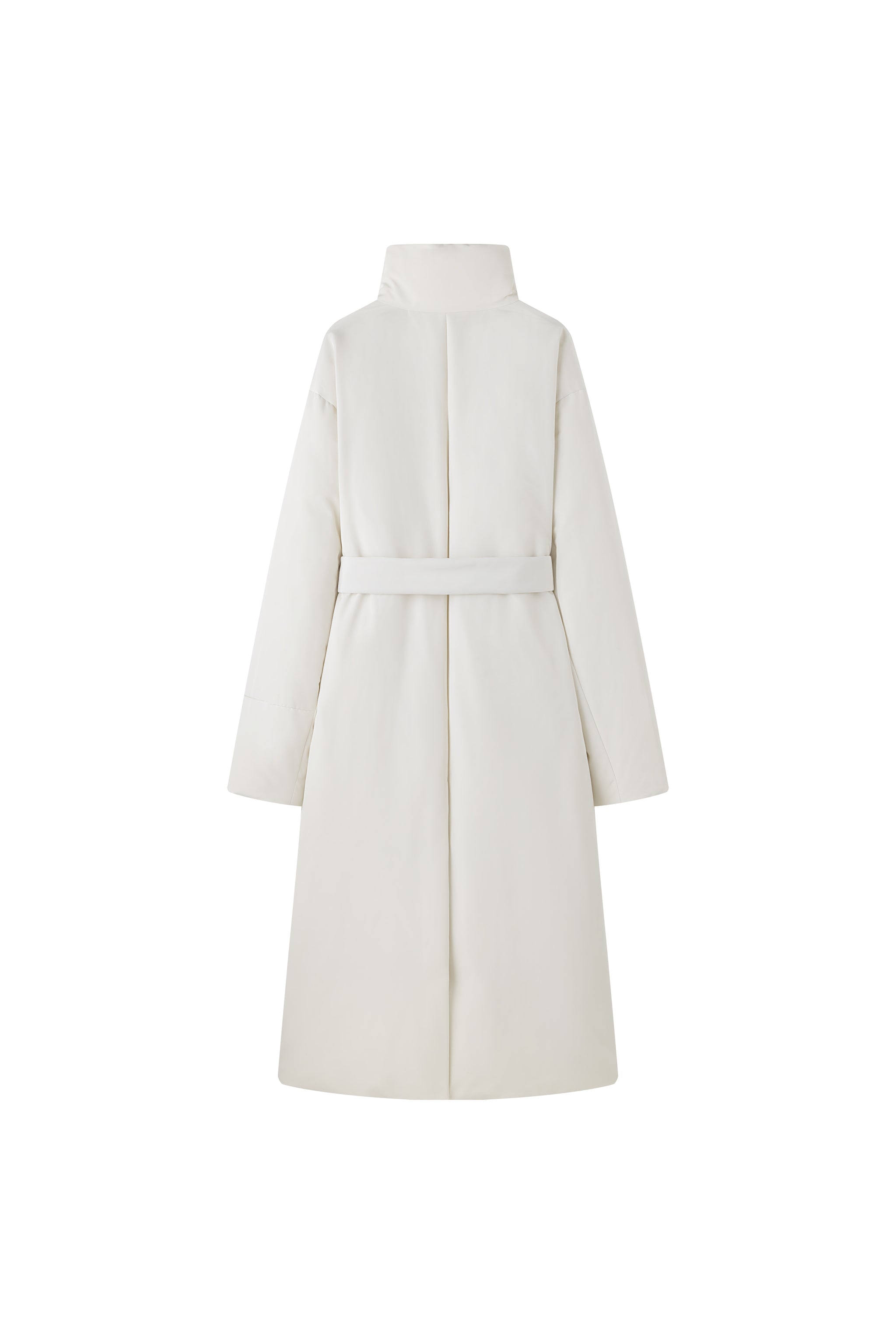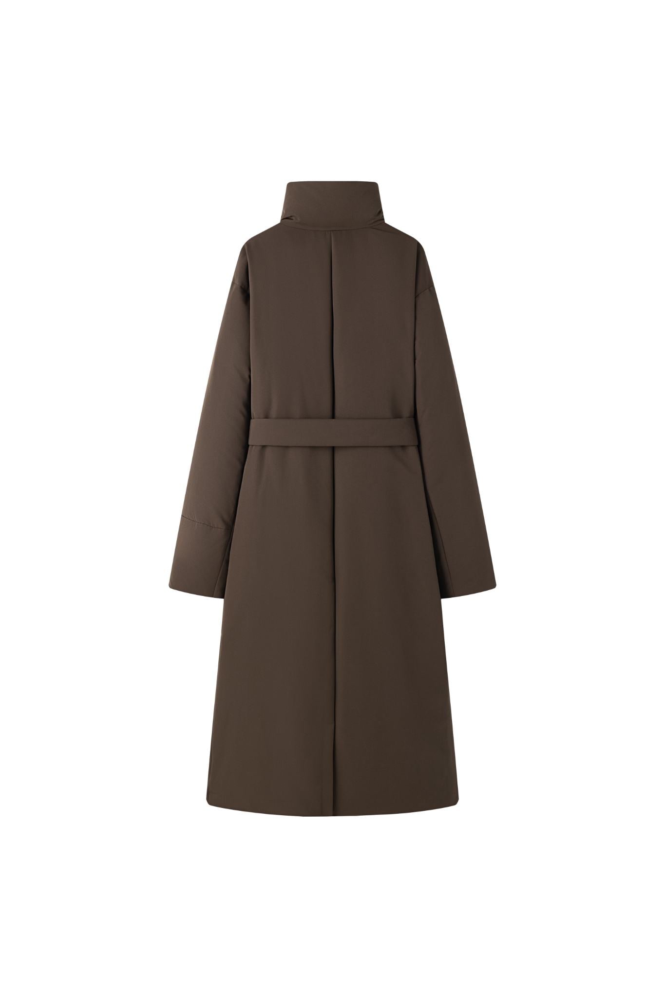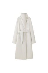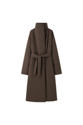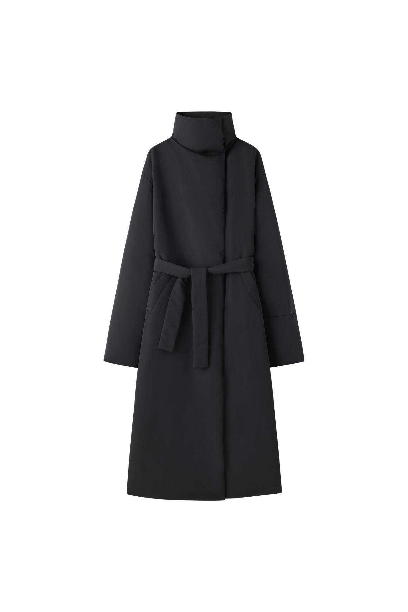 Long Down Jacket, designed for ultimate warmth and style. This jacket features a sleek, minimalist silhouette with a high collar and a detachable belt, knotted at the front for a customi...
