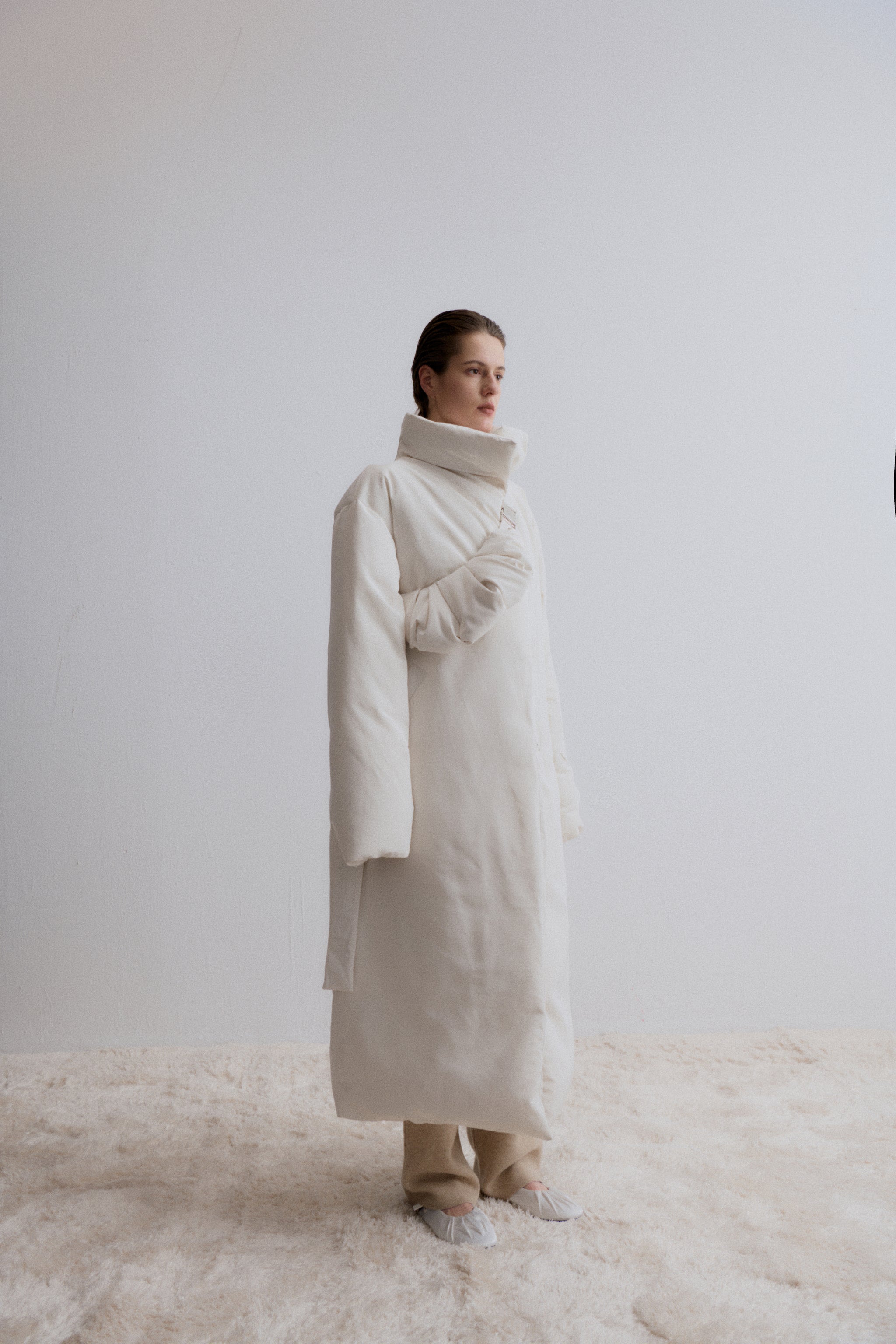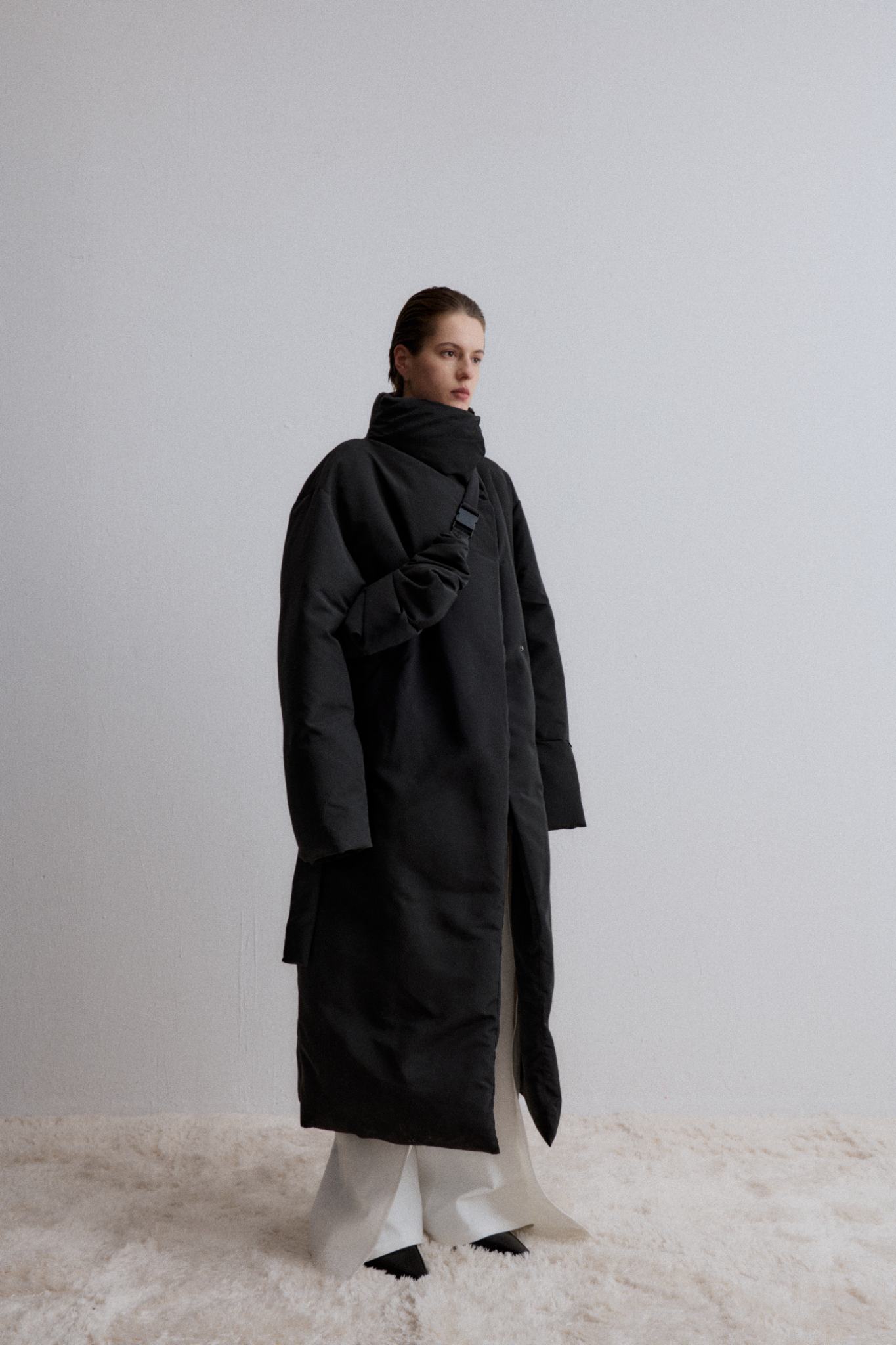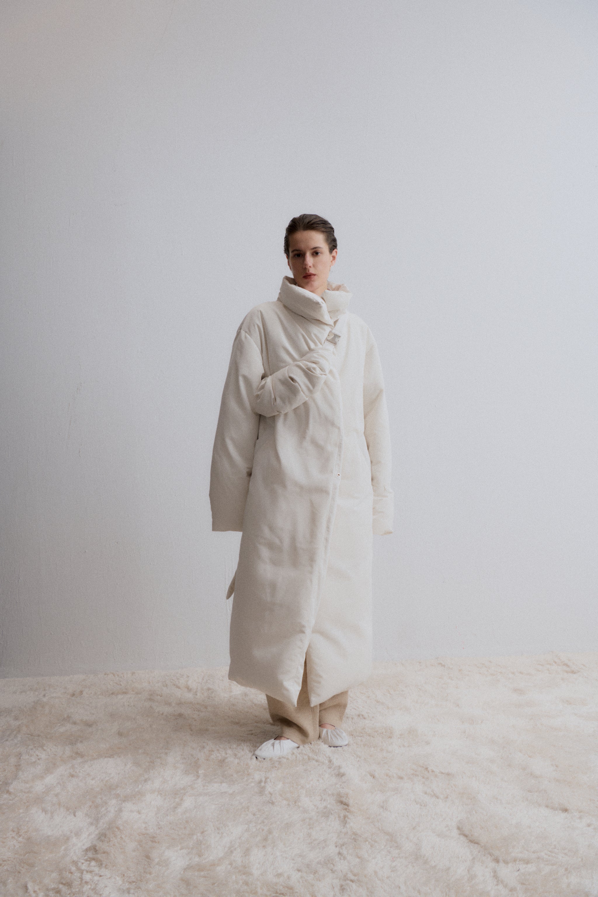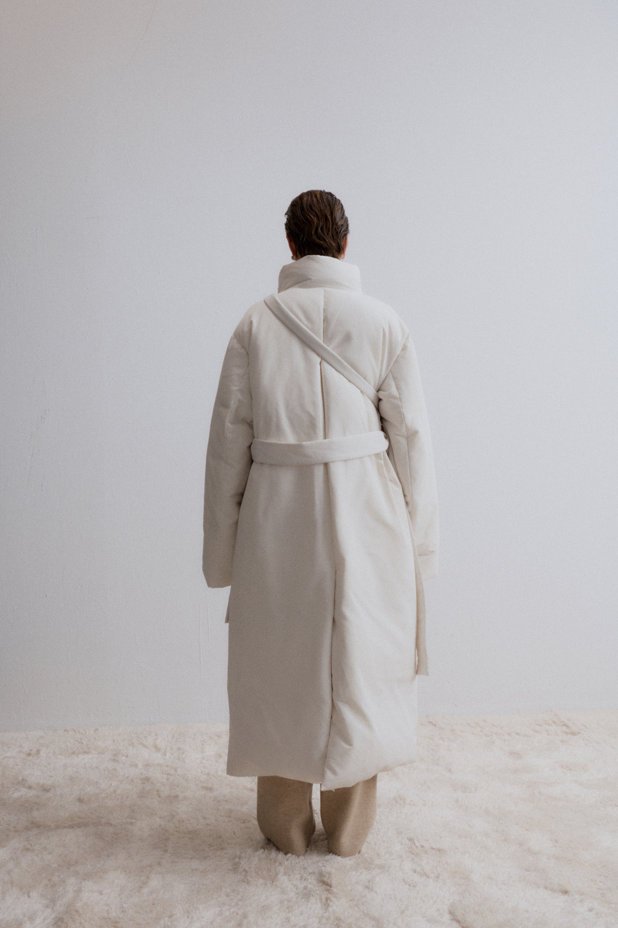 Long Down Jacket, designed for ultimate warmth and style. This jacket features a sleek, minimalist silhouette with a high collar and a detachable belt, knotted at the front for a customi...