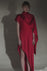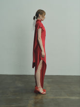 This gown is a bold red, asymmetrical design. It features a high neckline with draping that flows over one shoulder like a cape. The dress is fitted with a slight side slit, and its silk...