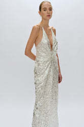 Deep V neck sequin gown with constructed details in the front and open back. Great for all body types and the V neck wont be too deep. The sequins are made in transparent color with glas...