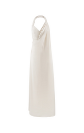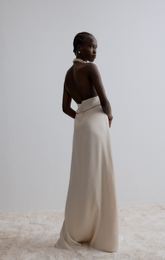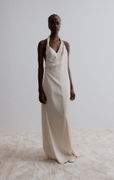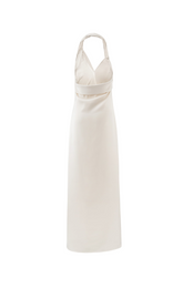 Long, elegant dress with a backless design. It features a halter neck style with a leaf-shaped detail on the chest area. The dress flows gracefully to the floor, creating a sophisticated...