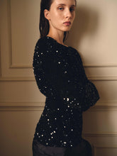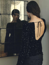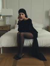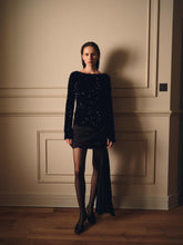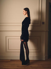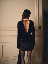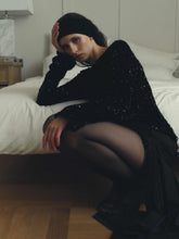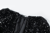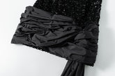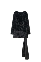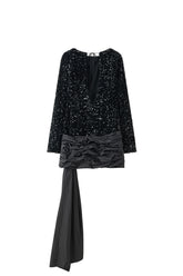 A striking dress featuring a sequined bodice paired with a short, ruched silk taffeta skirt. The asymmetrical draping and long side train create a modern, chic look with a mix of texture...
