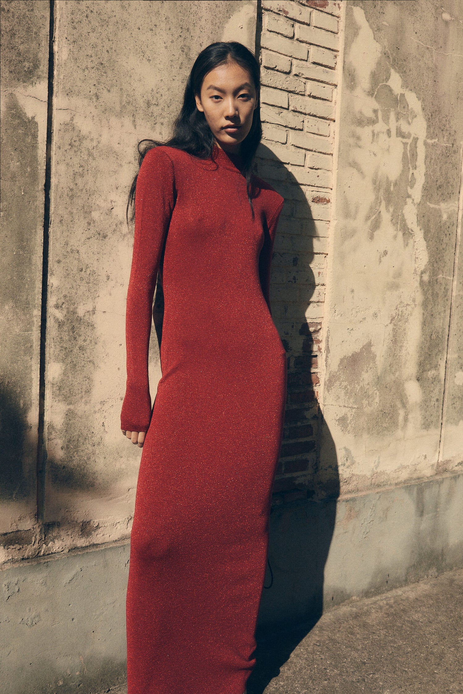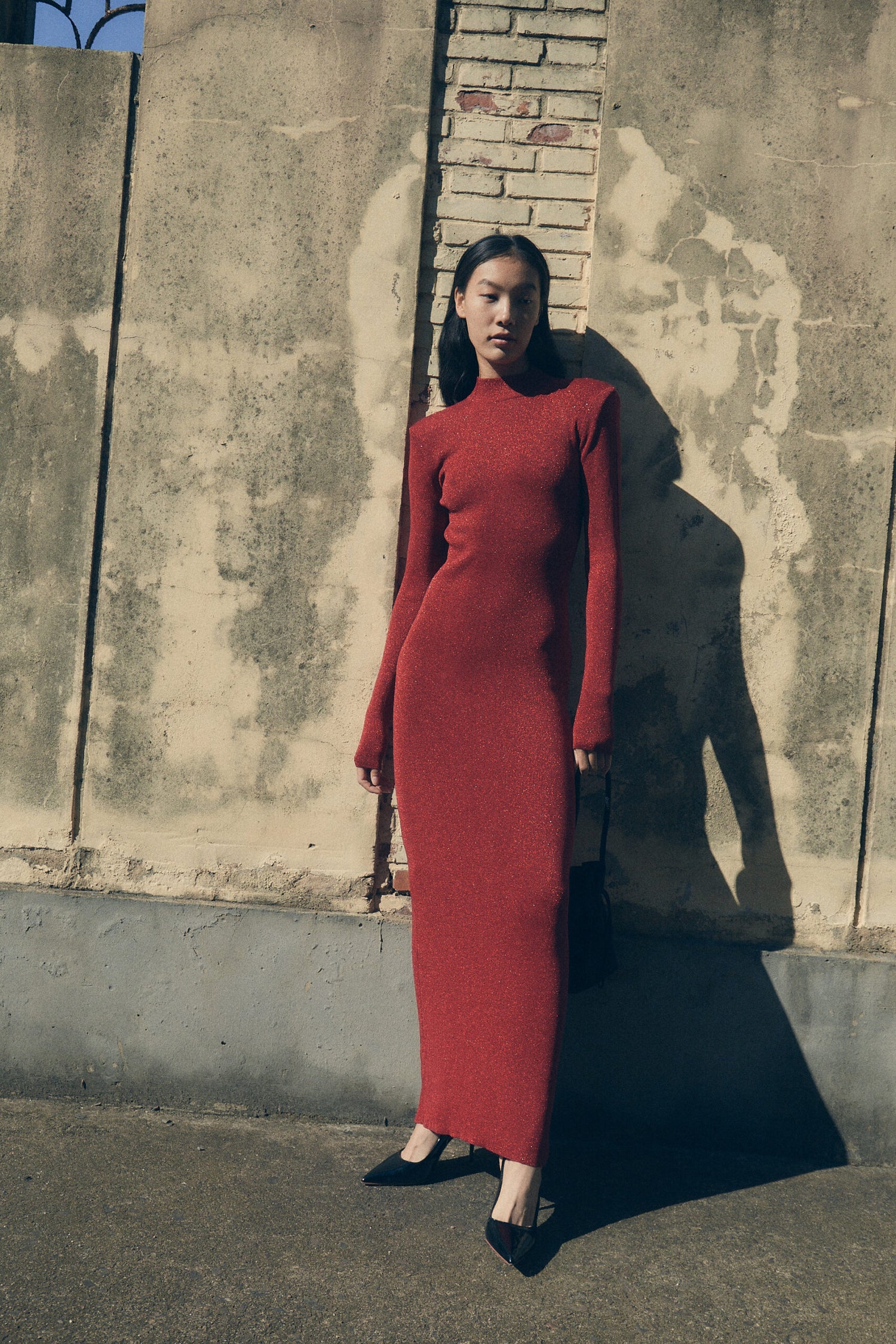 Fitted knit dress with shoulder pads, slim sleeves and open back. Make a smashing figure! Made in a sparkled fabric that is super beautiful for the winter parties. Style with high heels ...