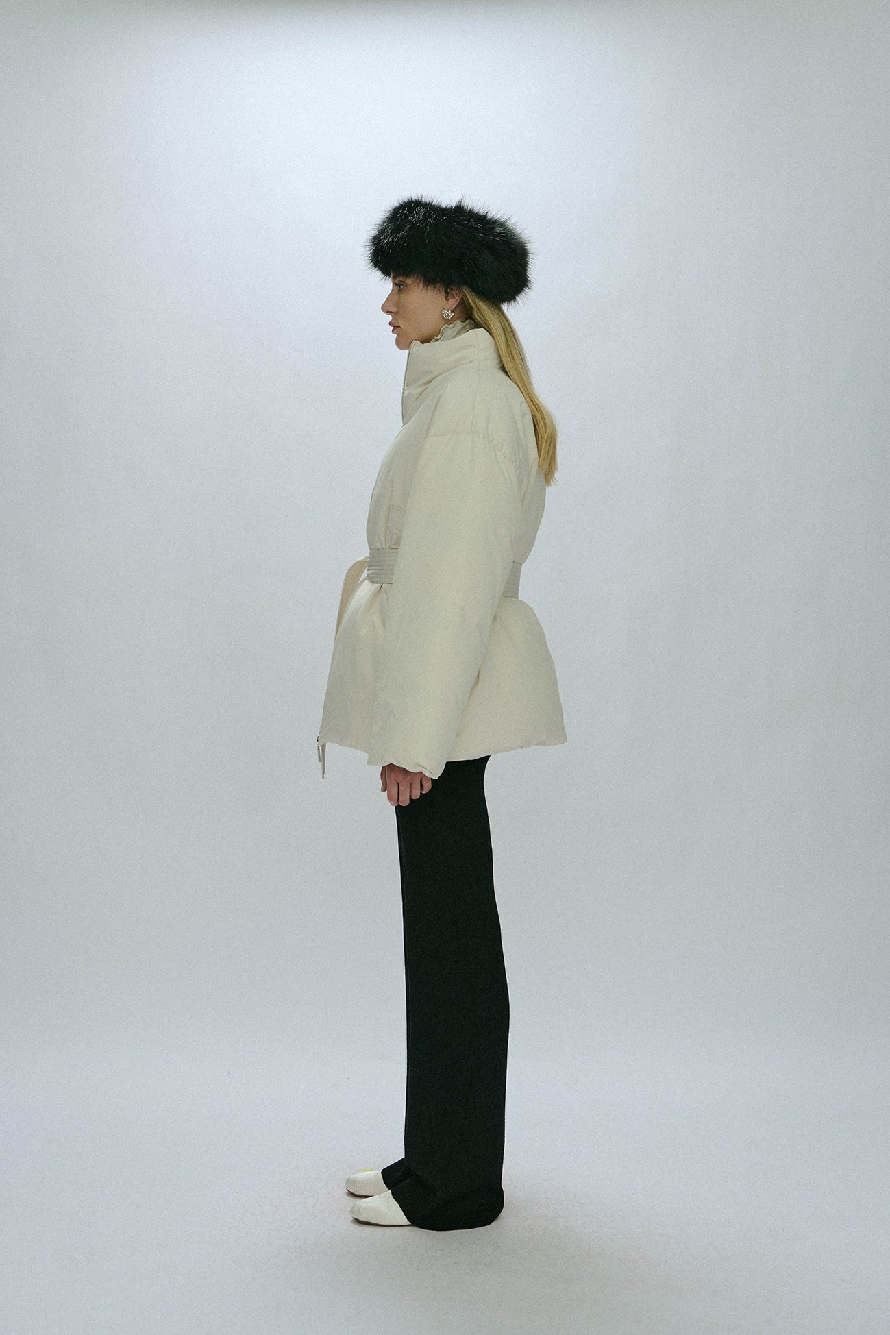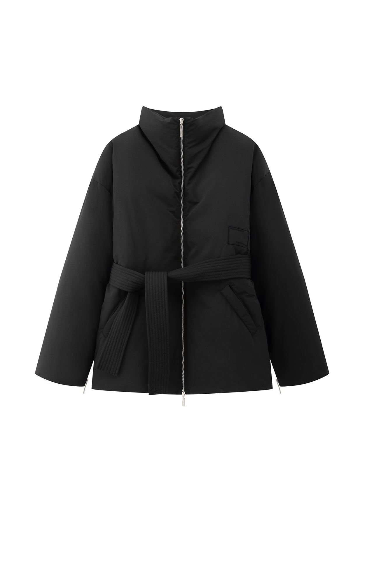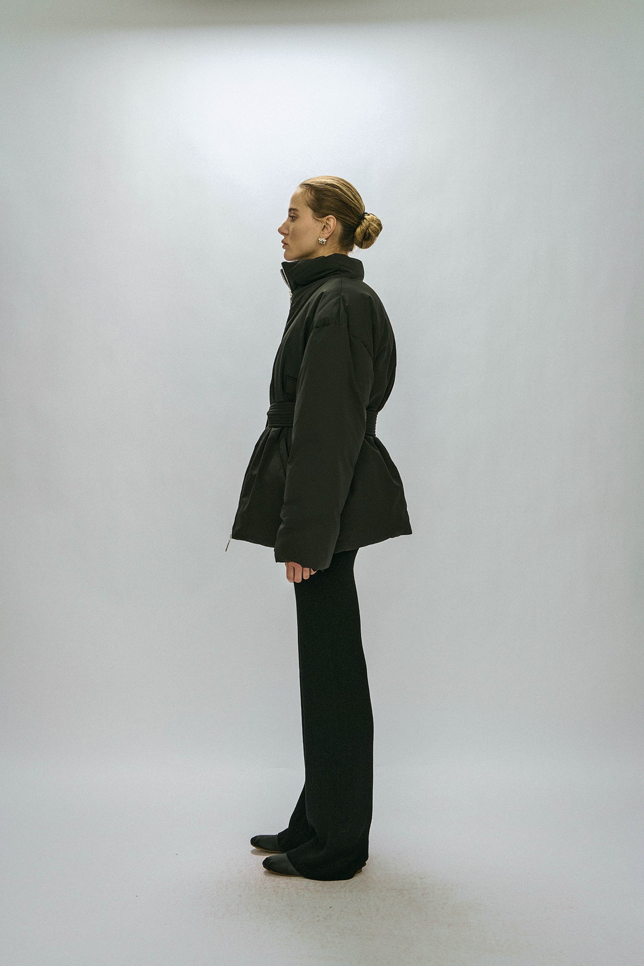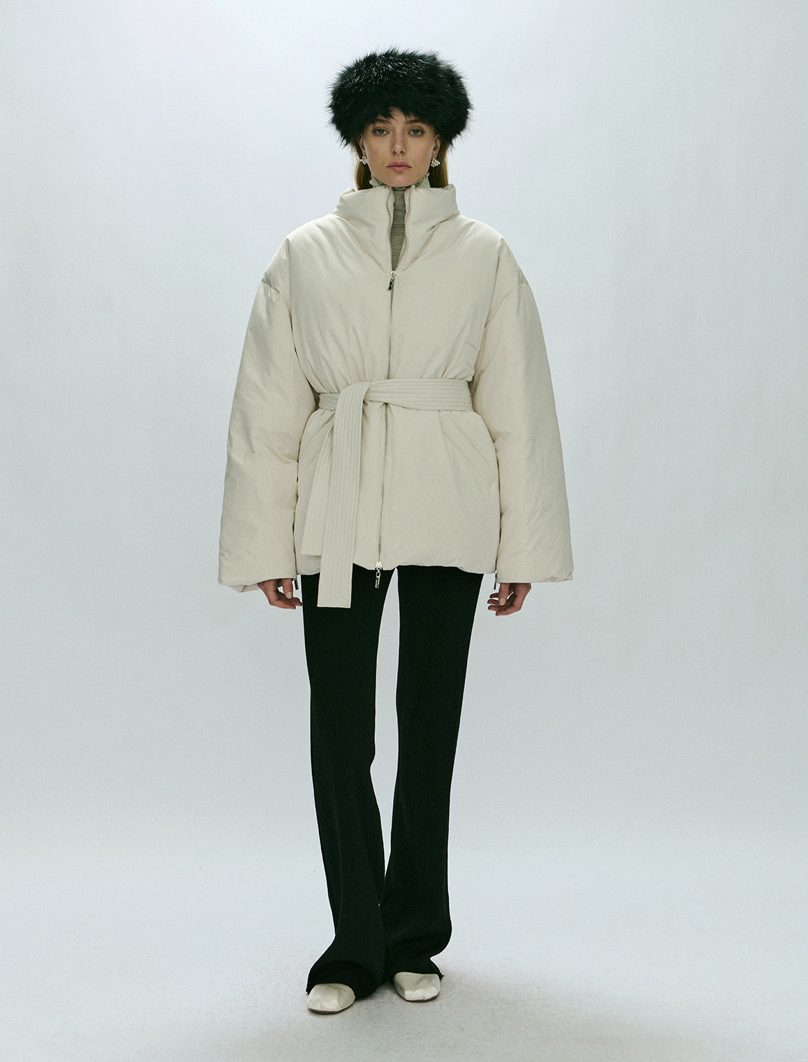 Minimal down jacket with two ways zipper, wide waist belt with sewn lines. Mid raise neckline that's supposed to be worn a bit open. Wide sleeves with zipper.