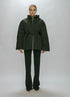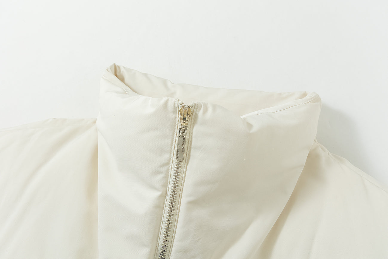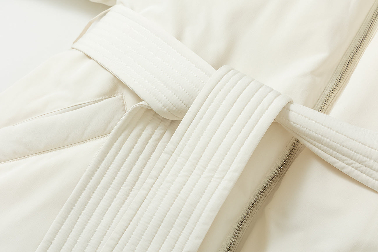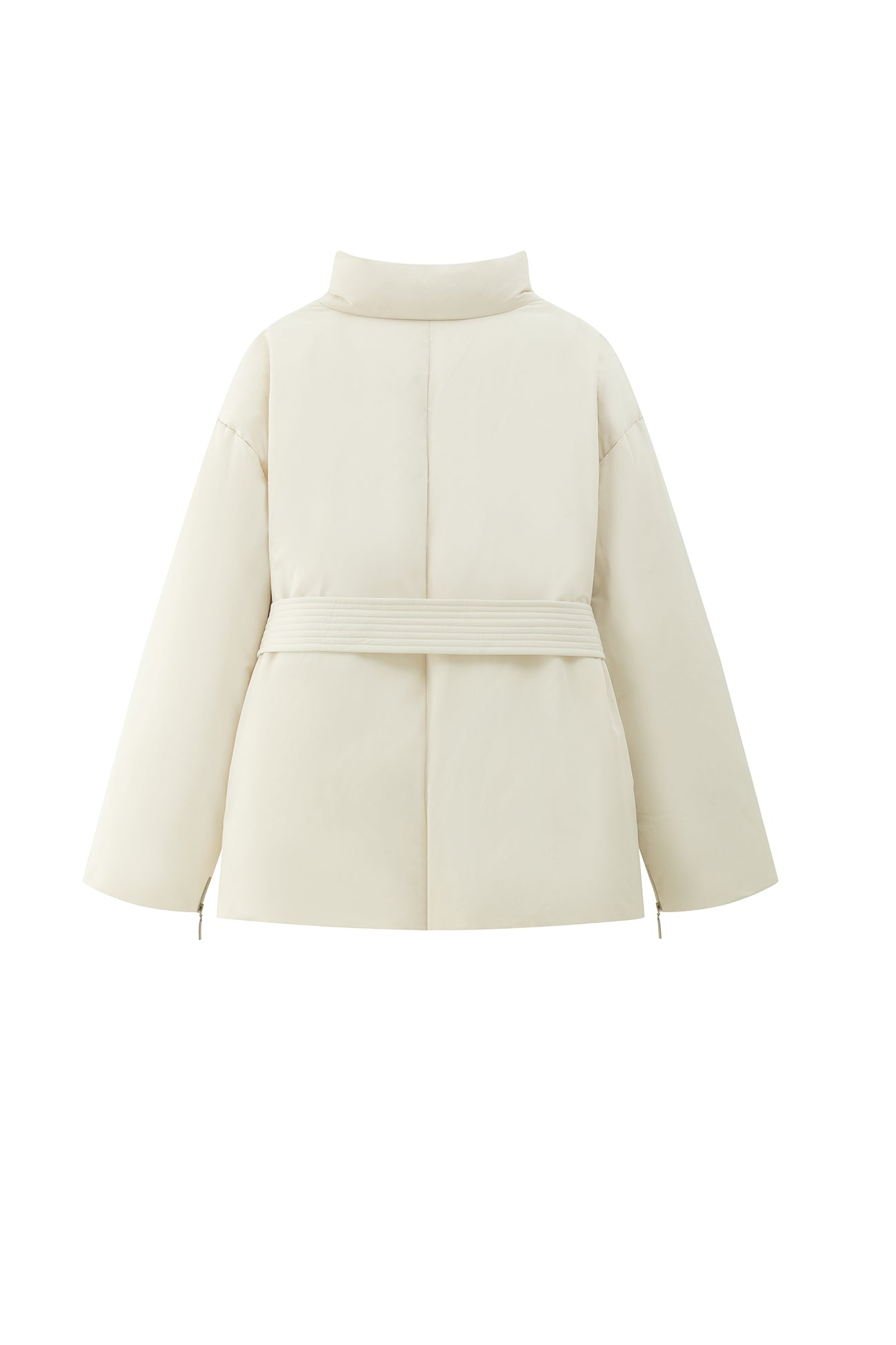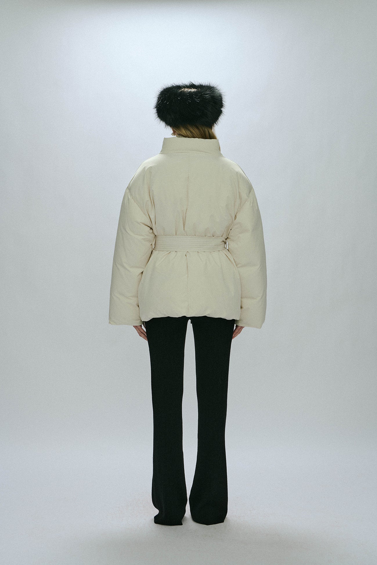 Minimal down jacket with two ways zipper, wide waist belt with sewn lines. Mid raise neckline that's supposed to be worn a bit open. Wide sleeves with zipper.