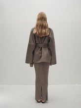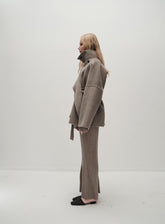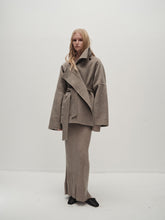 Midi length double sided coat with folded front collar to be worn folded or buttoned. Side pockets.