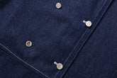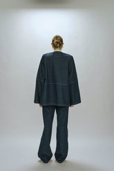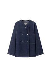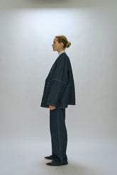 Oversized jeans jacket in midi style great for early autumns. Doubled breasted with a small V neck line. Pockets in the front and wide sleeves. Oversized in style. Made in a special made...