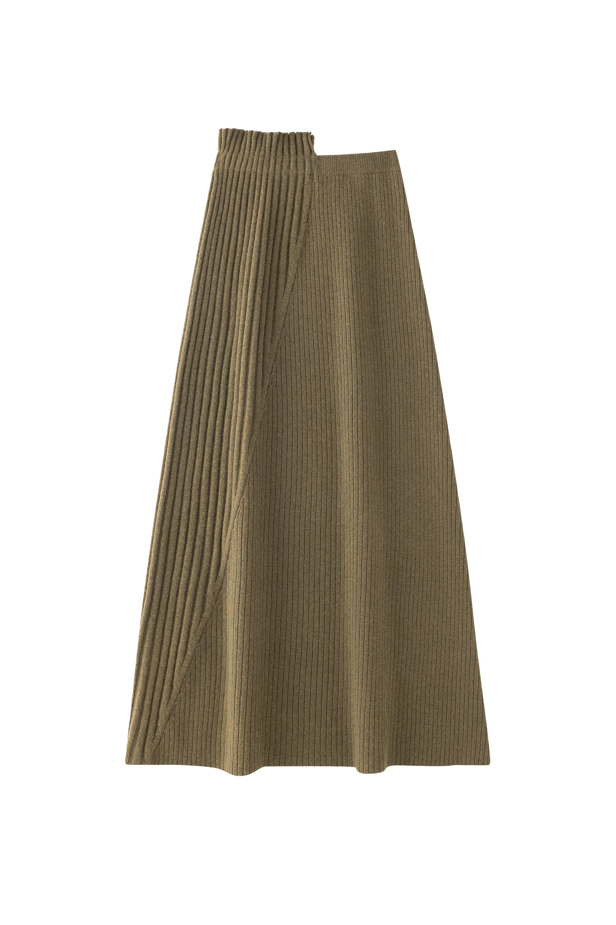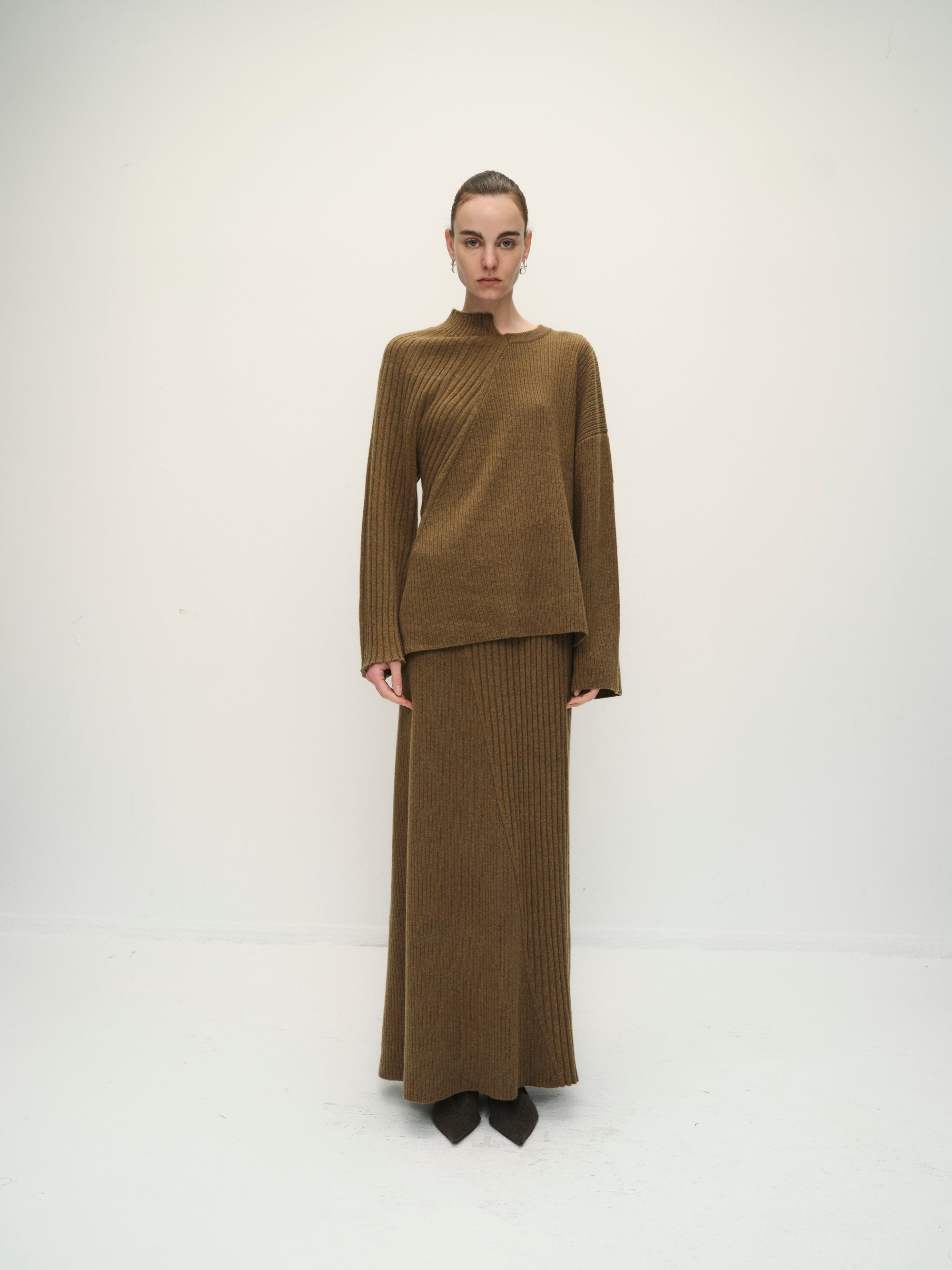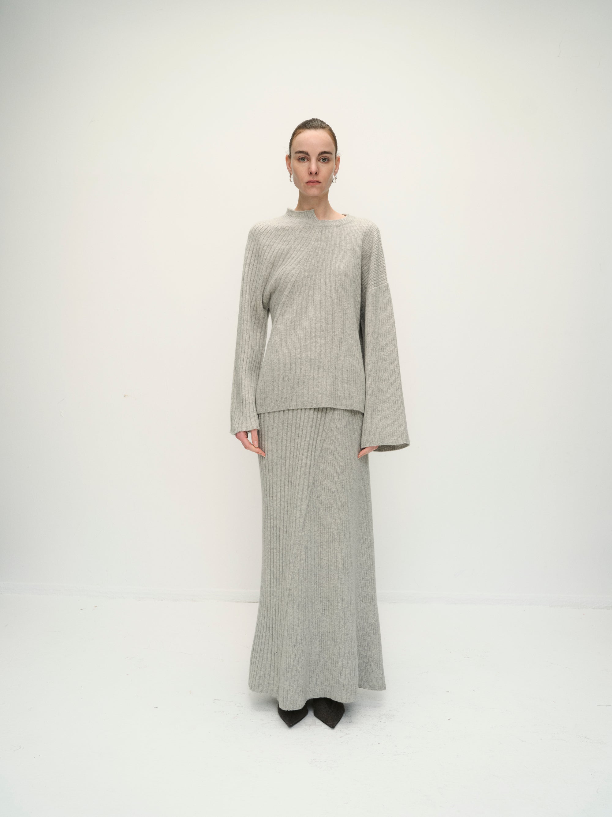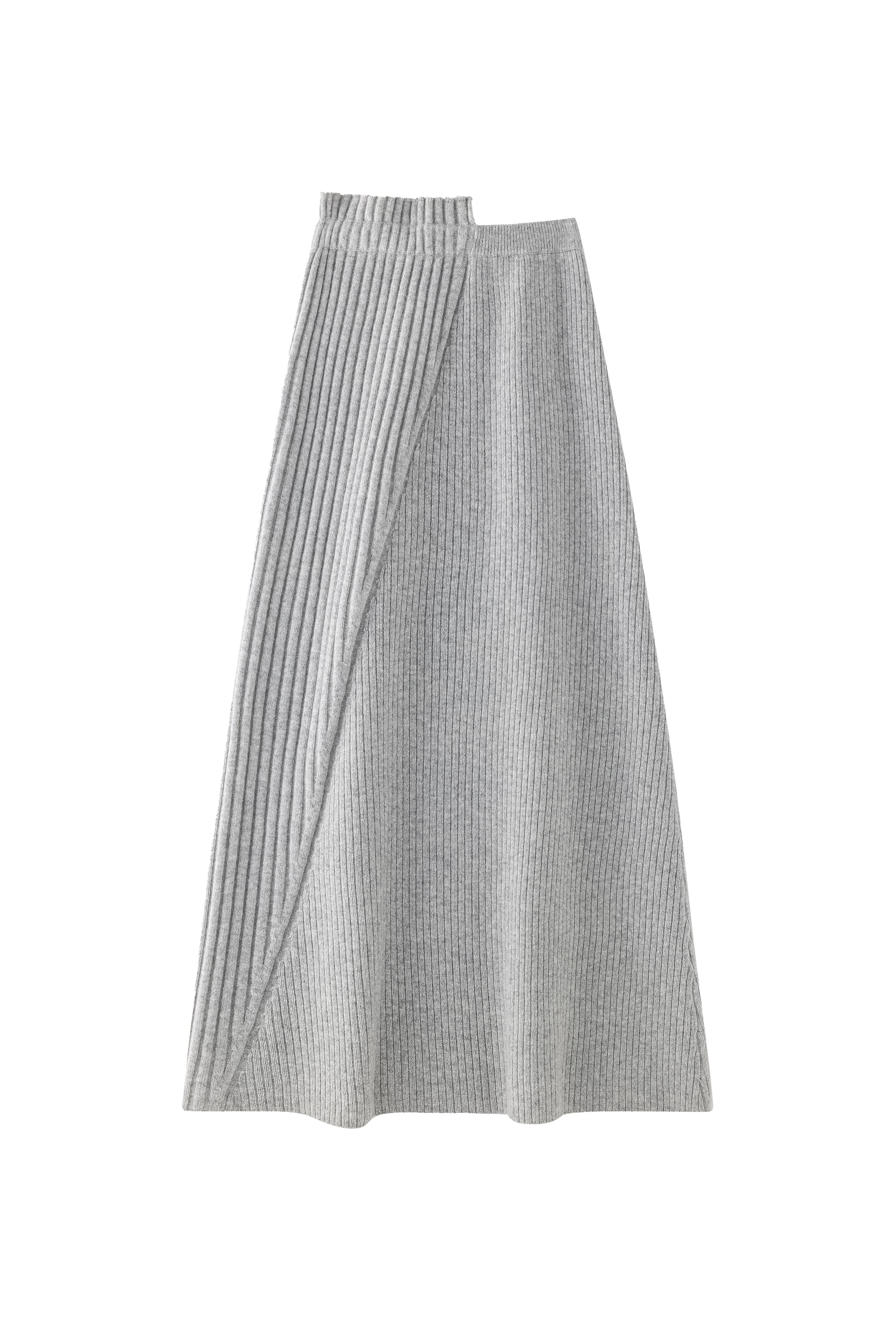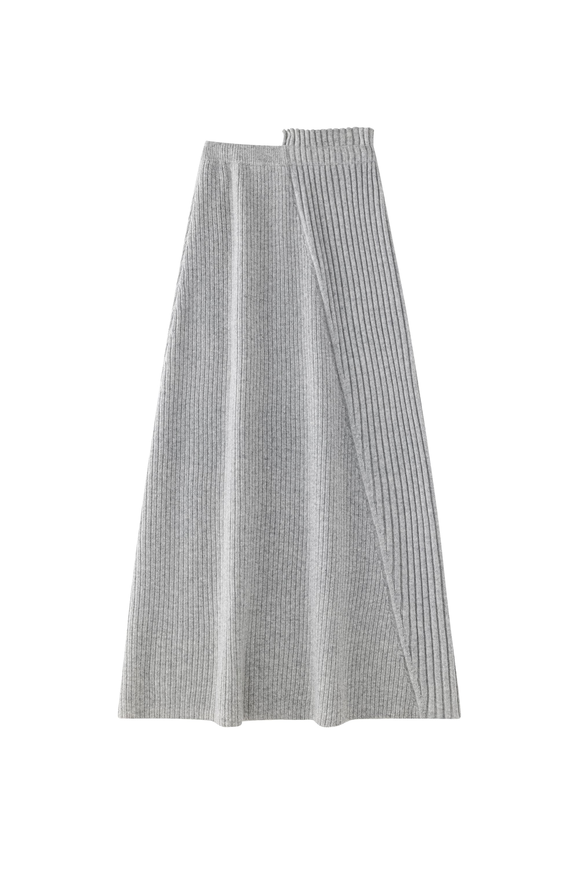100% wool long knit skirt with a ribbed pattern throughout. The ribbed pattern follows an asymmetrical design, adding texture and sculptural structure