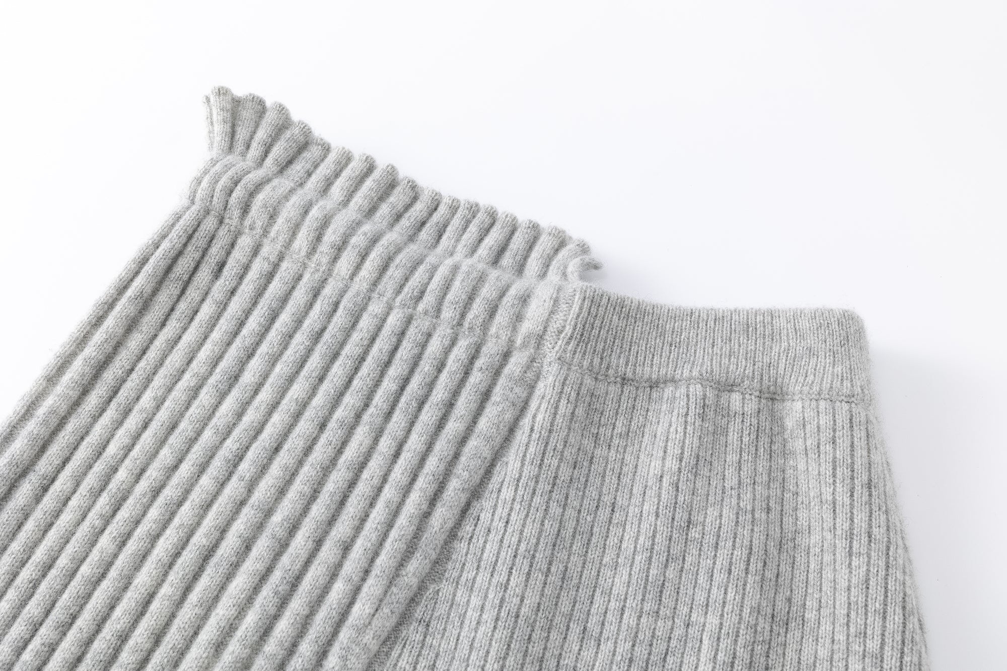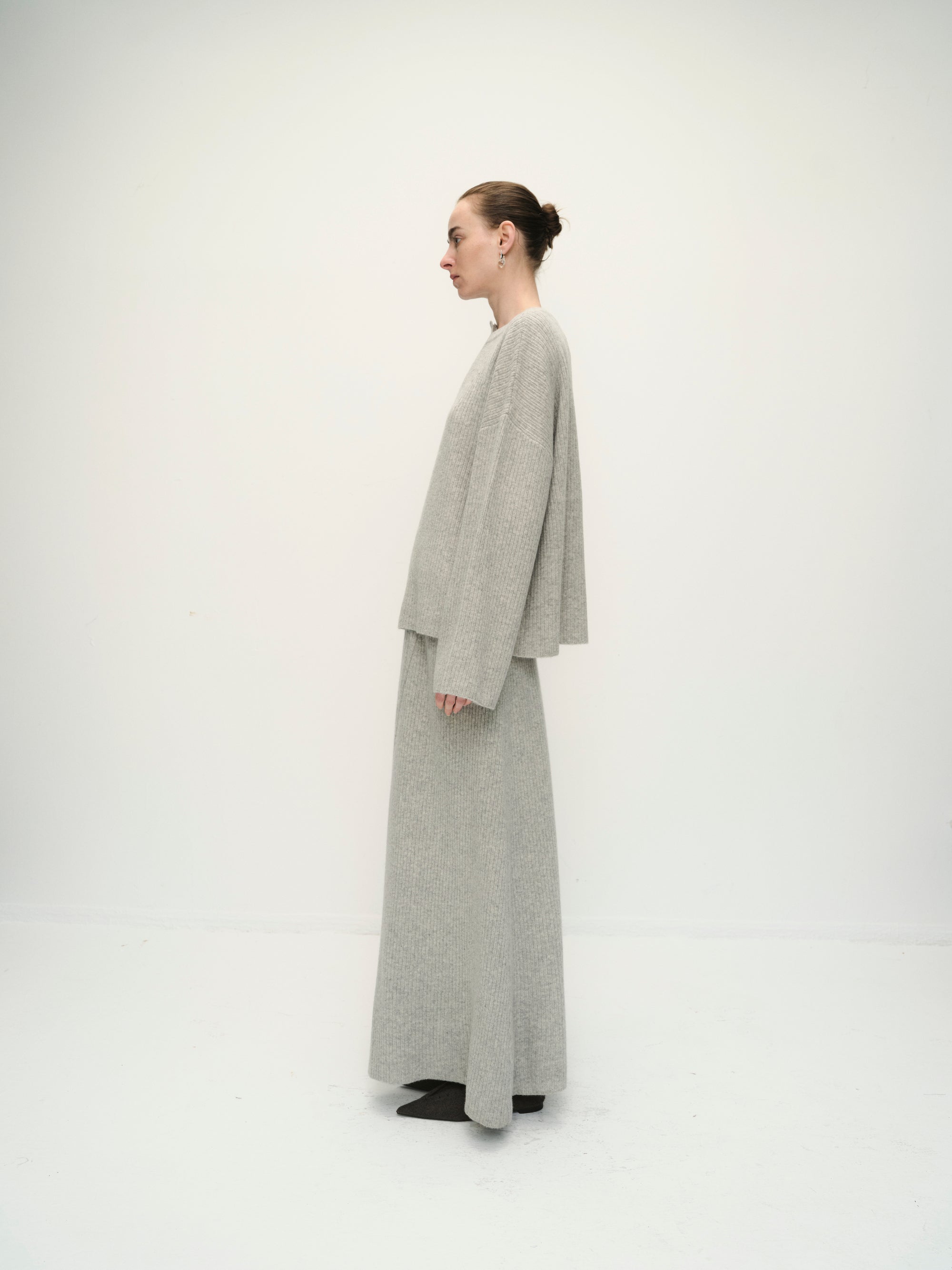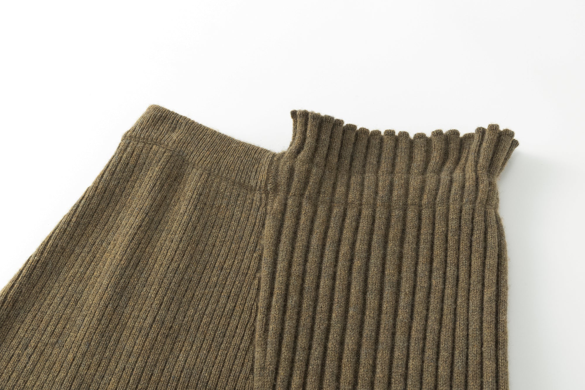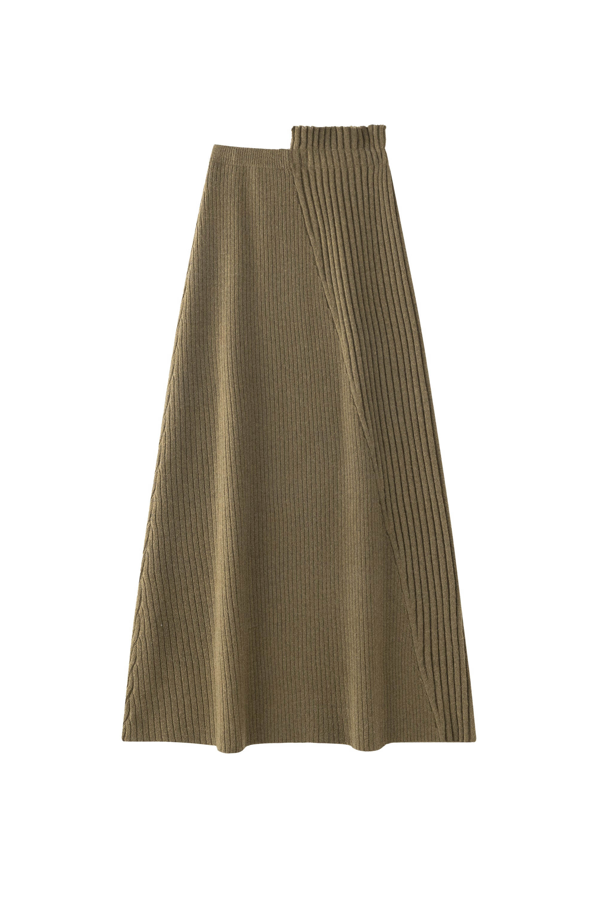 100% wool long knit skirt with a ribbed pattern throughout. The ribbed pattern follows an asymmetrical design, adding texture and sculptural structure