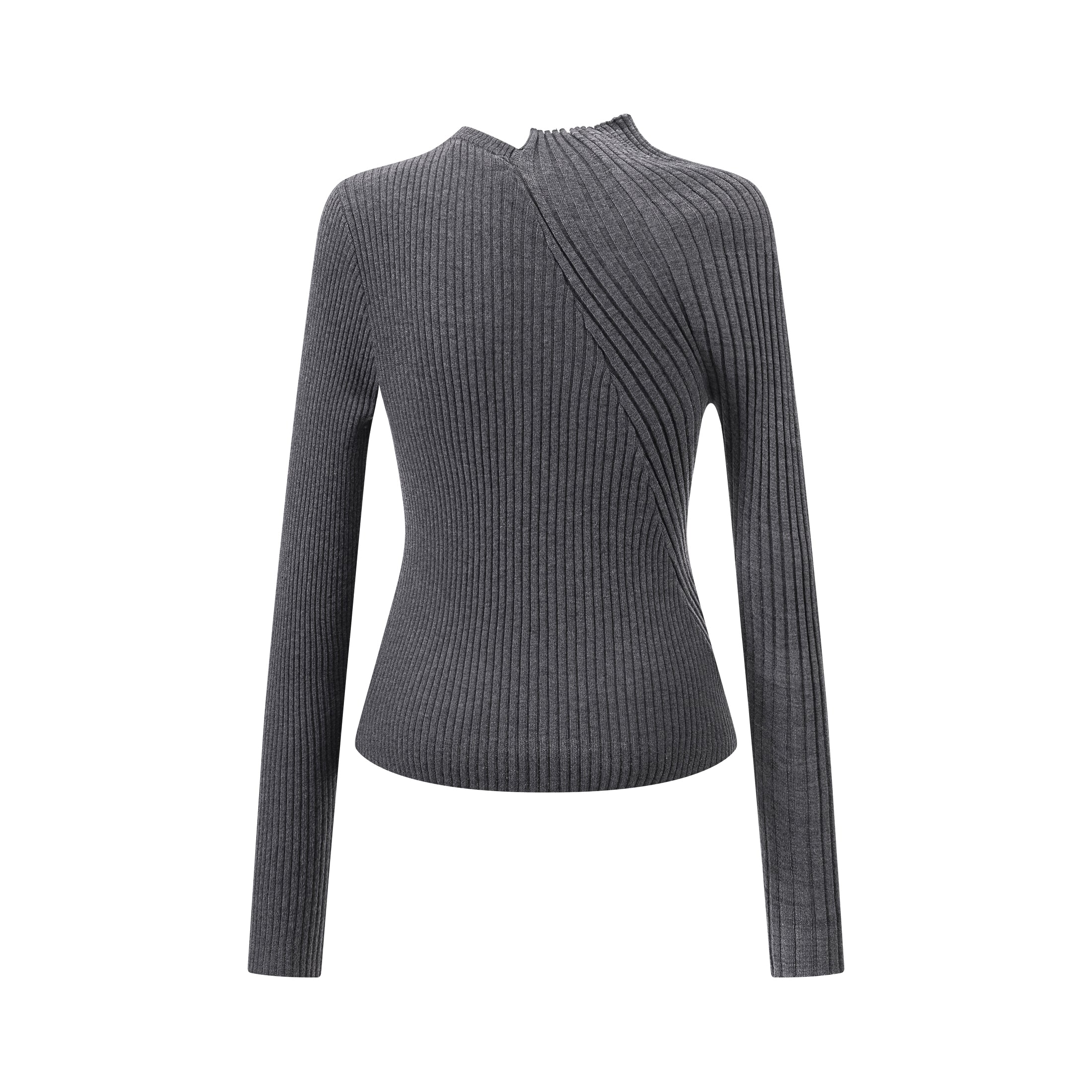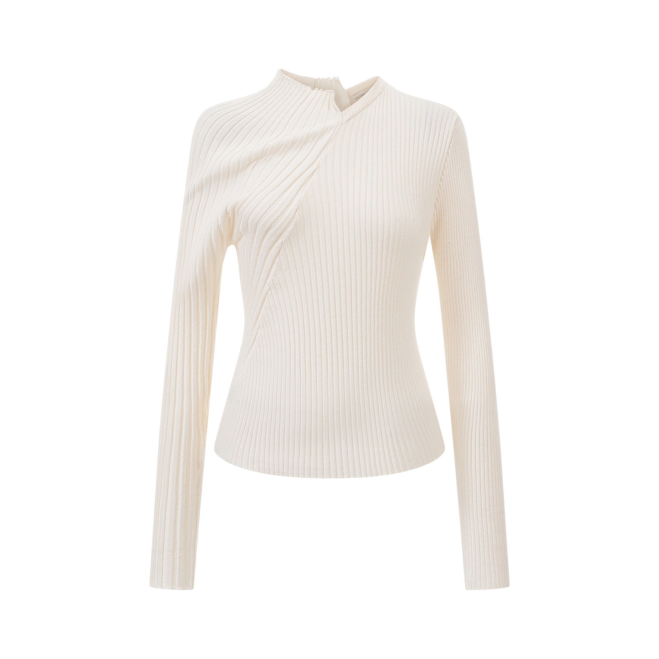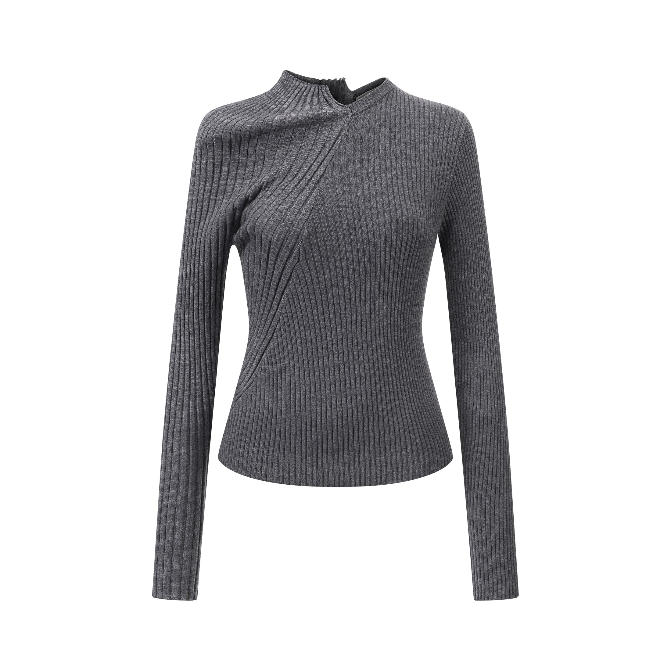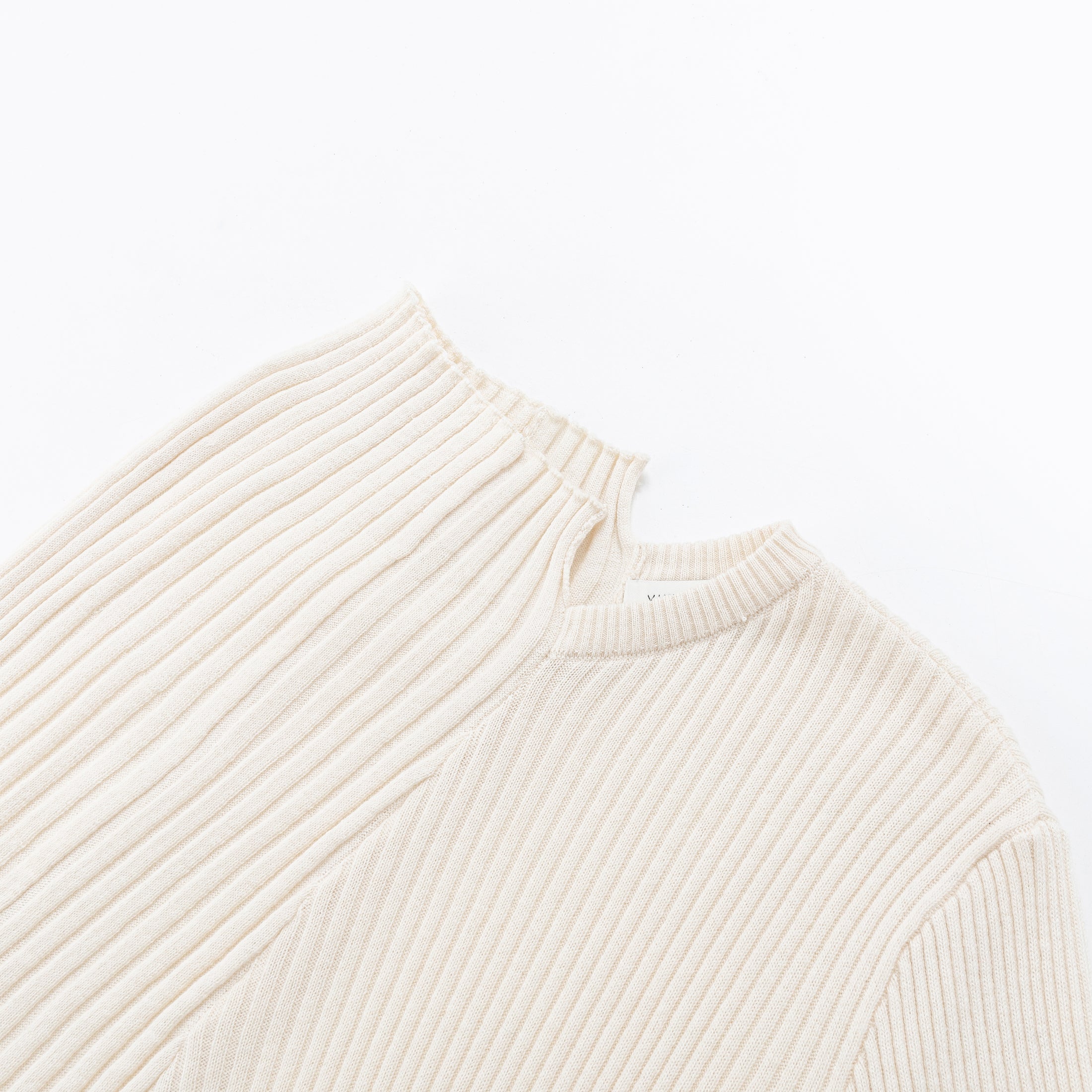 Fitted ribbed knit top with asymmetrical diagonal pattern across the front. The neckline is open with a slit for a modern, minimalistic look.