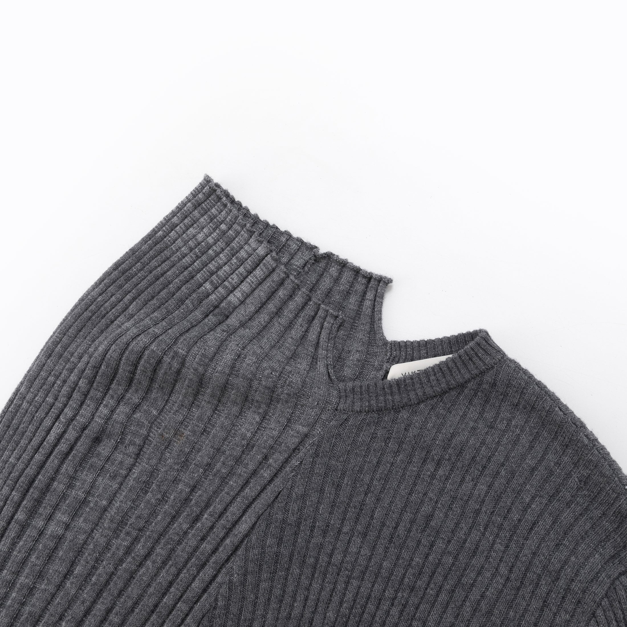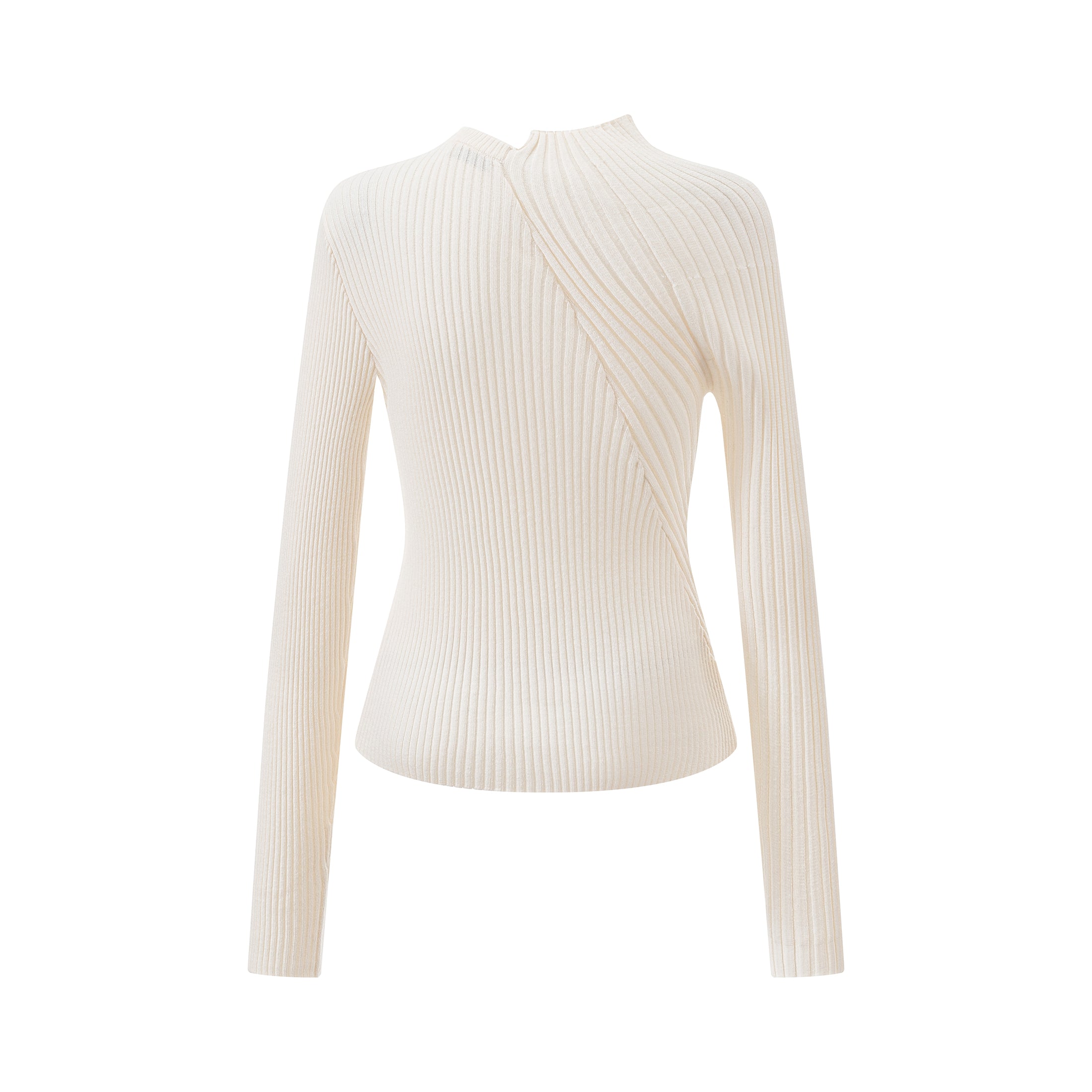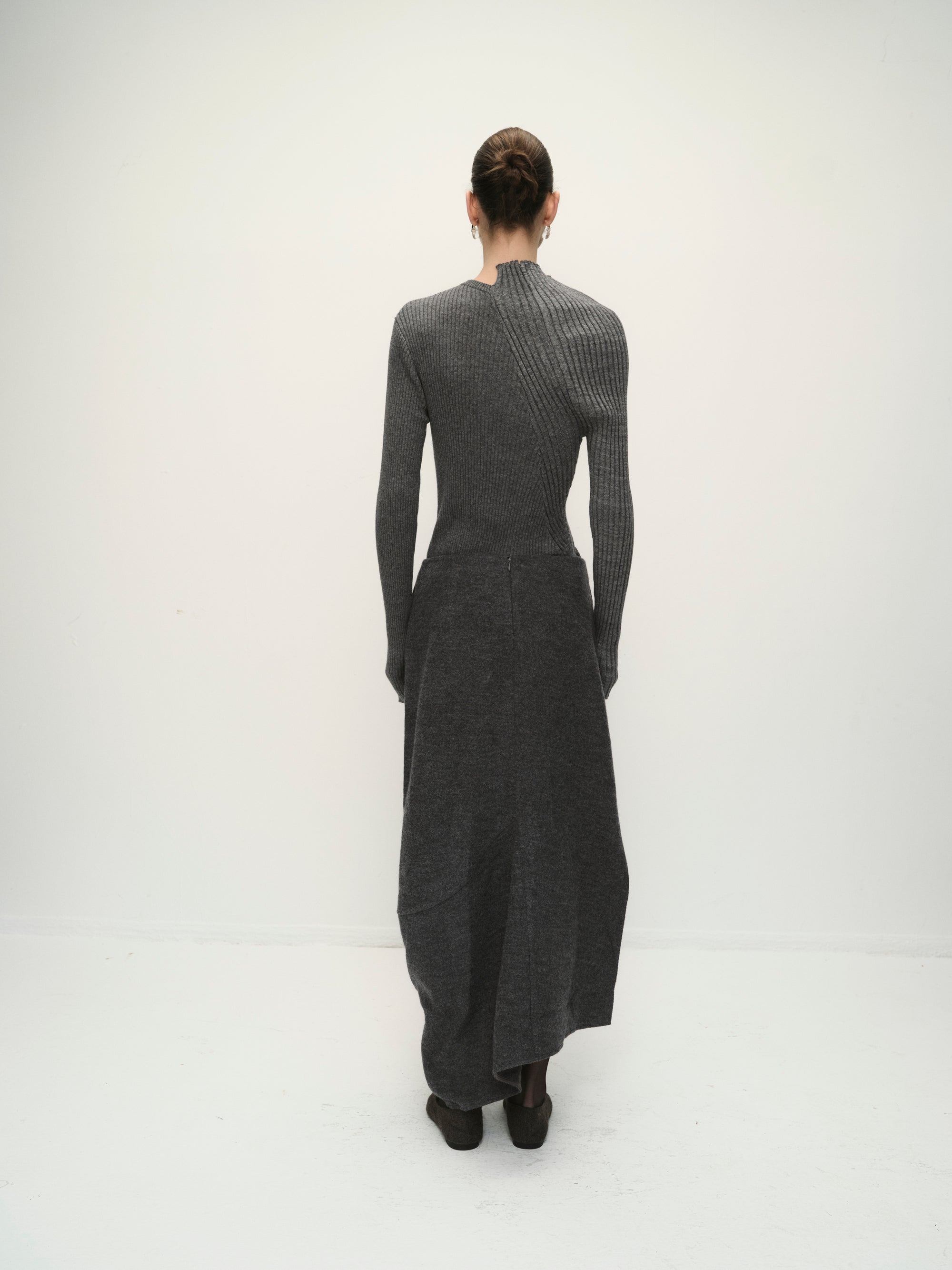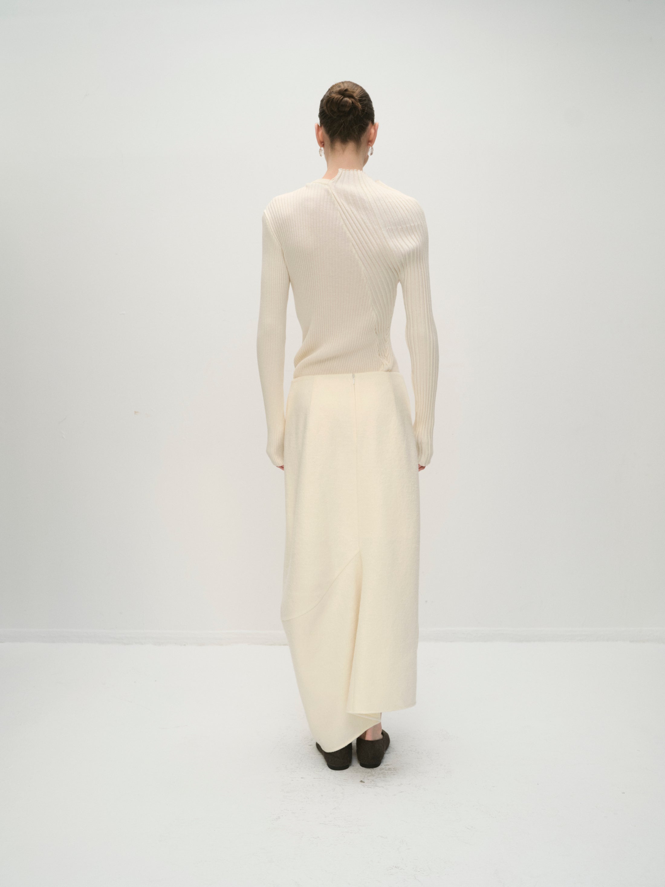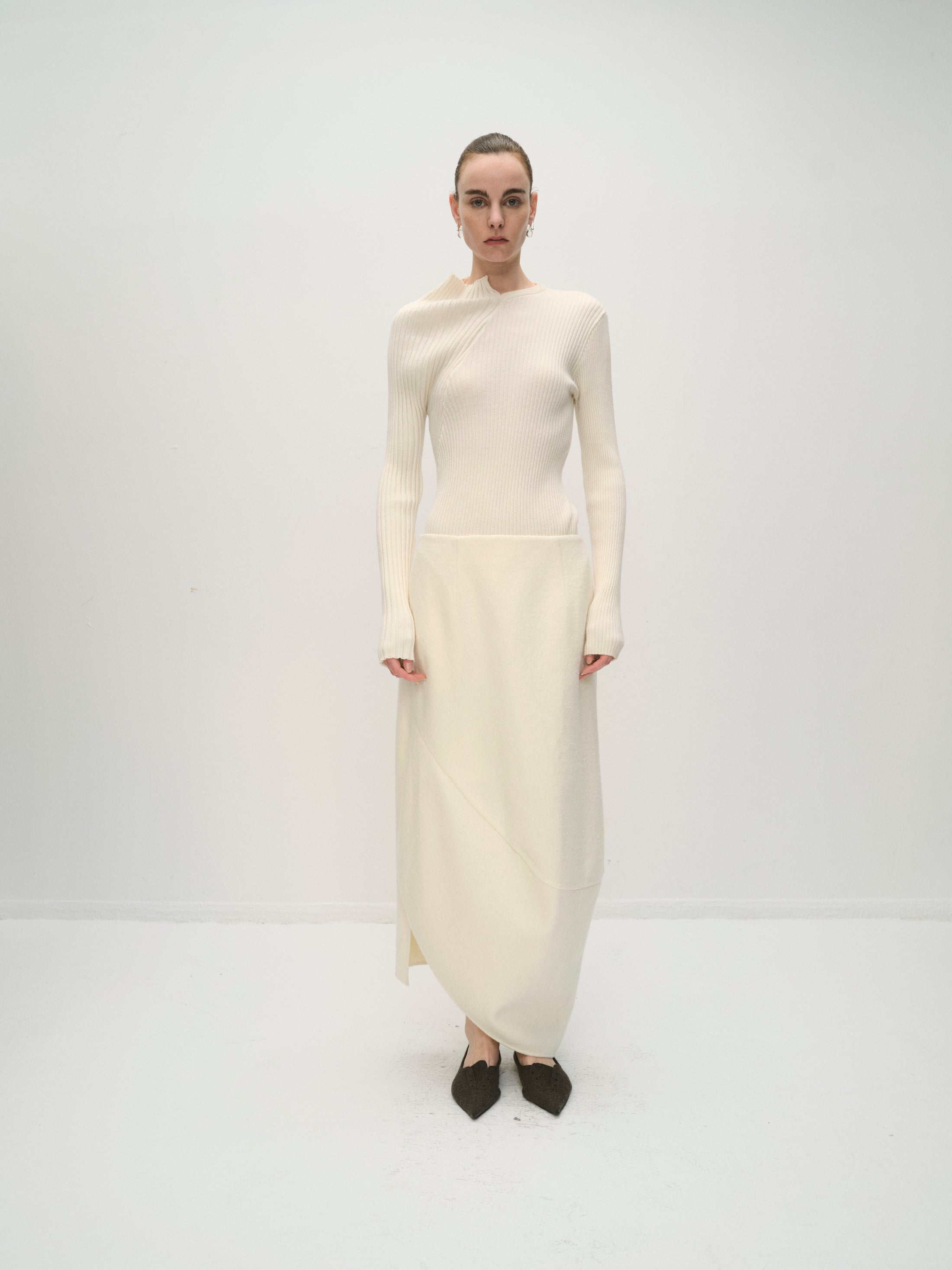 Fitted ribbed knit top with asymmetrical diagonal pattern across the front. The neckline is open with a slit for a modern, minimalistic look.