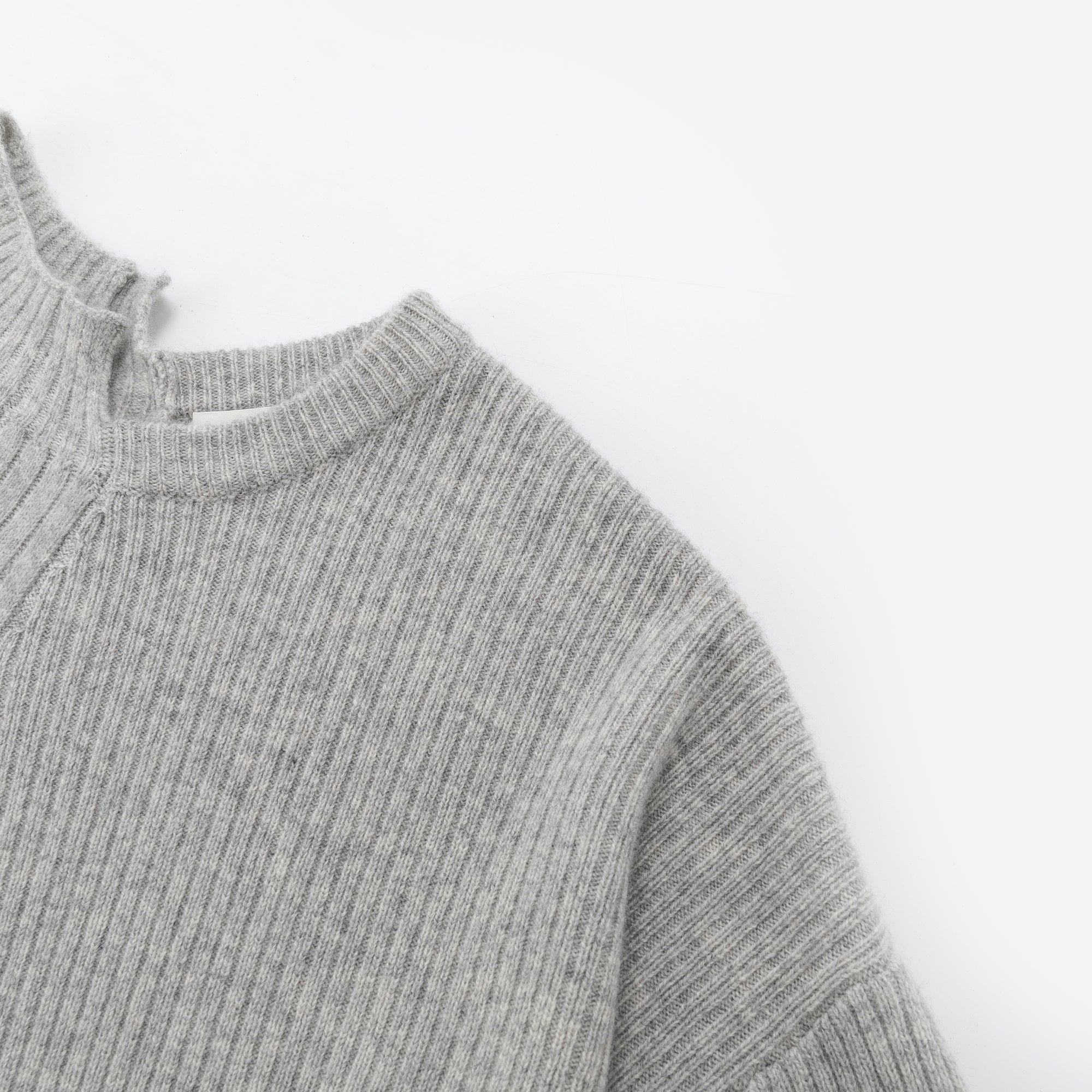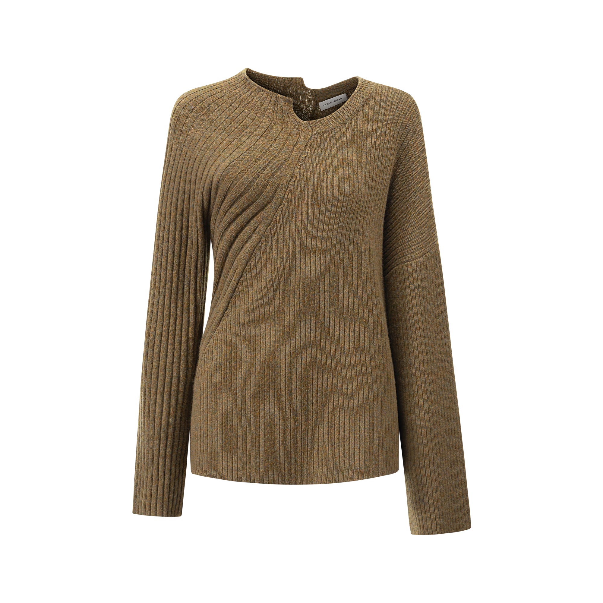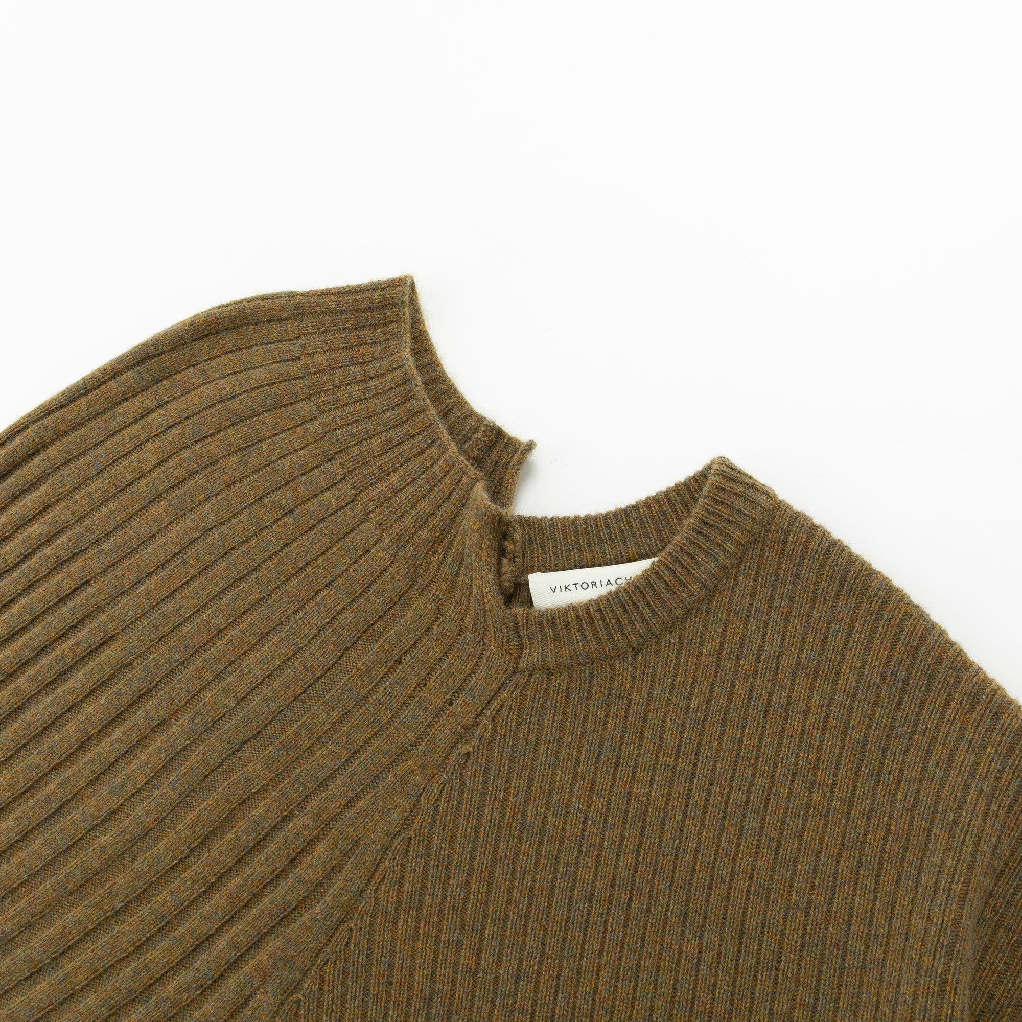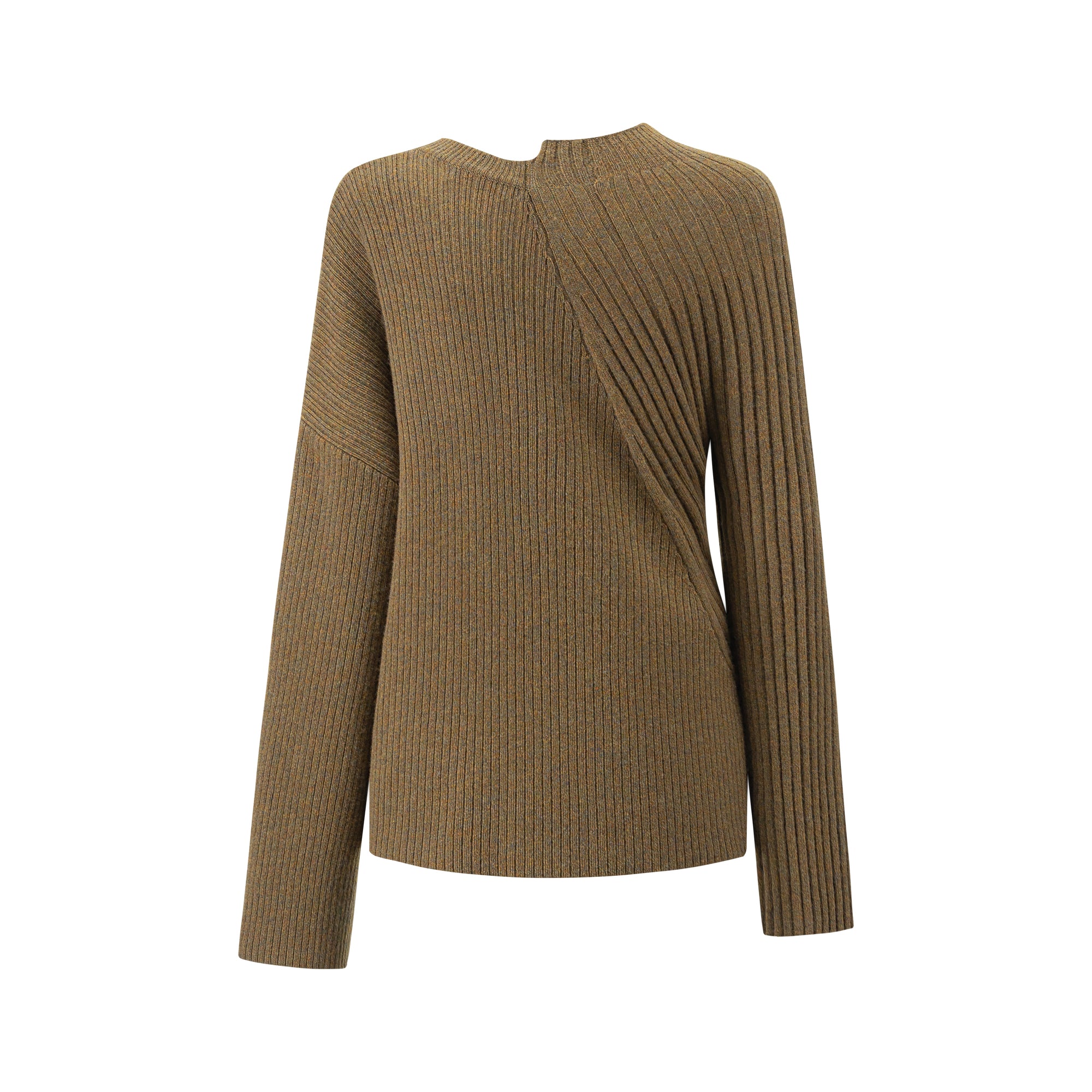 100% wool long-sleeve knit featuring a unique asymmetrical neckline with a subtle cutout detail. The ribbed pattern follows an asymmetrical design, adding texture and sculptural structur...