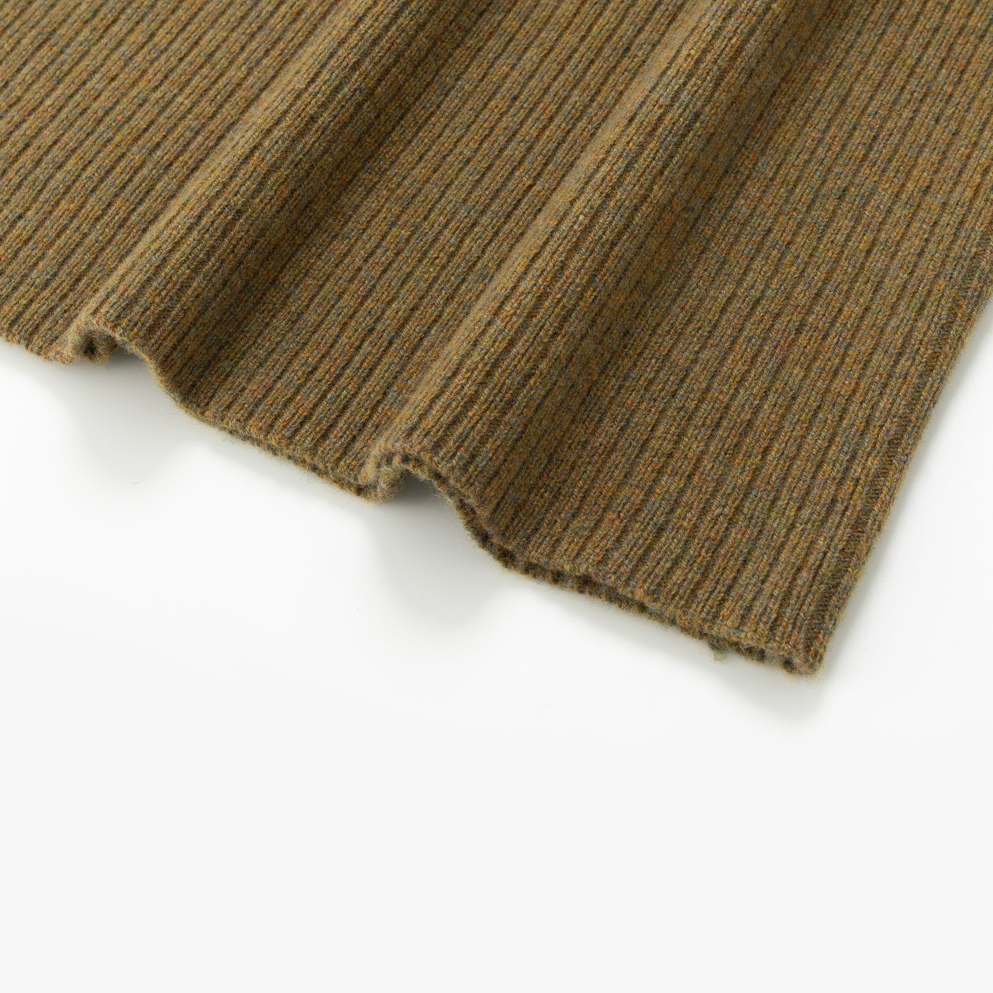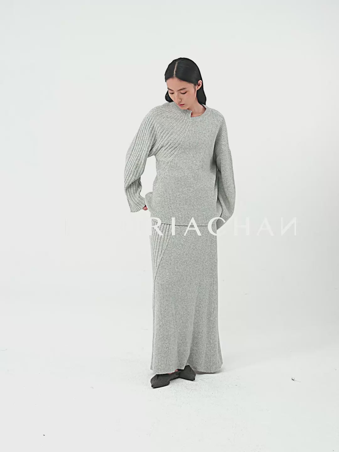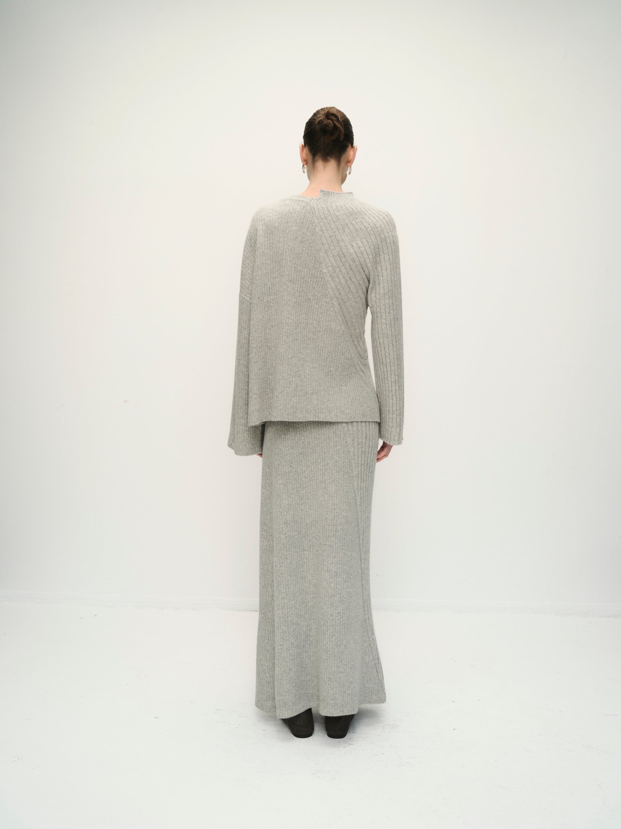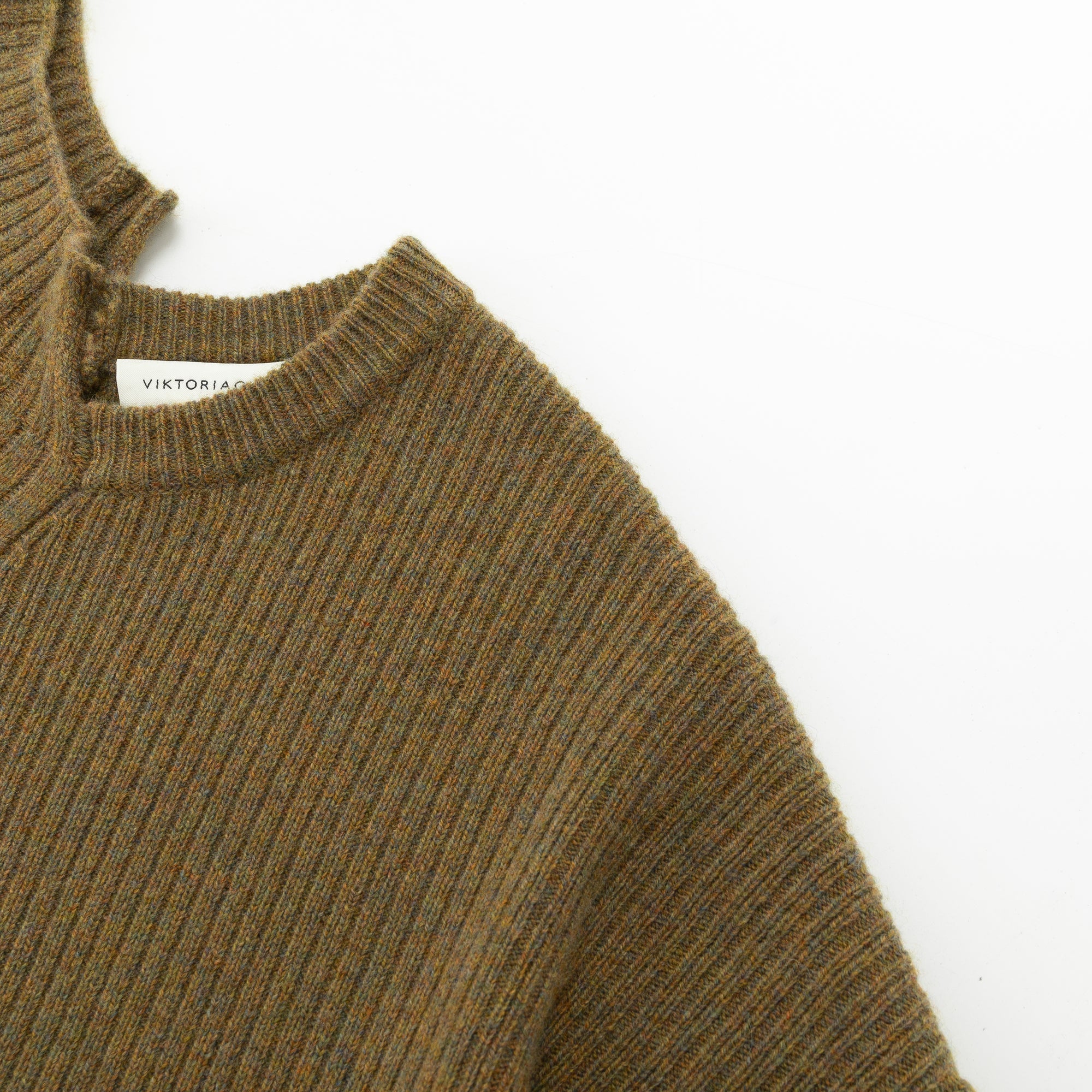 100% wool long-sleeve knit featuring a unique asymmetrical neckline with a subtle cutout detail. The ribbed pattern follows an asymmetrical design, adding texture and sculptural structur...