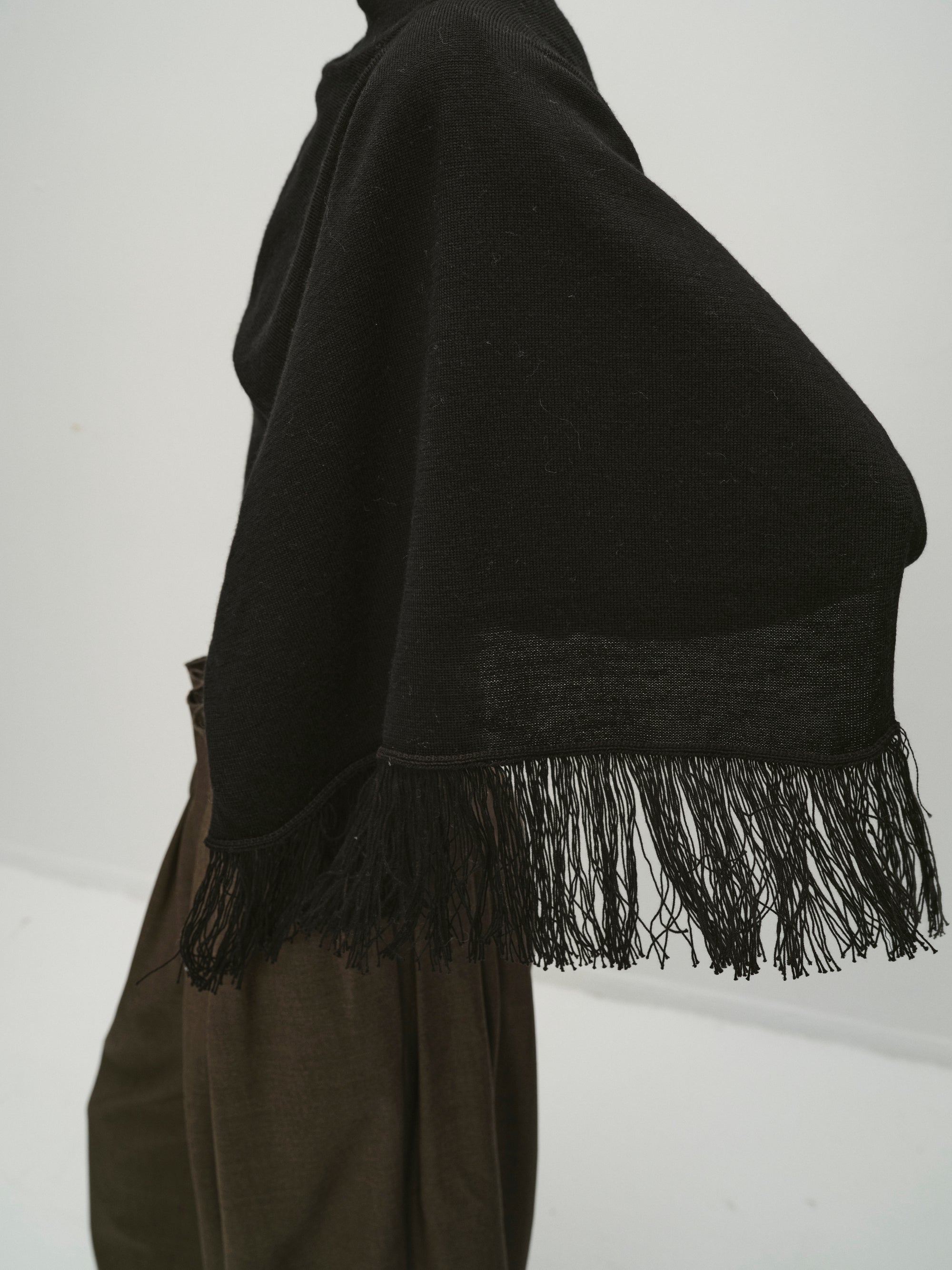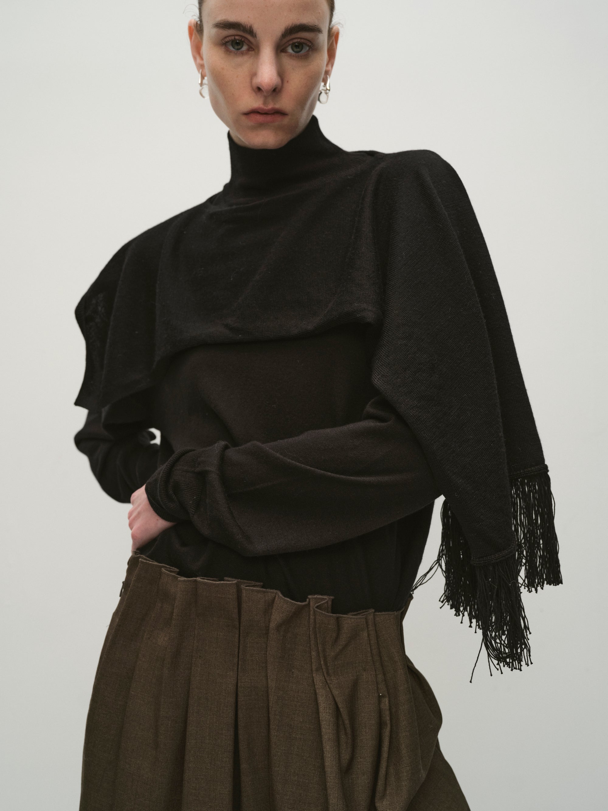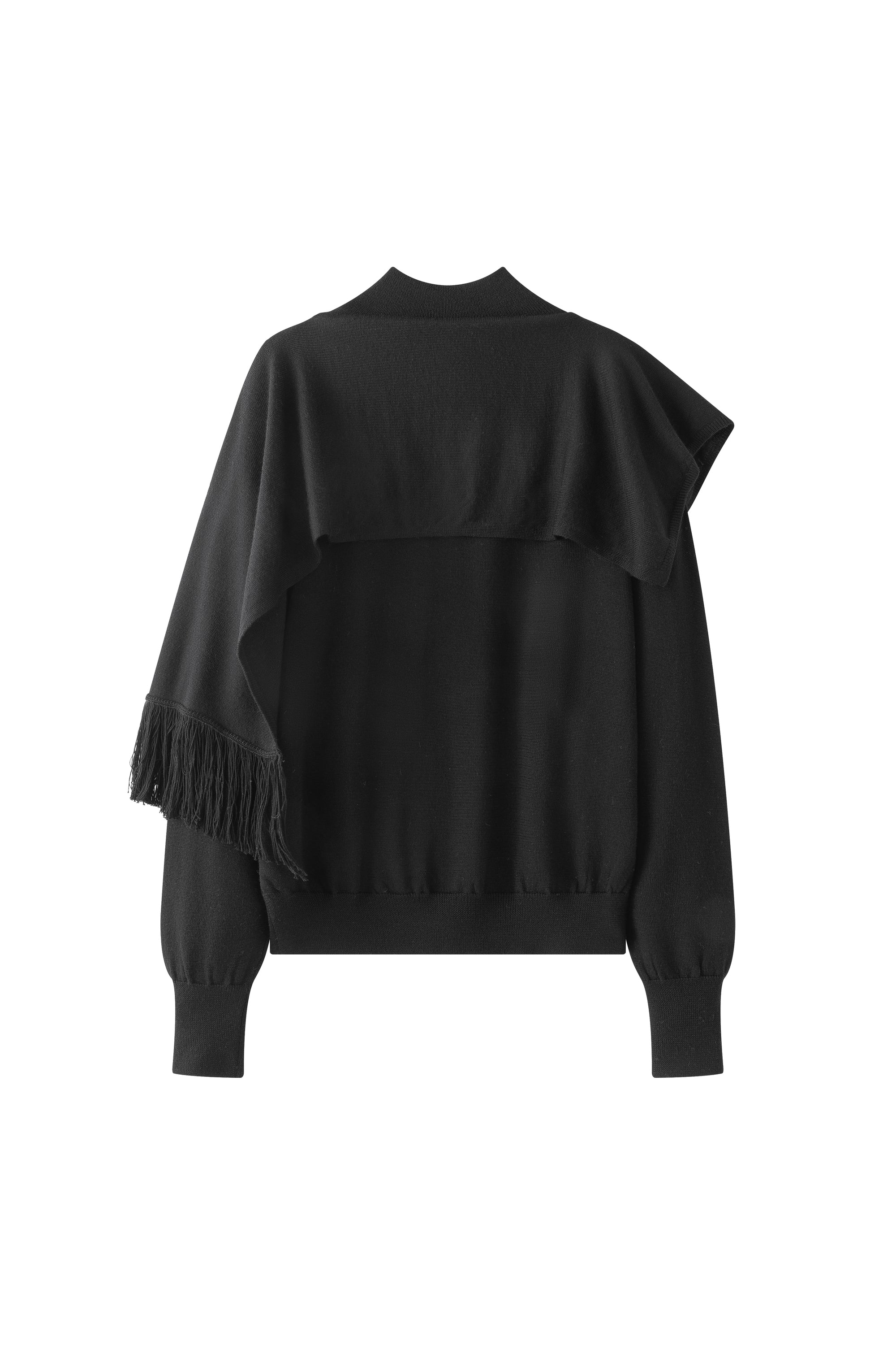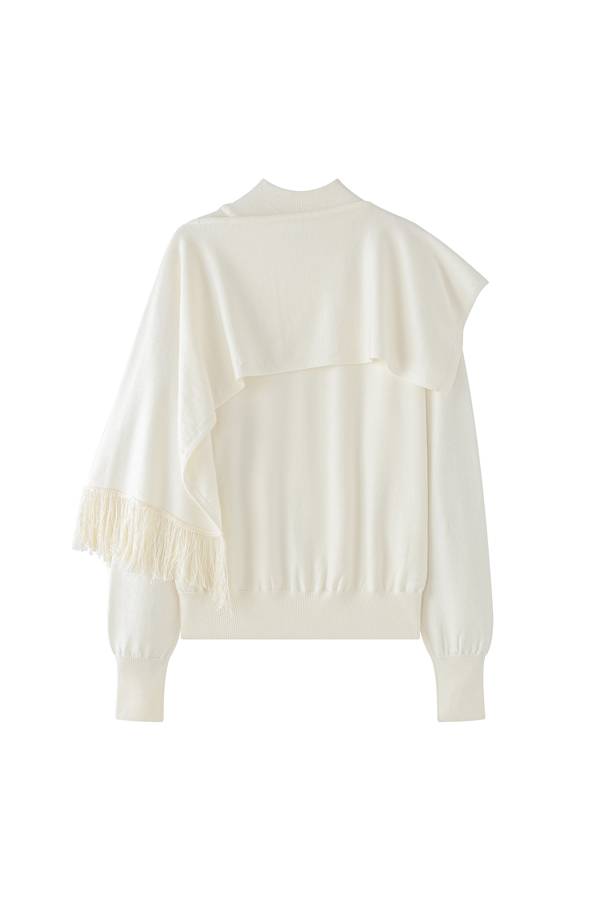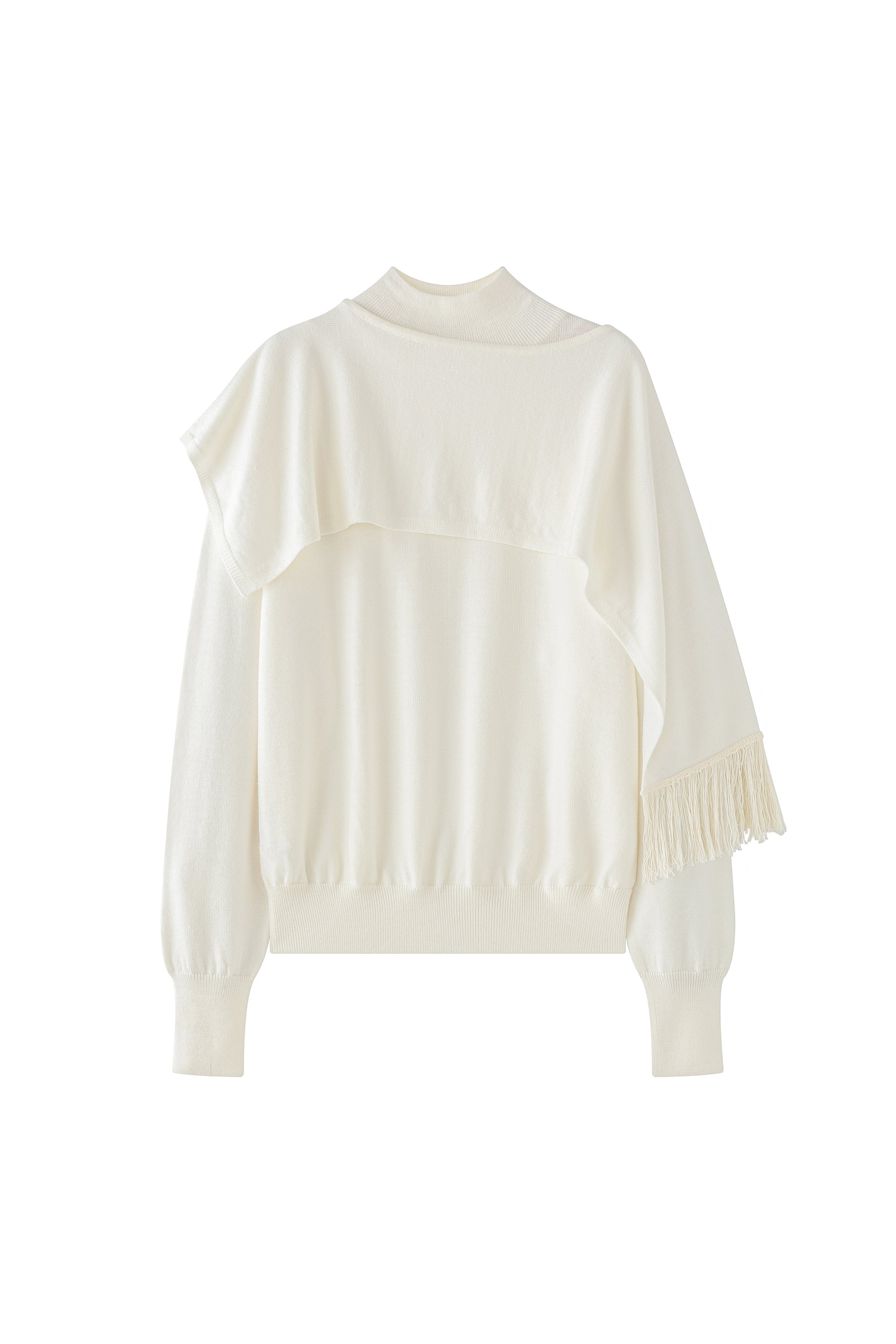 Soft 100% wool knit turtleneck featuring an attached scarf that drapes horizontally like a poncho. The scarf ends in playful tassels, adding movement and texture to the silhouette