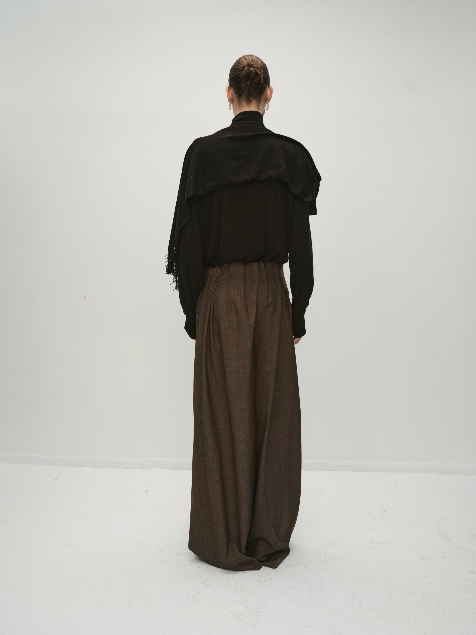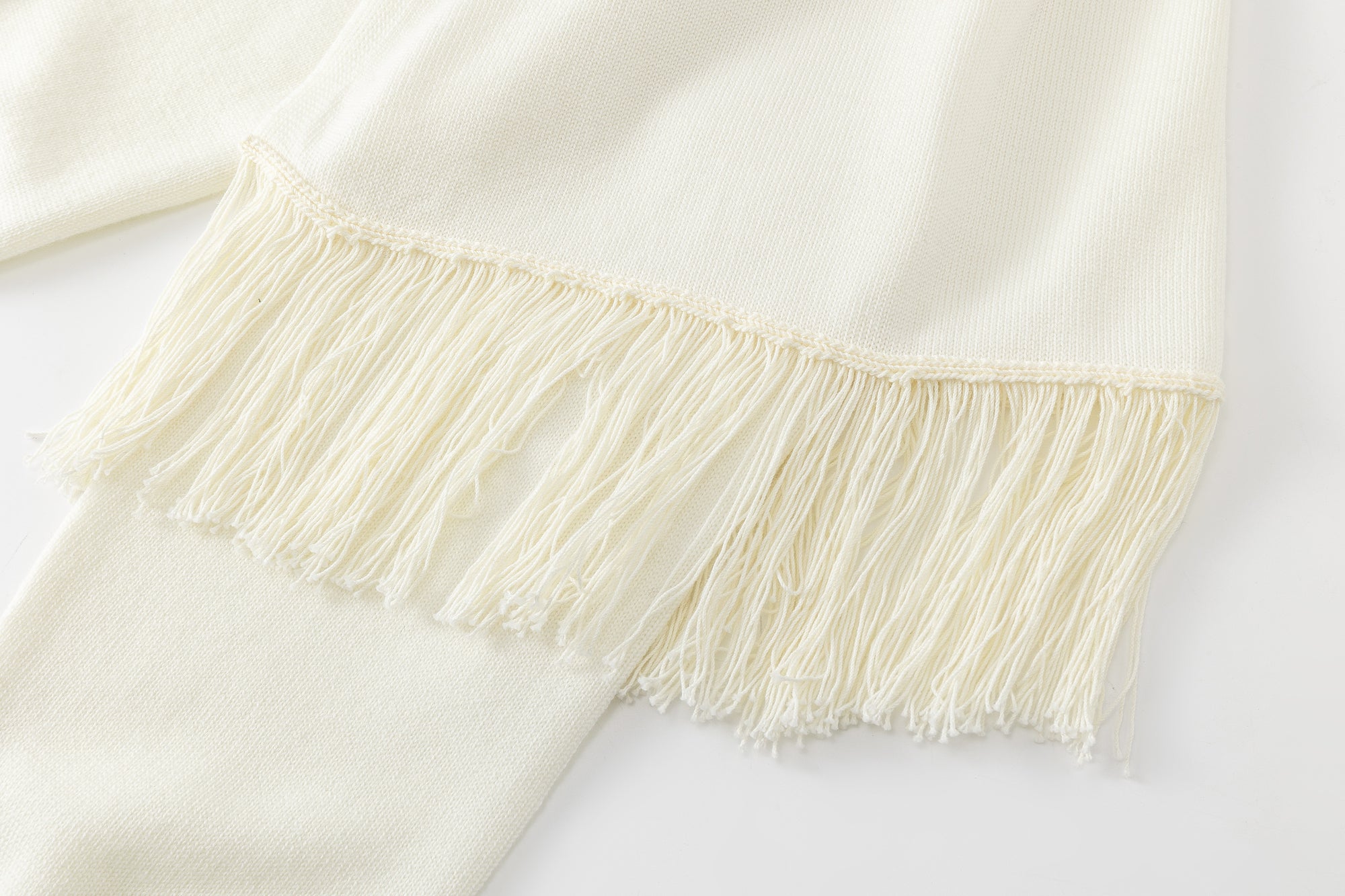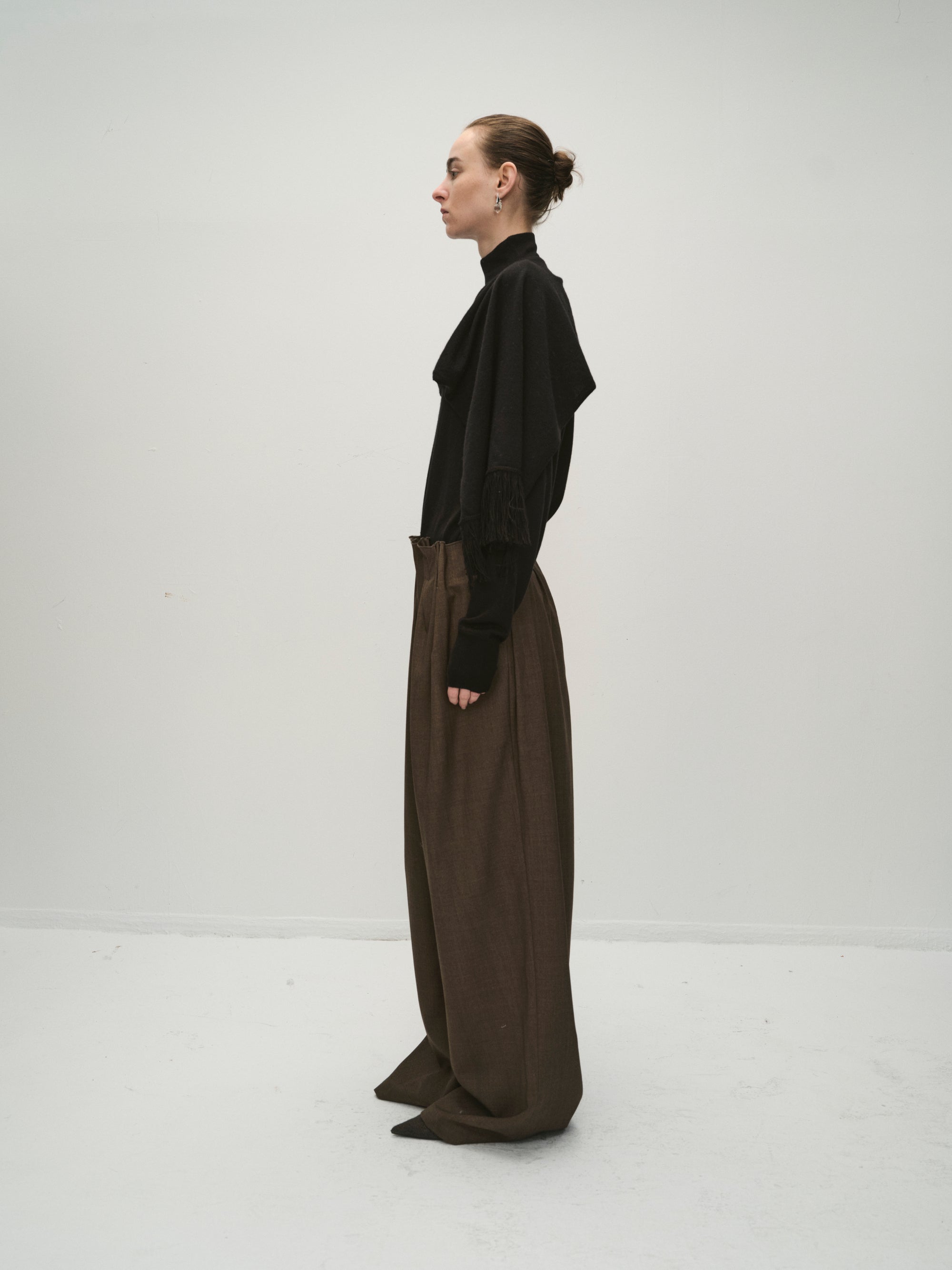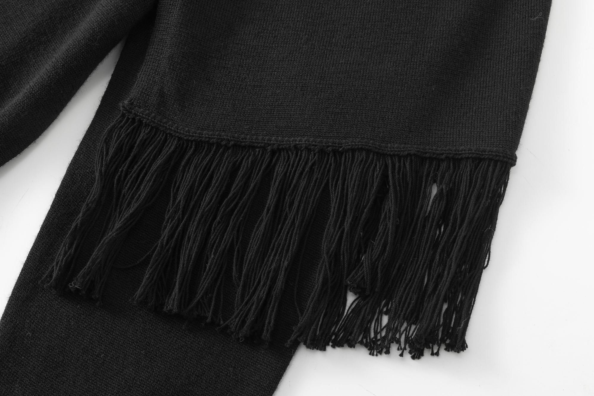 Soft 100% wool knit turtleneck featuring an attached scarf that drapes horizontally like a poncho. The scarf ends in playful tassels, adding movement and texture to the silhouette