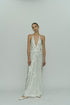 Deep V neck sequin gown with constructed details in the front and open back. Great for all body types and the V neck wont be too deep. The sequins are made in transparent color with glas...