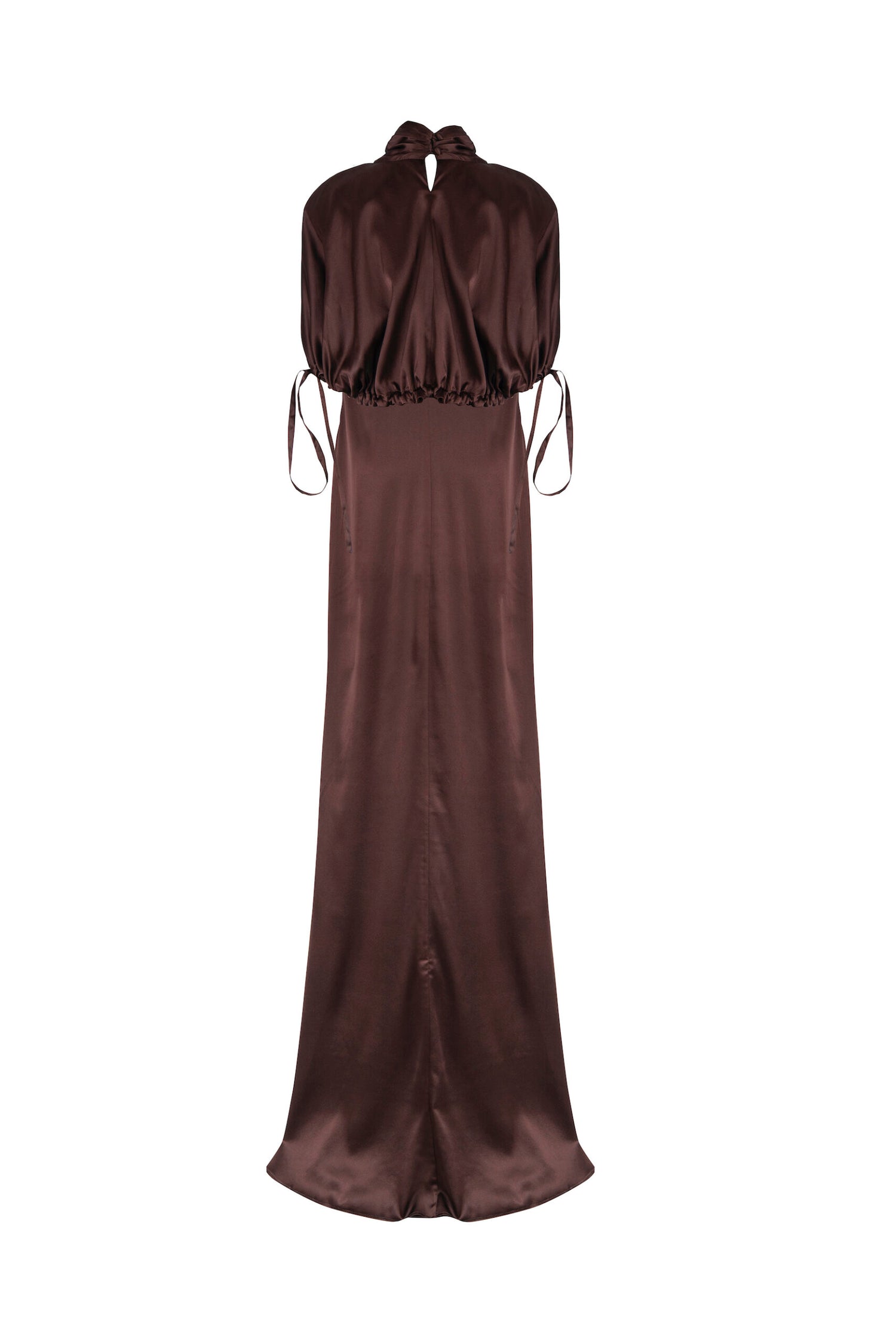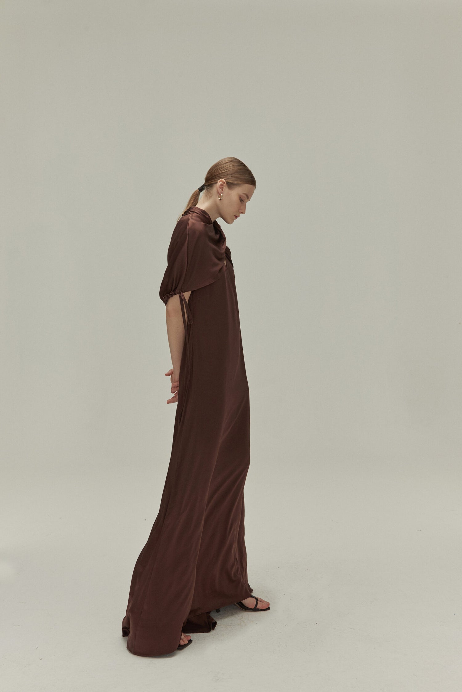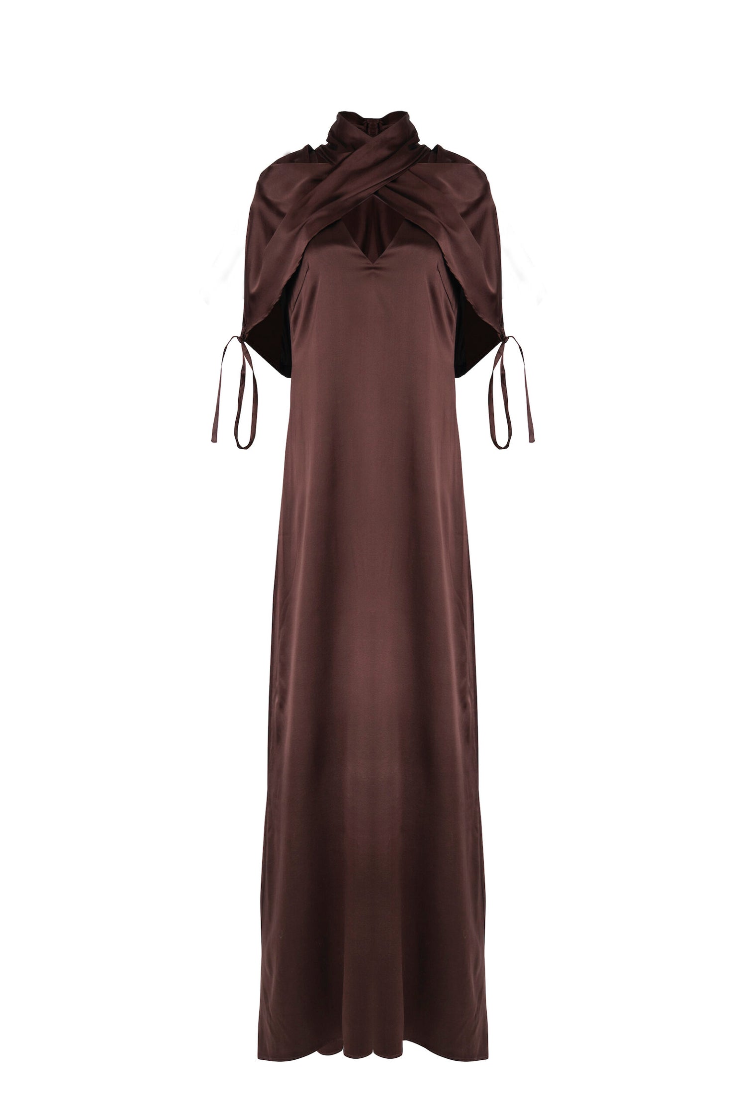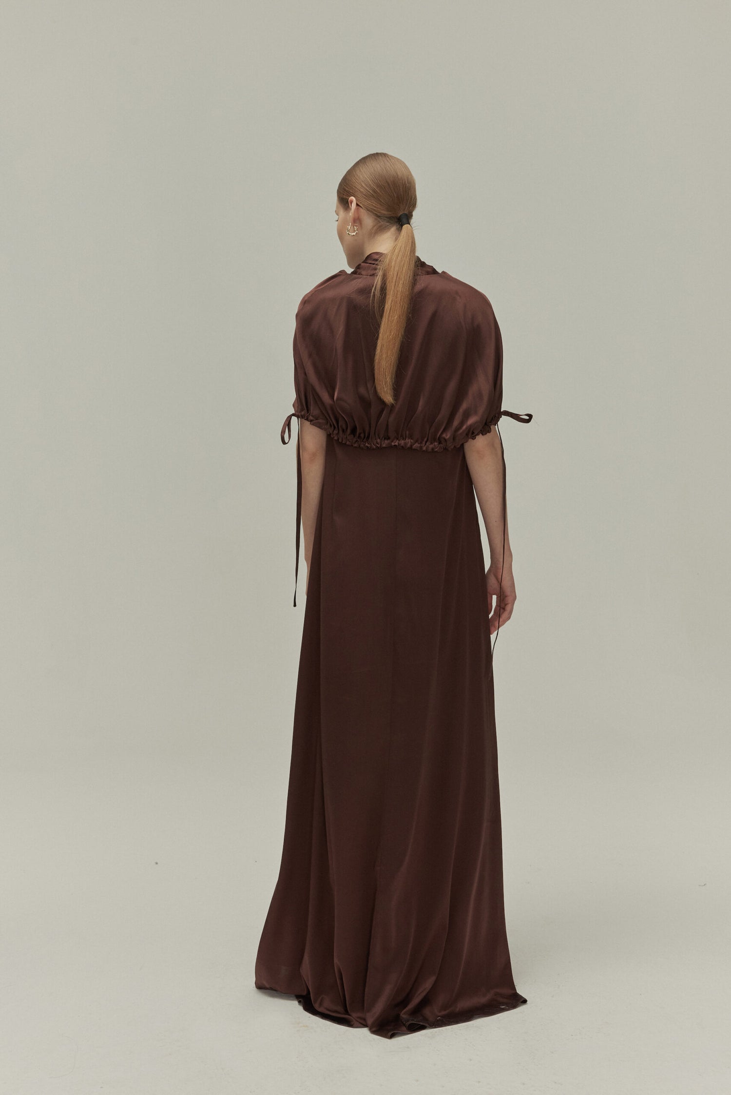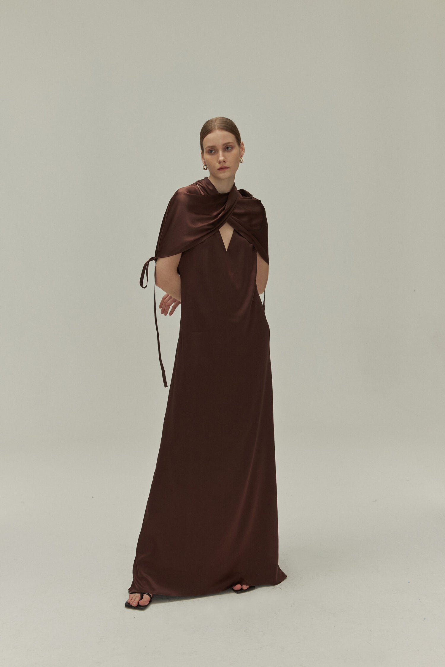 modern Silk gown with gahtered overlaped cape lookalike. The fit is straigth and A-lined, to create a minimal and classic look. Deep V-neck in the front but will be subtly covered by th...