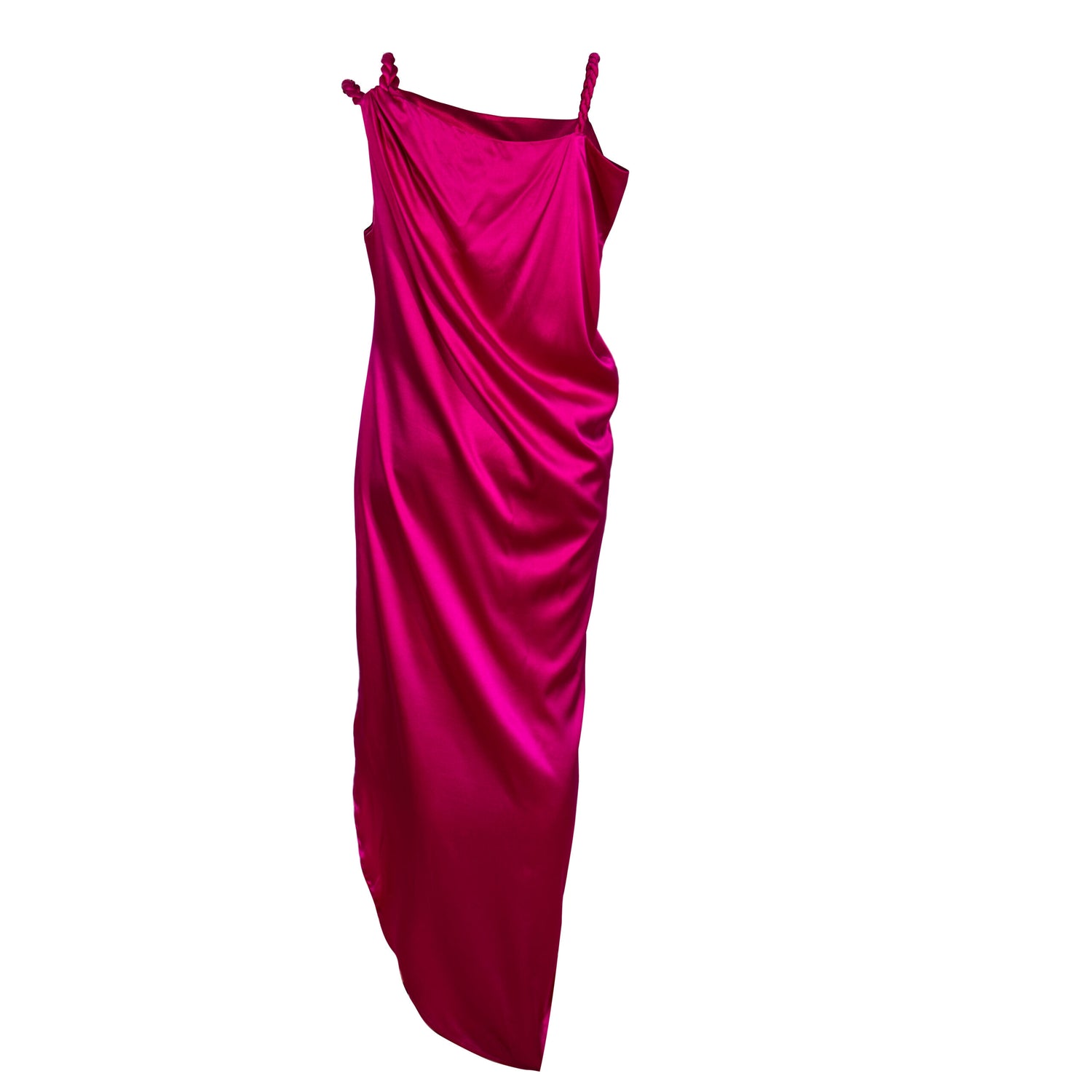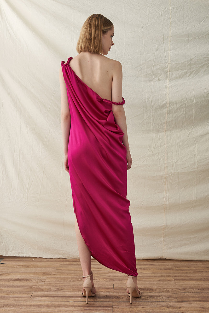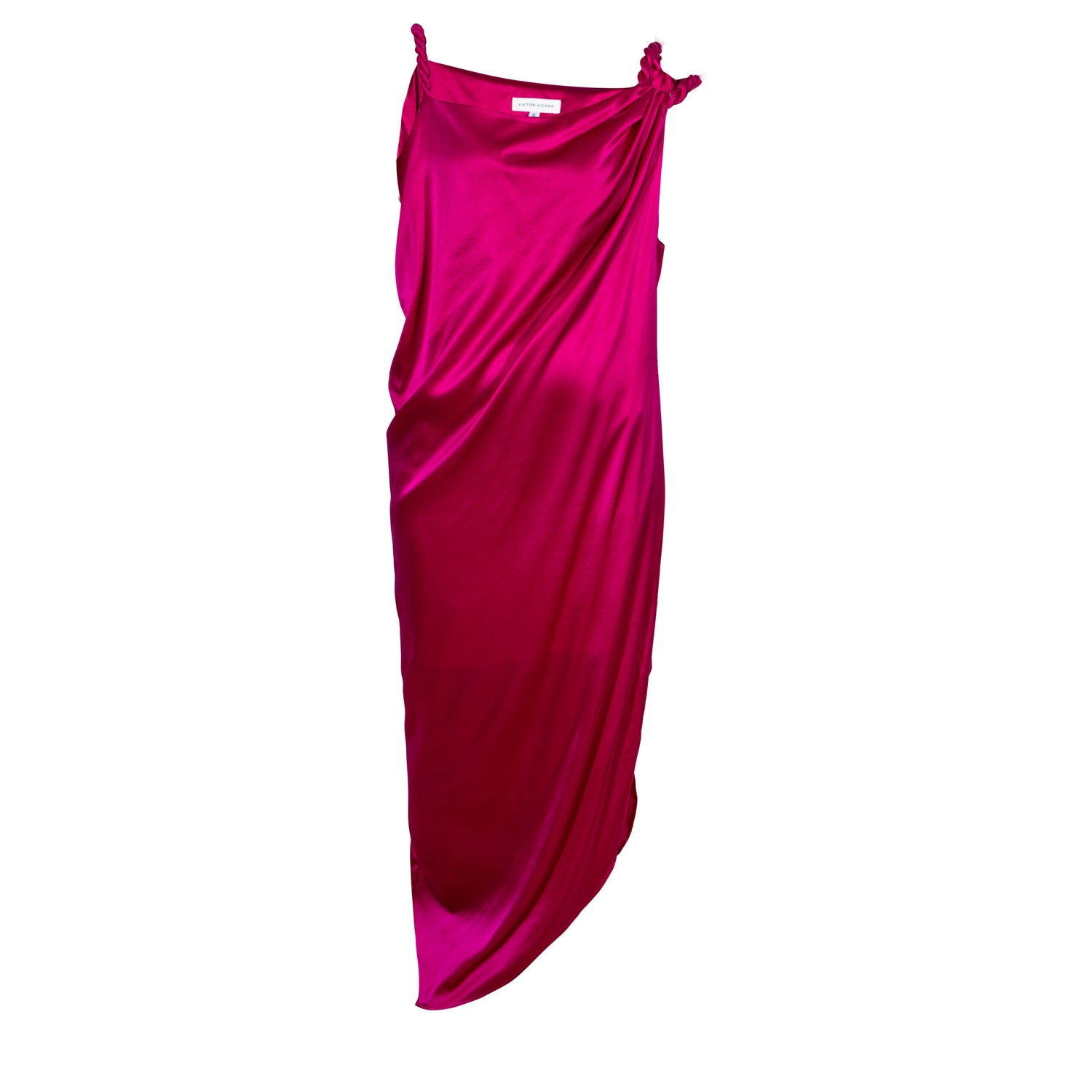 A beautiful evening silk dress with a twisted knot element on the shoulder part, the sloping tailoring cut create draping waves on the silk fabric. It also c...