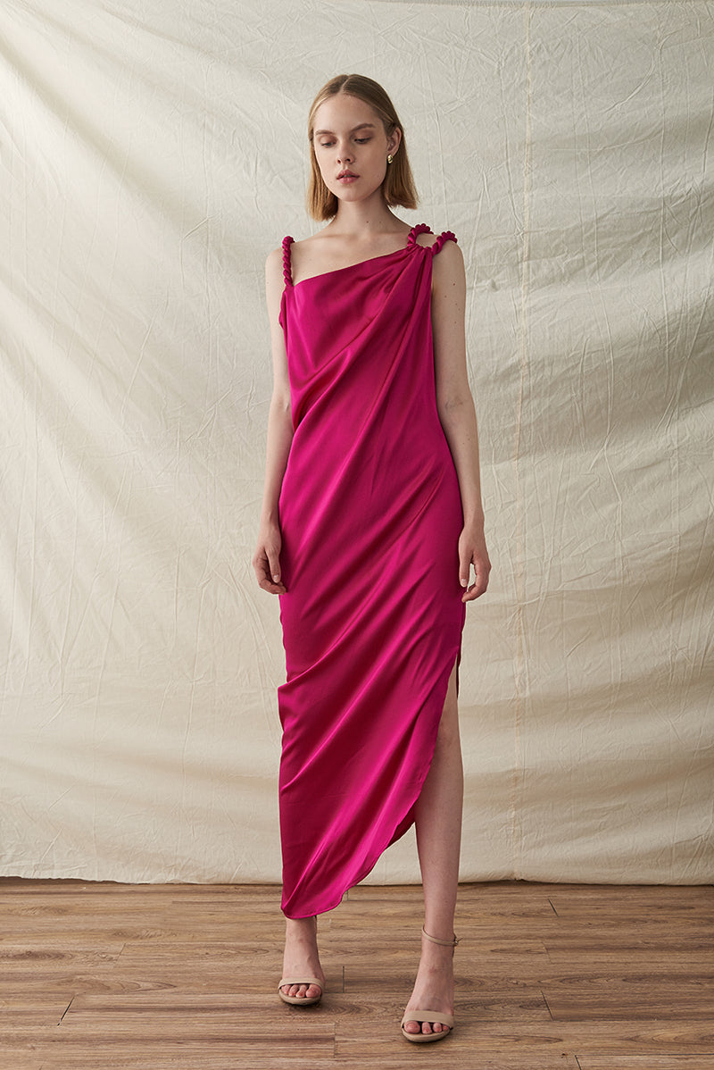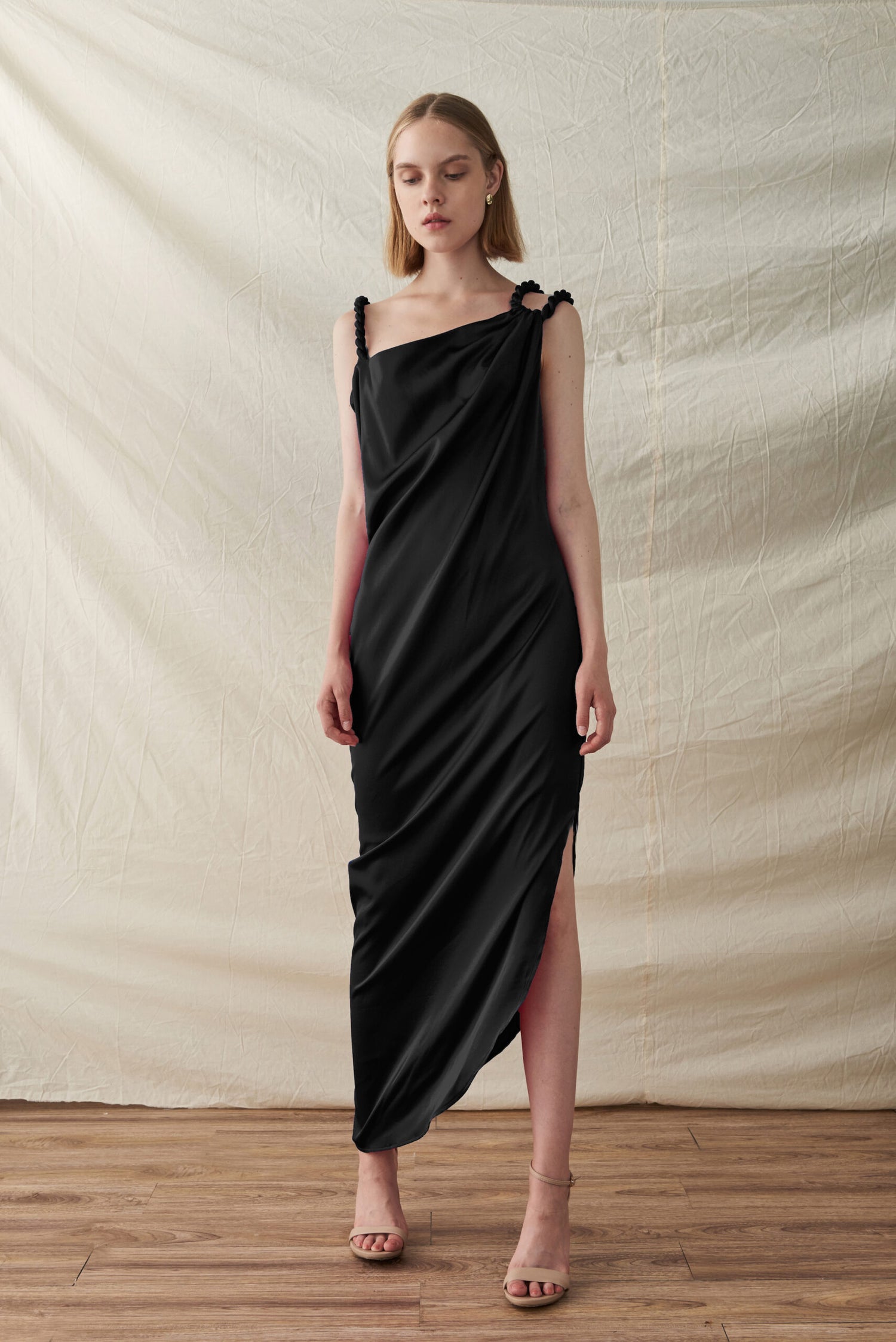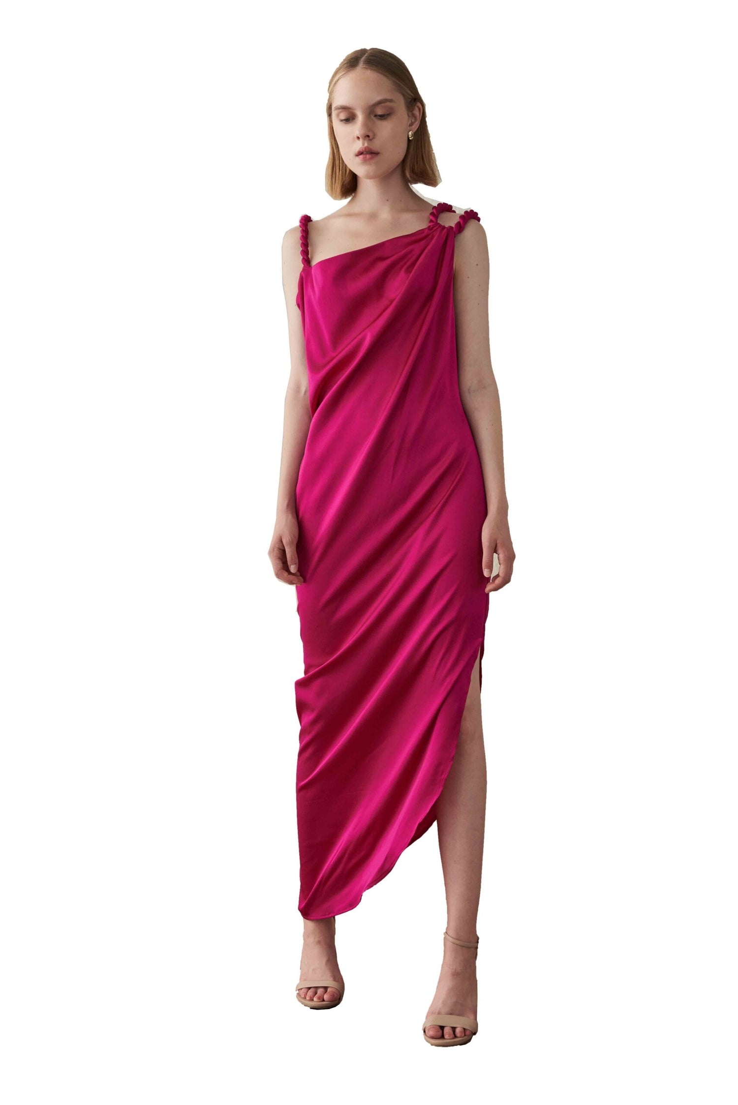 A beautiful evening silk dress with a twisted knot element on the shoulder part, the sloping tailoring cut create draping waves on the silk fabric. It also c...