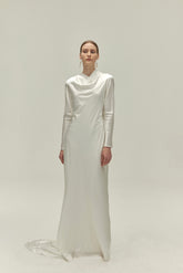 Modern and sleek wedding dress in 19mm doubled layer stretch silk. Slimming effect with a cut that follows the body. The neckline has a draping effect that stretches over the shoulders t...