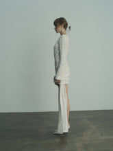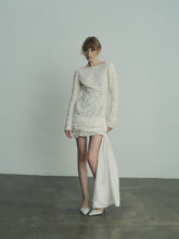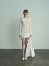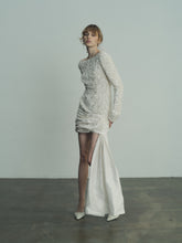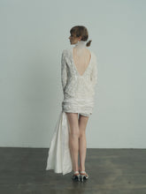 A striking dress featuring a sequined bodice paired with a short, ruched silk taffeta skirt. The asymmetrical draping and long side train create a modern, chic look with a mix of texture...