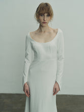 Featuring a classic scoop neckline, fitted bodice, and elegant long sleeves, this dress gracefully flatters the silhouette. Cut out sleeve cuffs decorated with buttons in the back. The s...