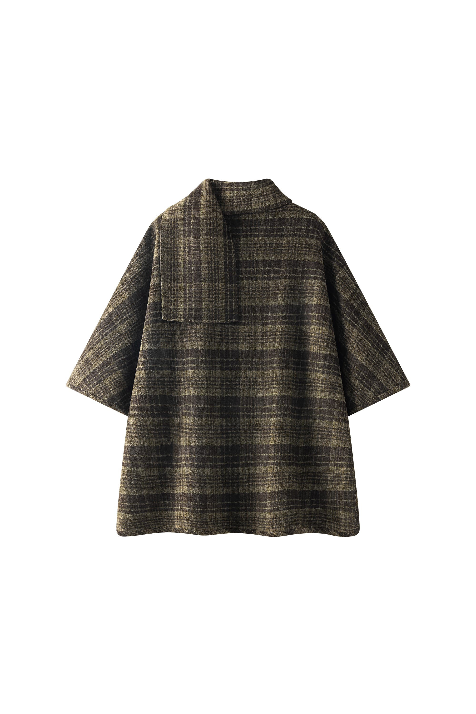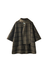 Checked cape with scarf and buttons on the side to be closed or open. Trimmed edges