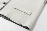 Waffled thin jacket with trimmed black edges. Leather braided buttons and oversized sleeves. Mid length and falls on the bottom. Rounded neckline and two pockets on each side. Since the ...