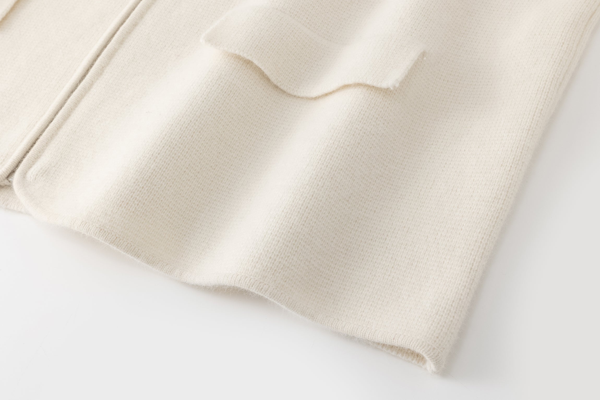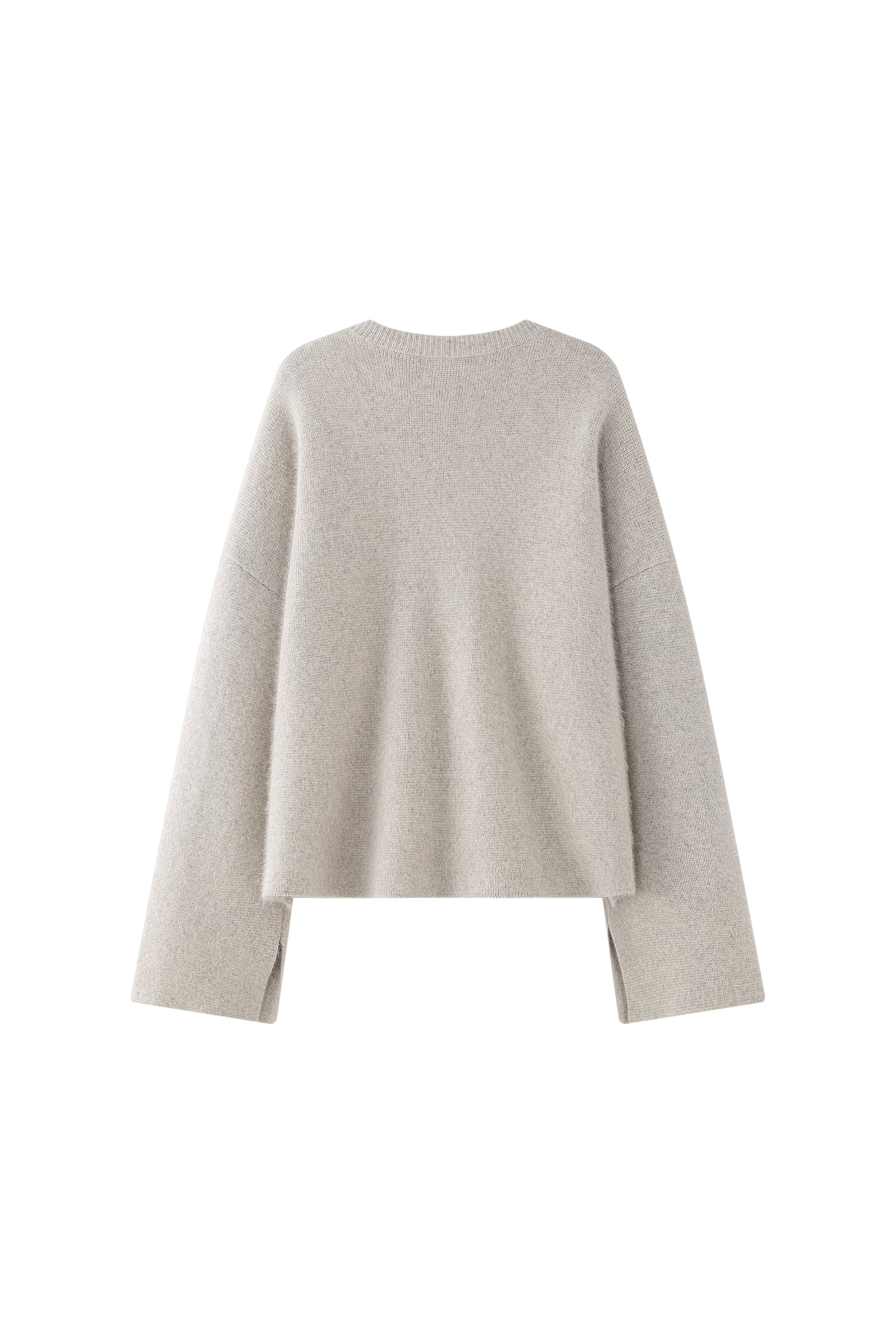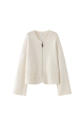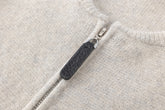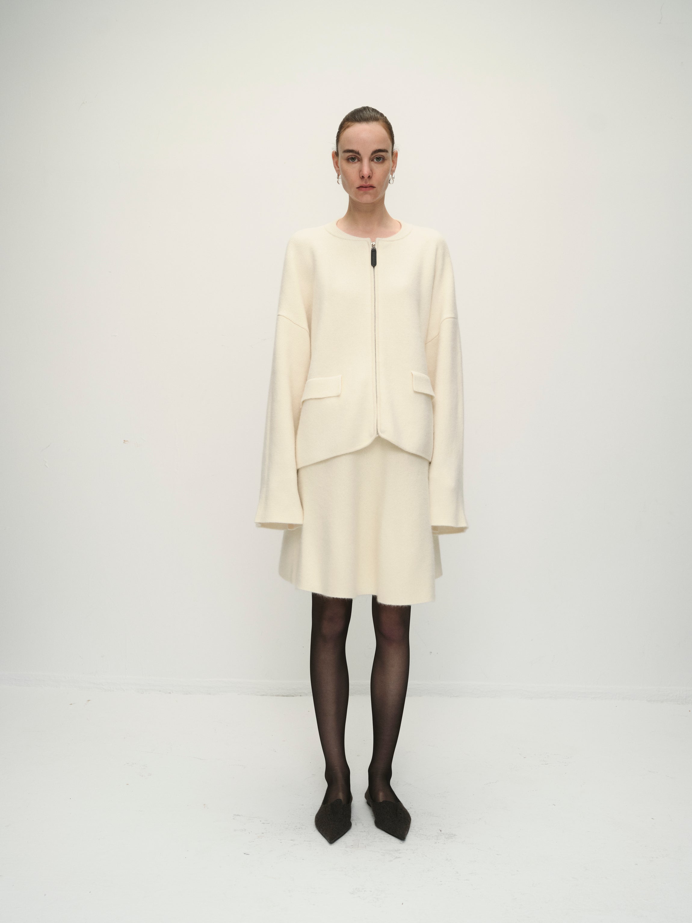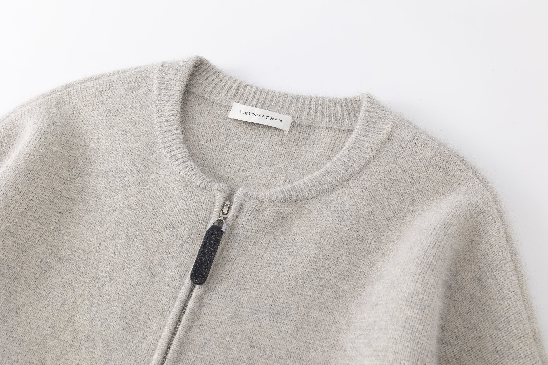 Cardigan with zipper and leather zipper. Wide sleeves with slit. Dropping shoulders. Thicker in style.